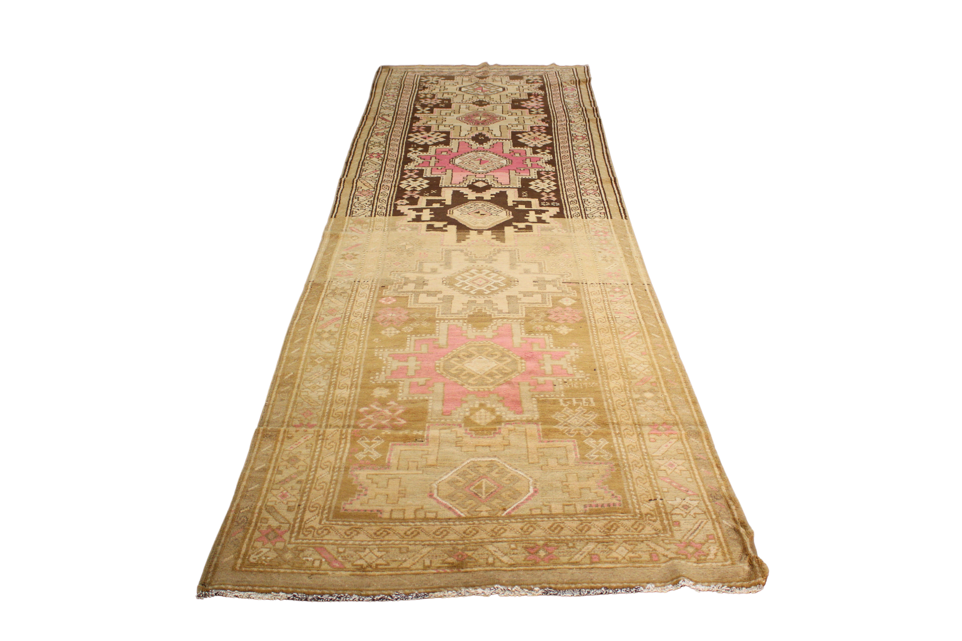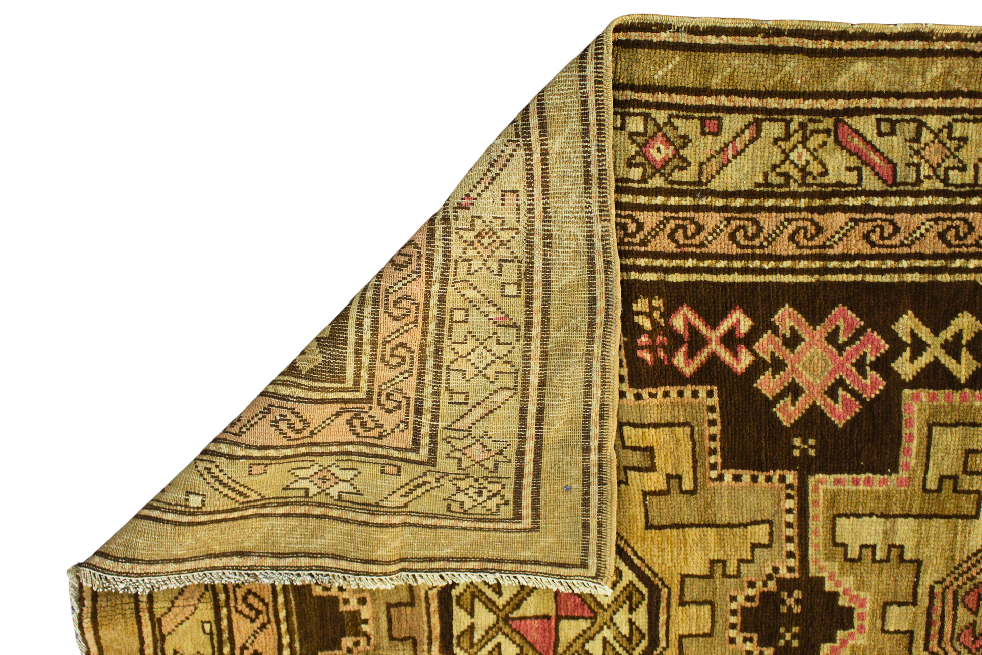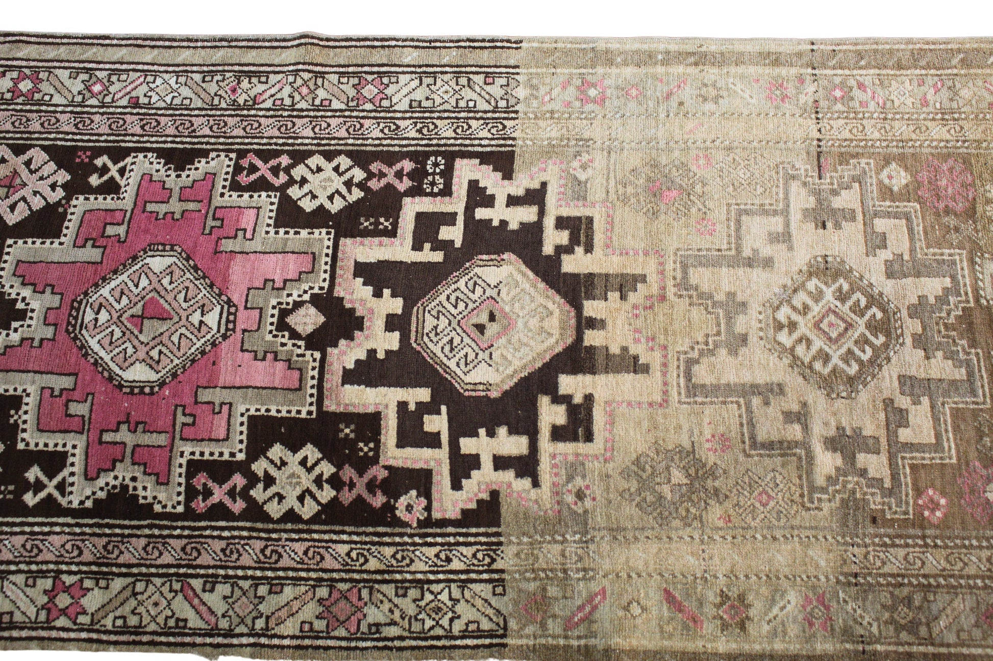 Expressive and robust, this antique Persian Kurdish runner (3.10 × 13.3 ft) is steeped in tribal symbolism and raw beauty. Its field is punctuated by a dynamic sequence of large, latch-hooked medallions in coral, camel, and ivory — set against a dramatic chocolate brown ground that gives the upper section a commanding presence. The lower half has faded into soft golden browns, a testament to time and age, adding a soulful duality to the piece.