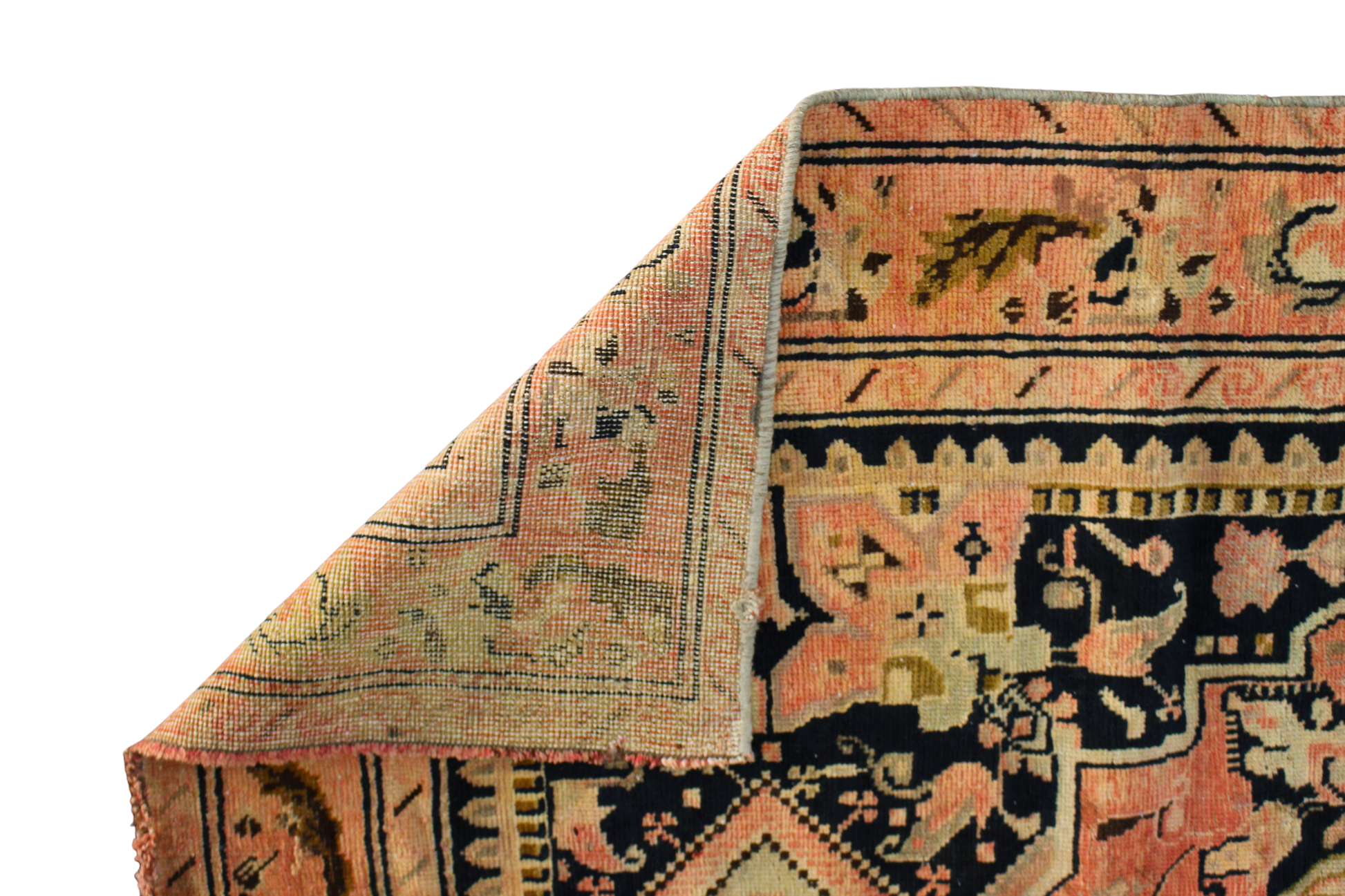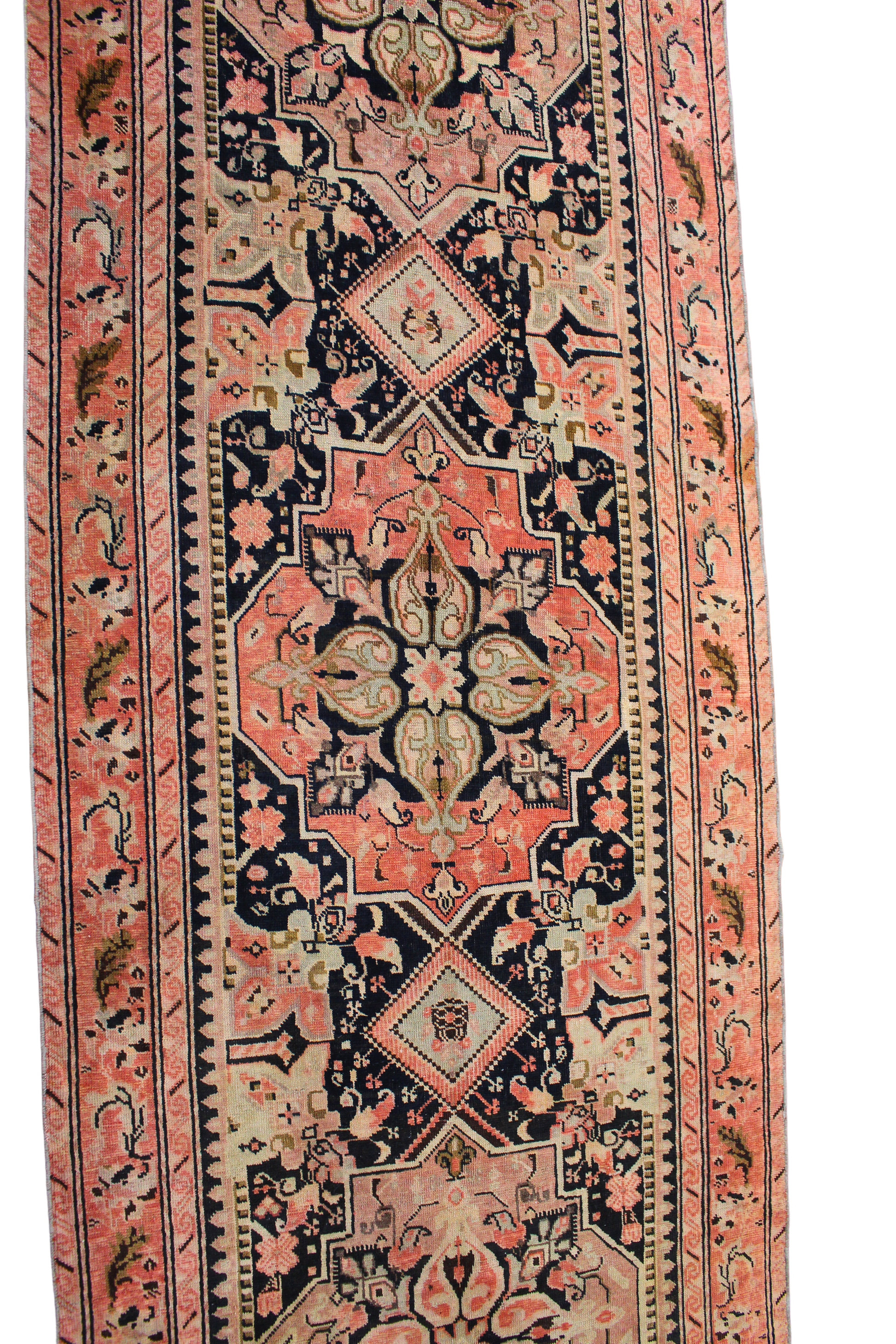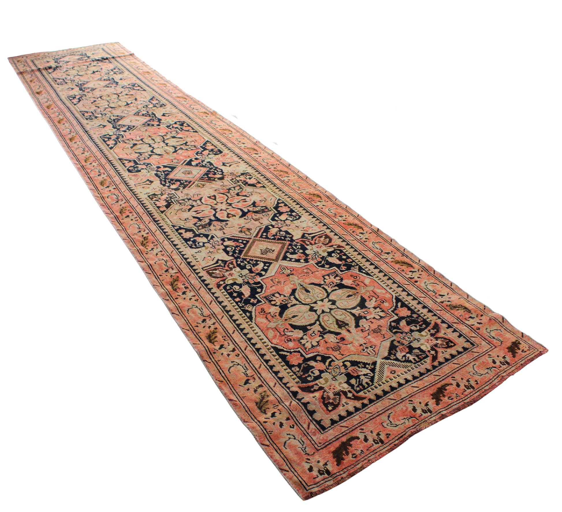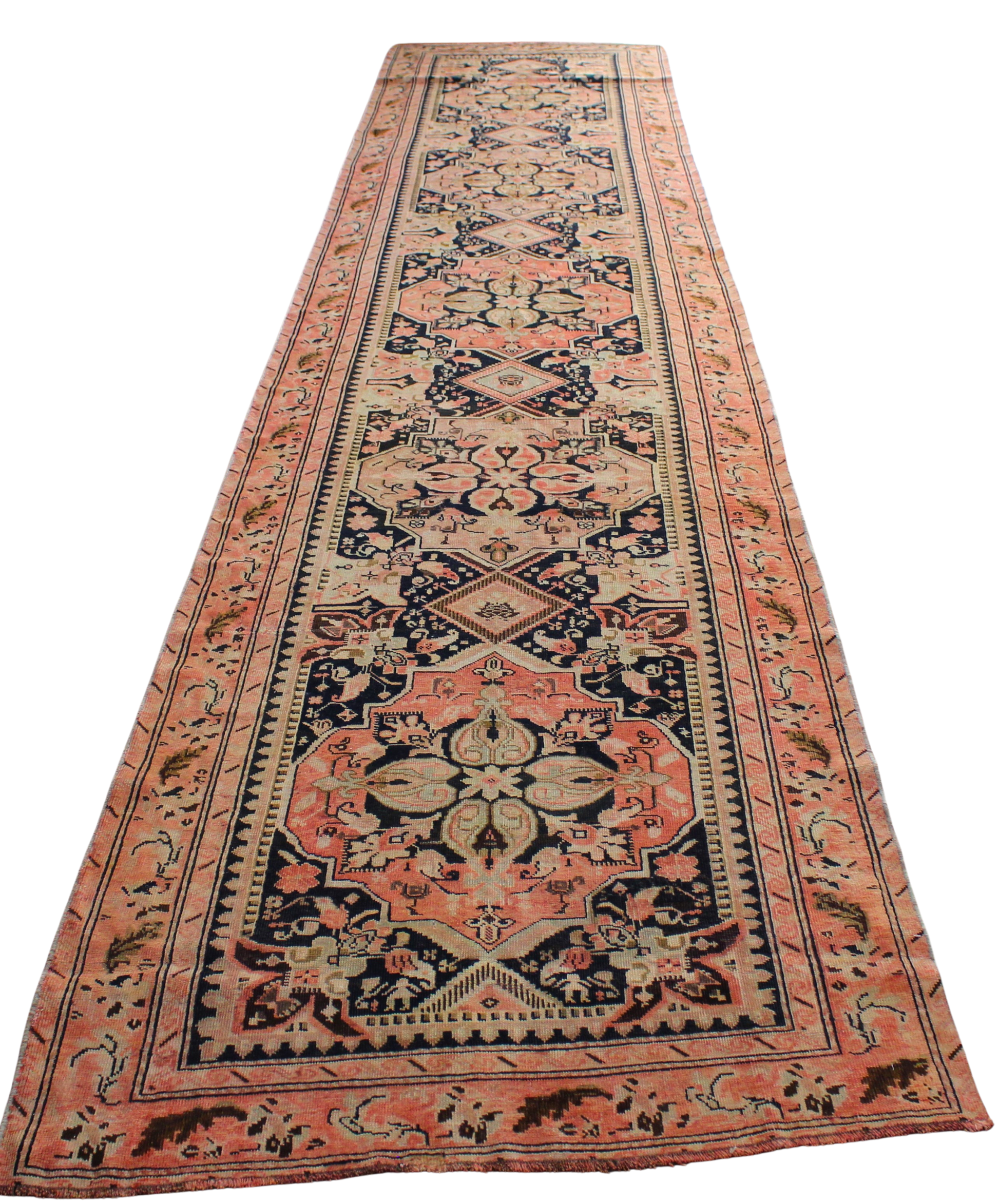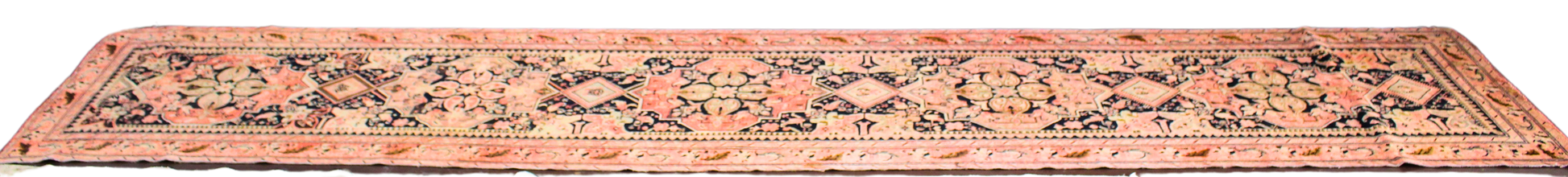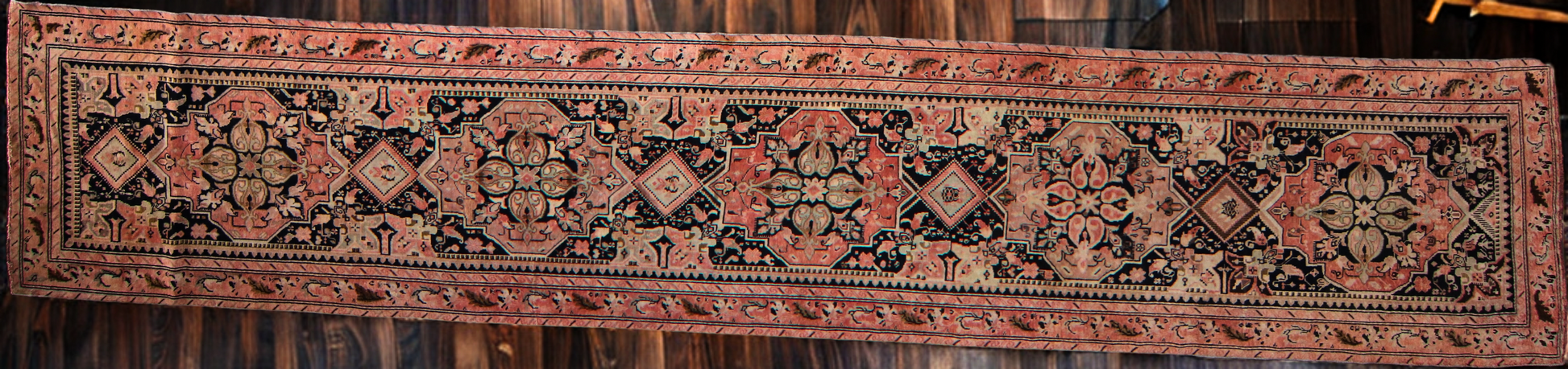 With its noble symmetry and stately palette, this antique Russian runner (3.9 × 18.7 ft) offers a striking fusion of European elegance and Eastern textile tradition. The layout features a grand procession of cartouche-style medallions flanked by diamond rosettes, each set against a midnight ground that anchors the soft terracotta and rose tones. Delicate vine scrolls and stylized blossoms flow through the main border, imbuing the piece with refined movement and ornate detail.