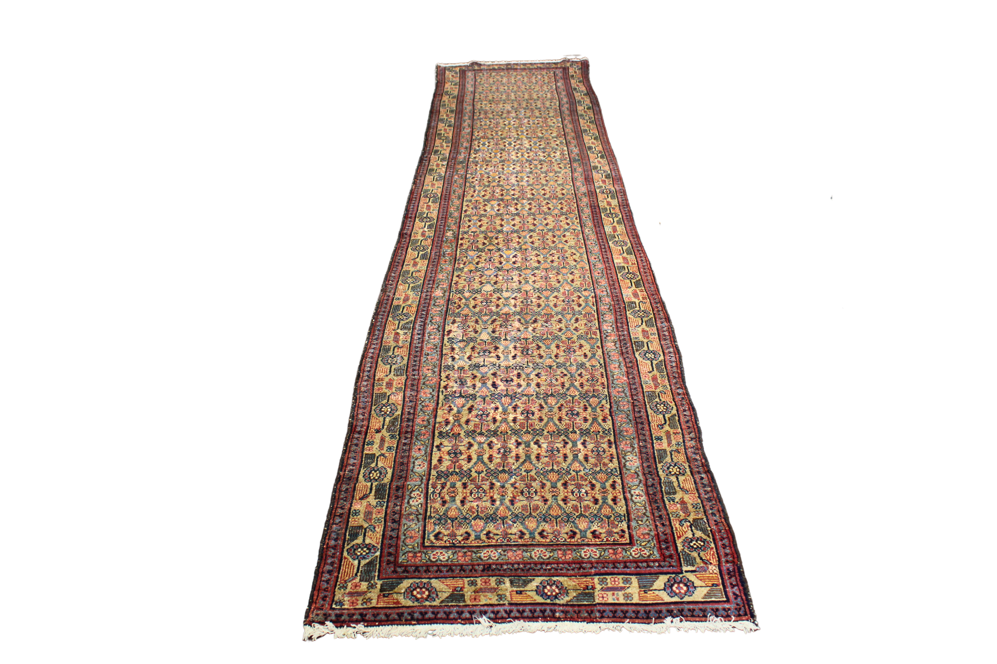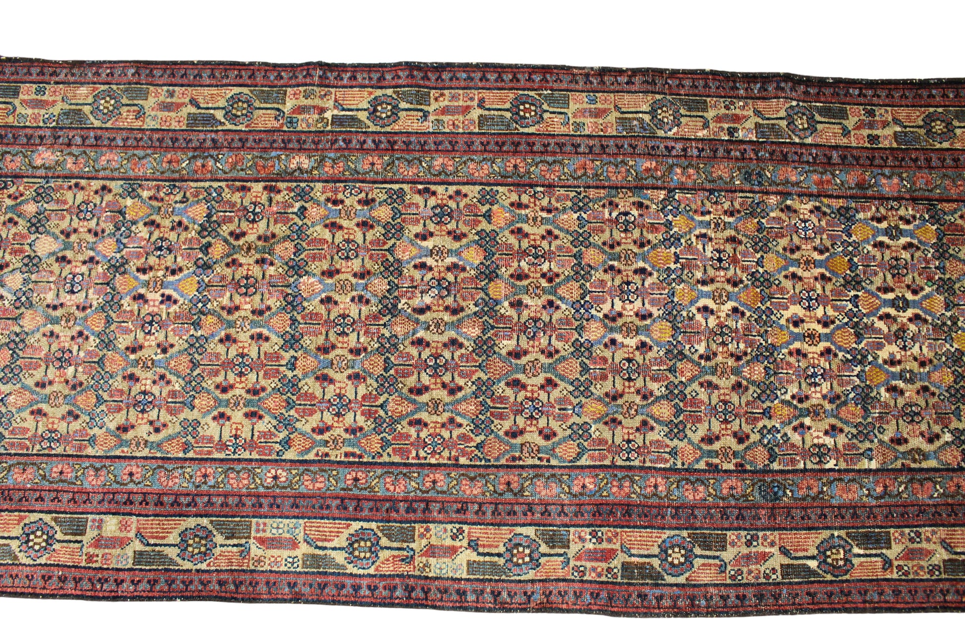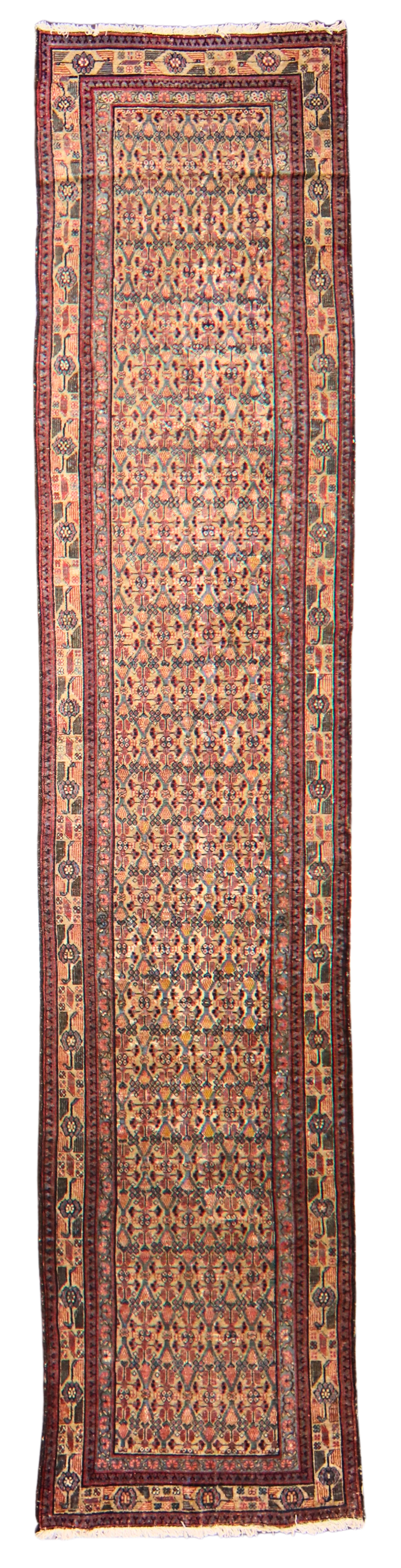 A testament to the refined artistry of Persian village weavers, this antique Malayer runner (3.2 × 15.1 ft) showcases a remarkably balanced all-over design, full of intricate detail and rhythmic symmetry. The field is filled with stylized boteh motifs arranged in a tight lattice pattern — a symbol of life and fertility — alternating with floral elements in tones of rust red, soft indigo, gold, and ivory.