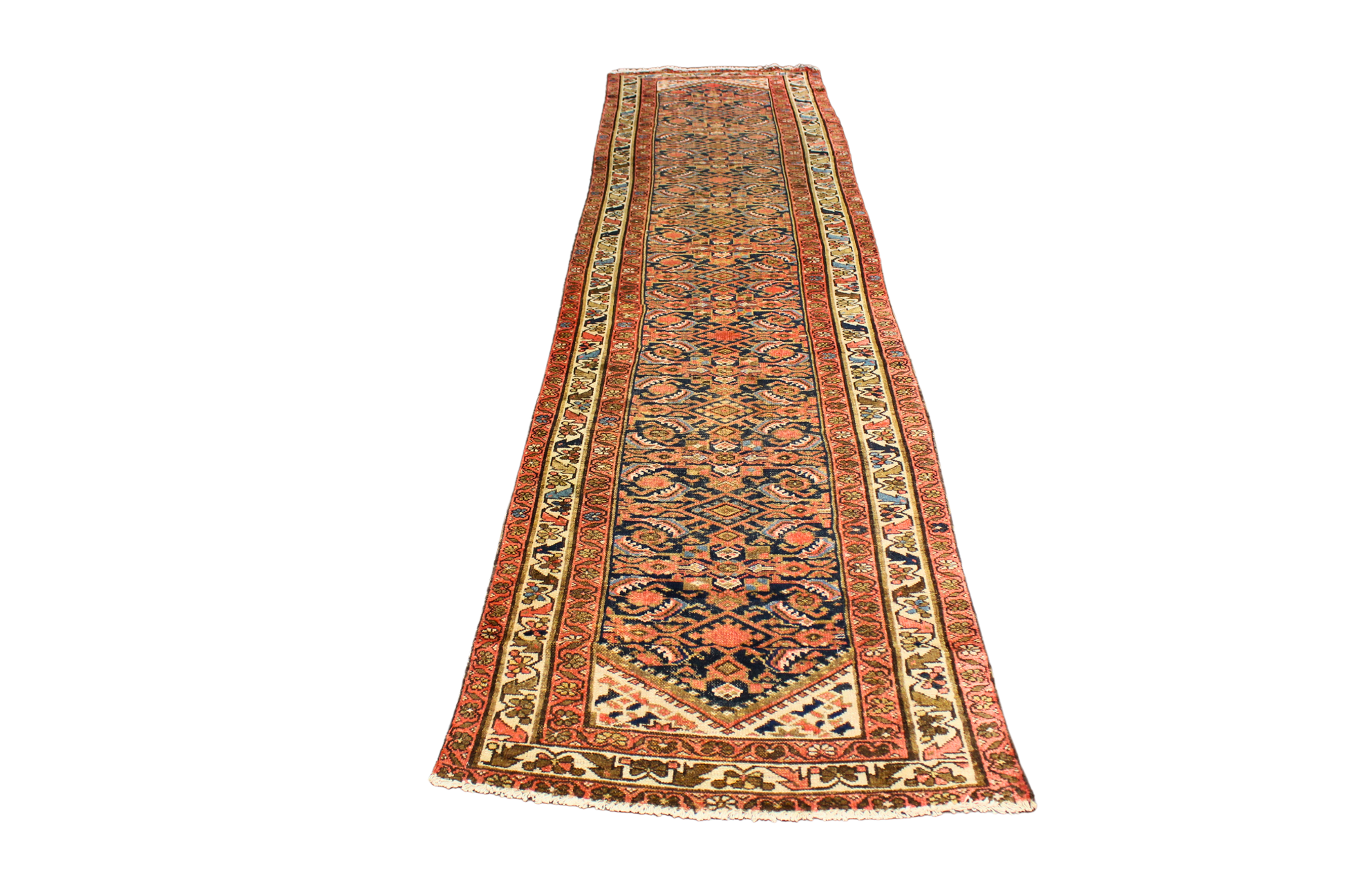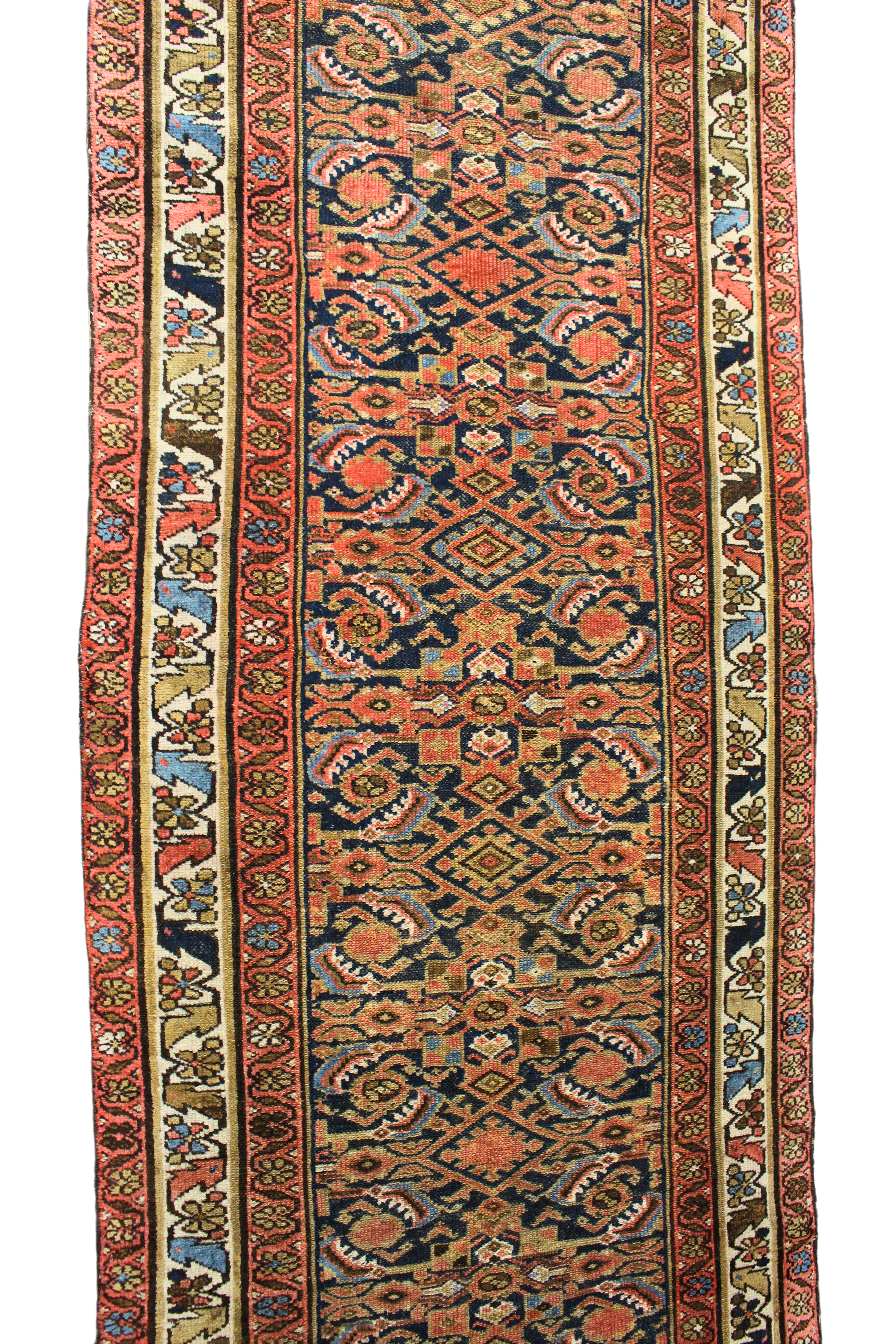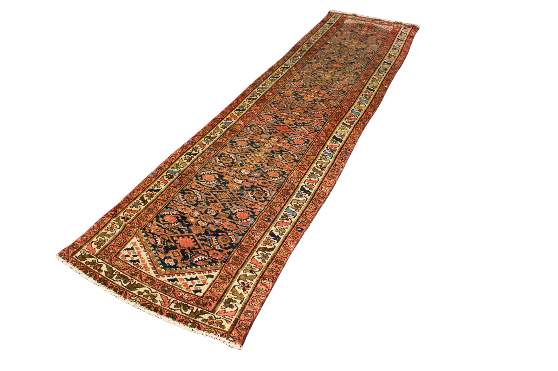 Stretching over thirteen feet in length, this antique Malayer runner from Persia makes a dramatic impression with its elongated form and richly detailed pattern. Woven in a sophisticated palette of earthy reds, midnight blue, camel, and soft ivory, the rug's repeating boteh (paisley) and floral lattice motifs are masterfully arranged within a narrow field that speaks to both tribal roots and refined elegance.