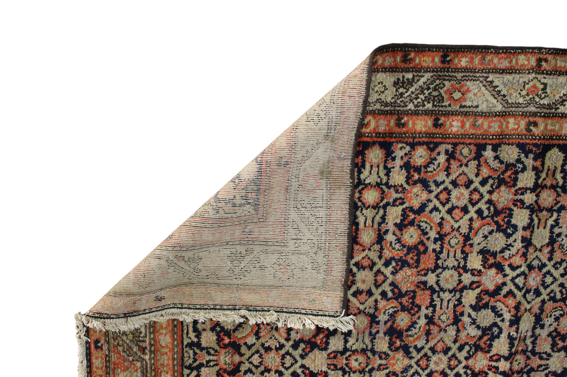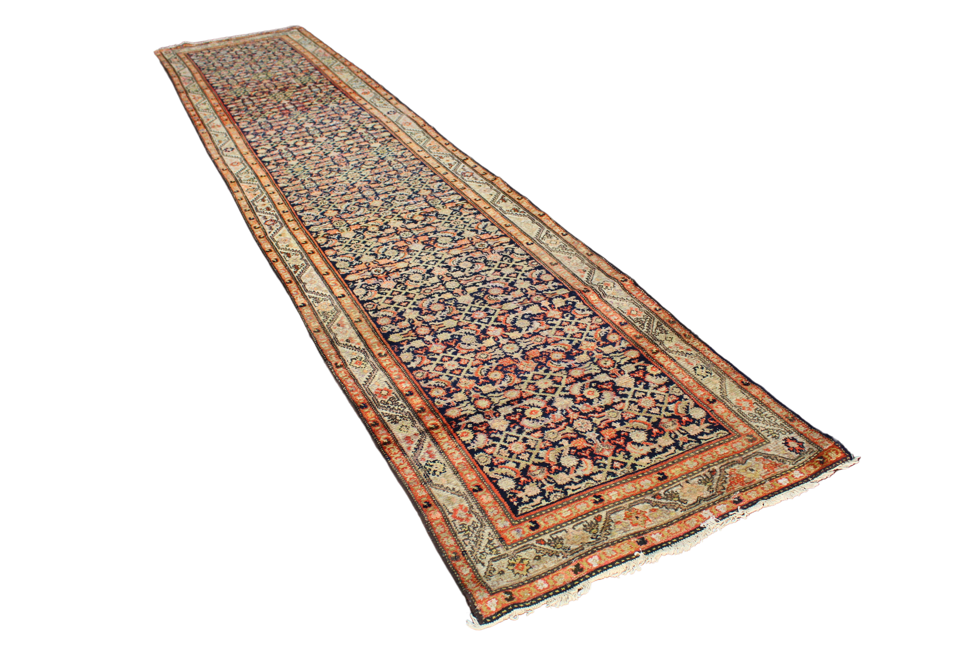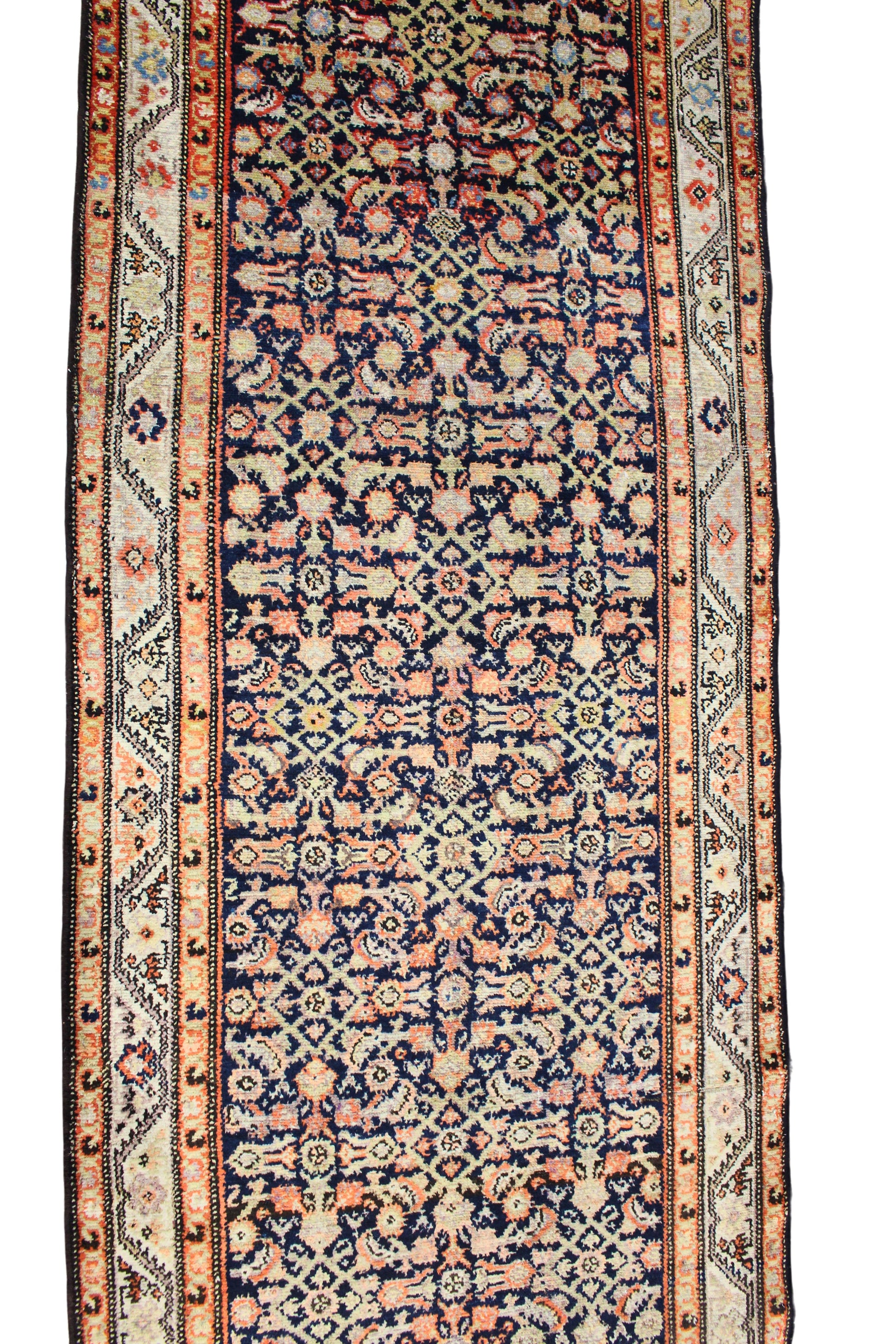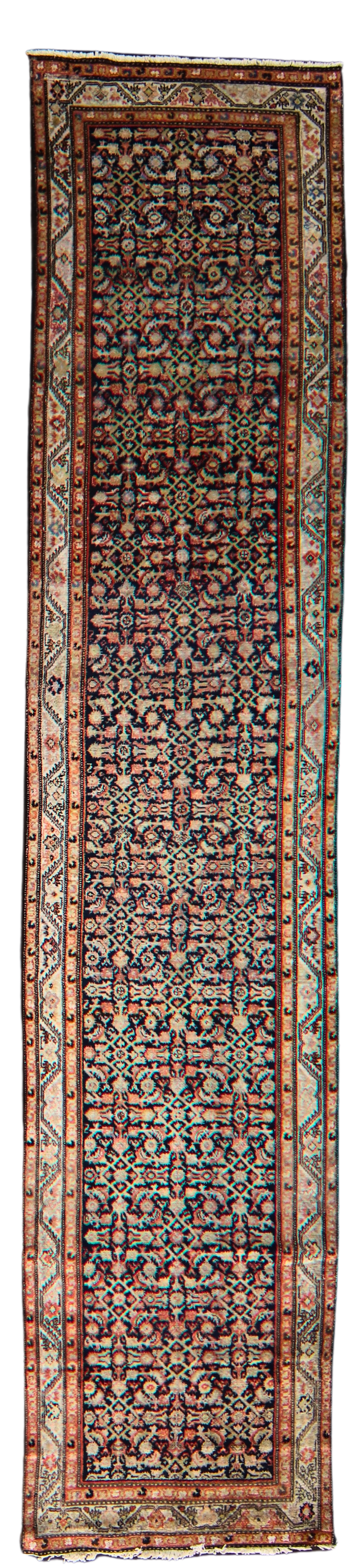 Rich in character and meticulously detailed, this antique Malayer runner (3.6 × 15.11 ft) is a masterclass in Persian village weaving. The design unfolds in a dense lattice of floral and geometric motifs over a deep midnight field, accentuated by rust and ivory vinescroll borders and touches of aqua and coral that give the rug a rare visual rhythm.