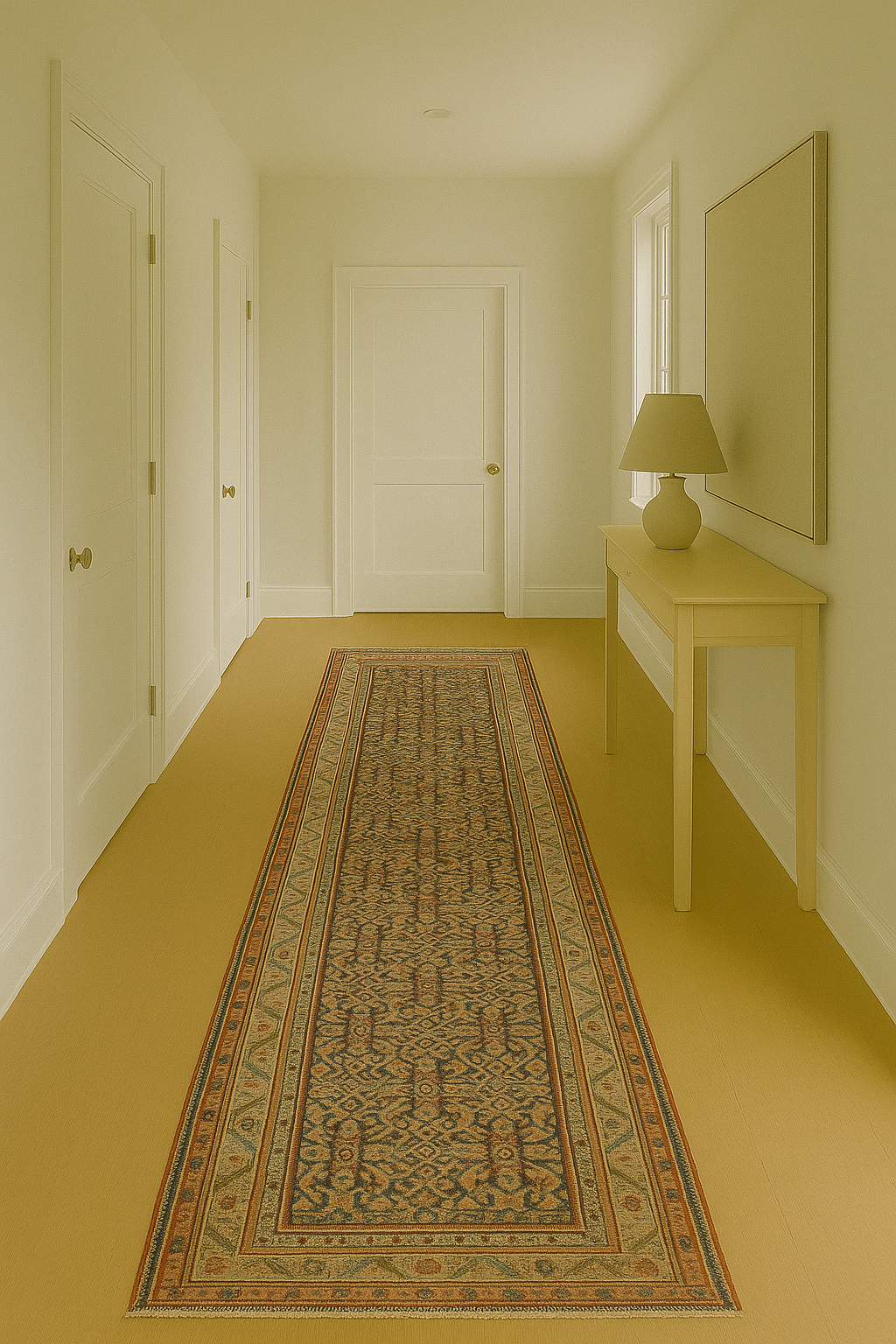 The narrow width and elongated format make it ideal for long corridors, adding both warmth and timeless elegance. The high-knot wool pile retains its age-old glow, while the abrash—natural color variation—adds to its rustic authenticity and heirloom appeal.