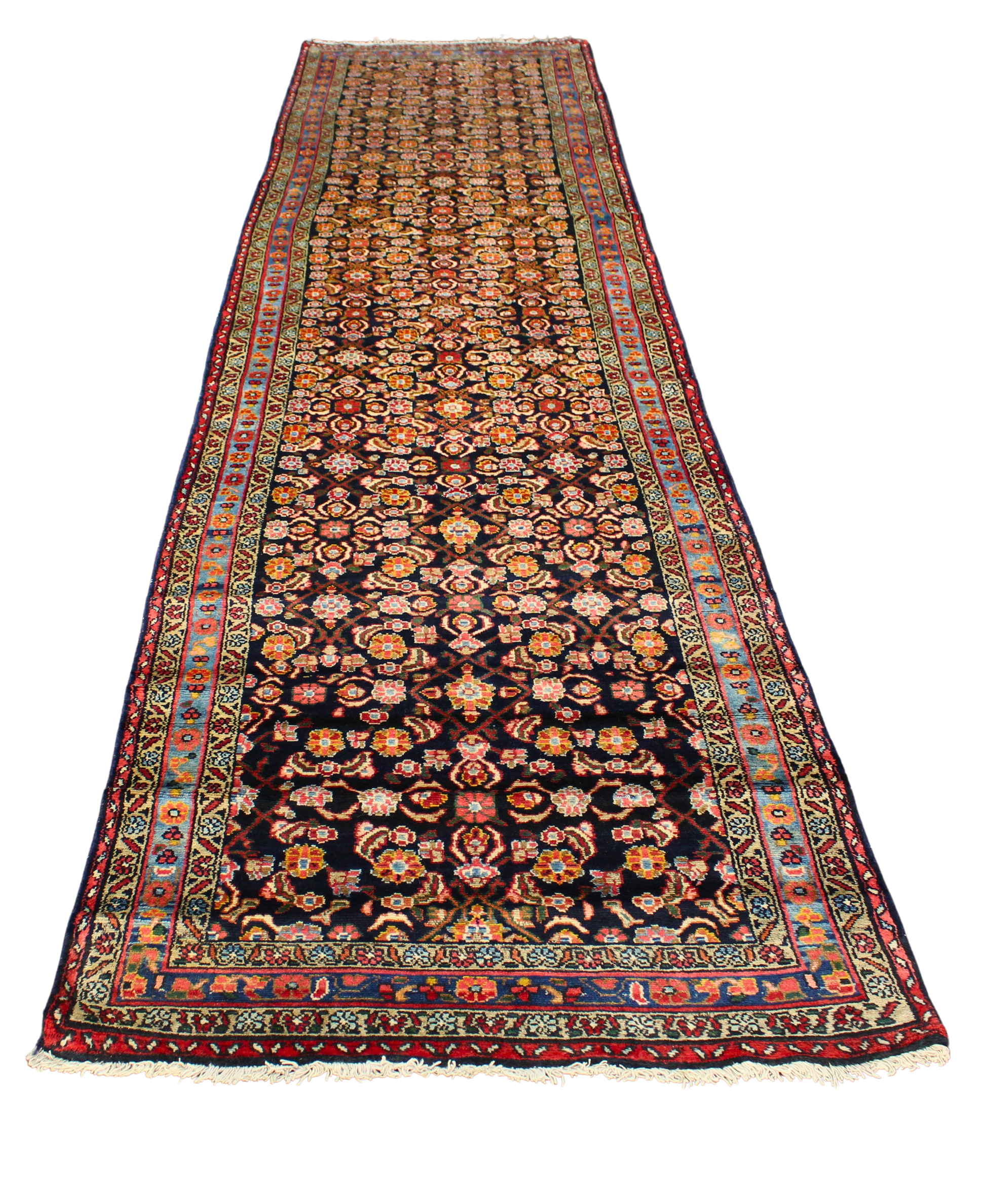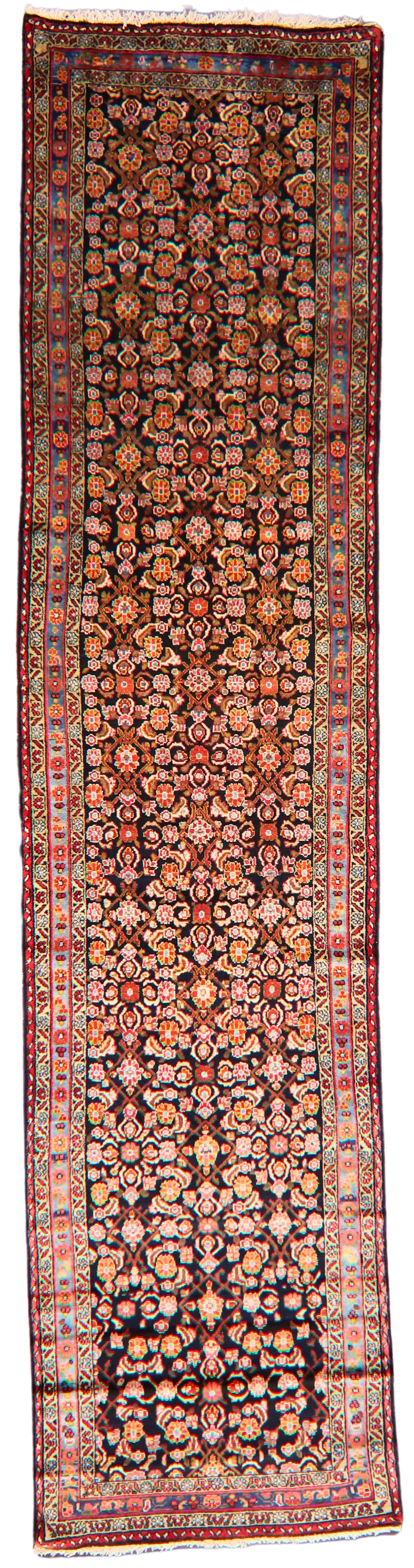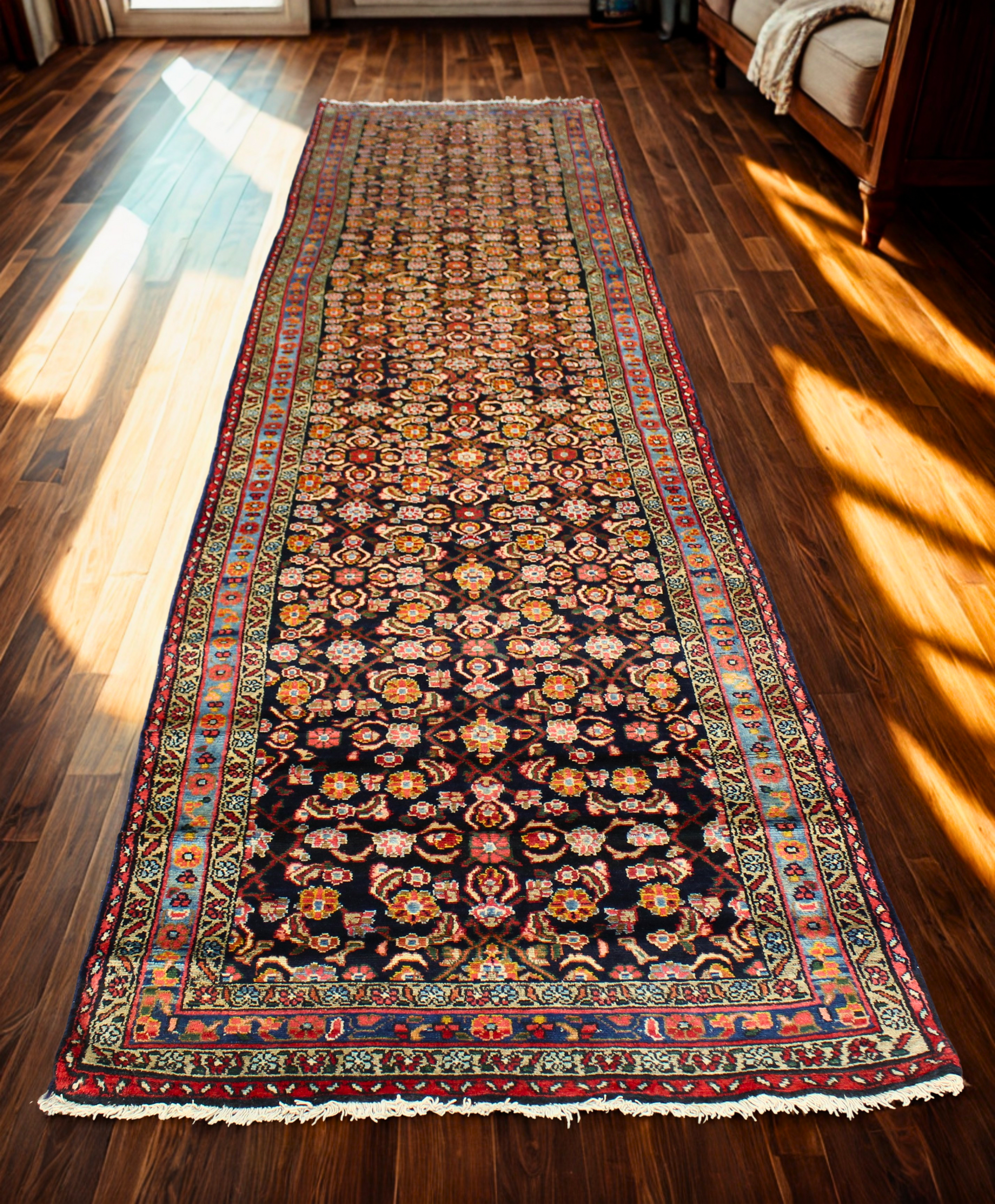 This striking antique Hamedan runner (3.7 × 15.1 ft) is a luminous celebration of color and balance. Set against a deep midnight ground, a profusion of stylized rosettes and floral palmettes bloom in orderly symmetry, flanked by vibrant borders in sky blue, coral, and ivory. The repeating motif is both traditional and lively — a testament to the rhythmic artistry of Persian village weavers.