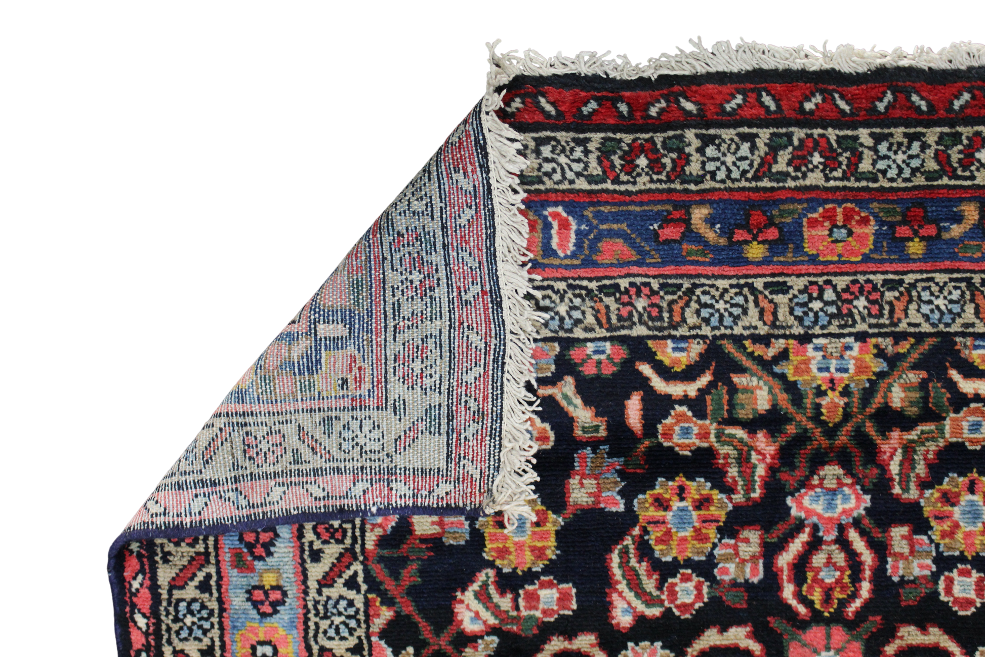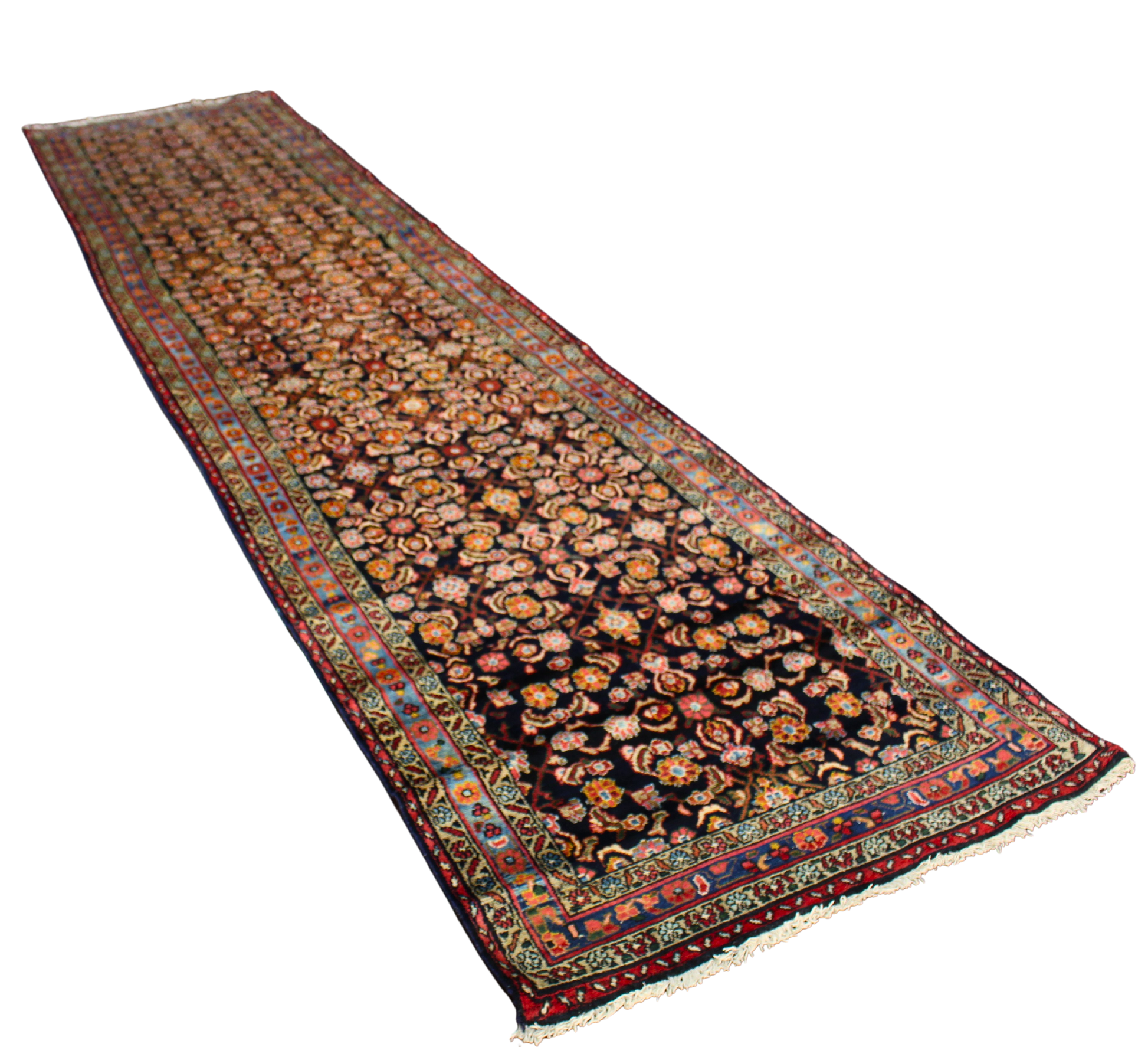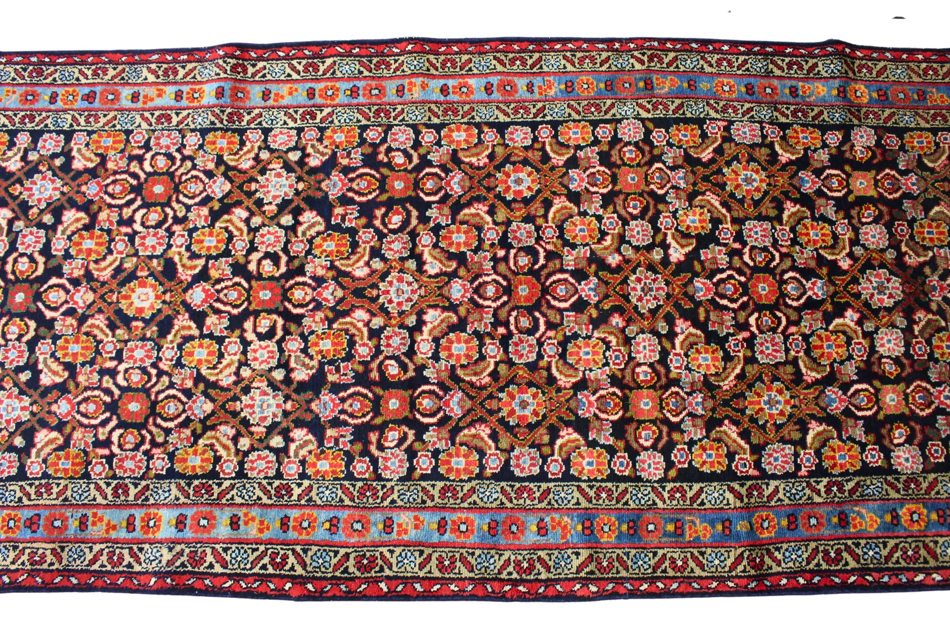 This striking antique Hamedan runner (3.7 × 15.1 ft) is a luminous celebration of color and balance. Set against a deep midnight ground, a profusion of stylized rosettes and floral palmettes bloom in orderly symmetry, flanked by vibrant borders in sky blue, coral, and ivory. The repeating motif is both traditional and lively — a testament to the rhythmic artistry of Persian village weavers.
