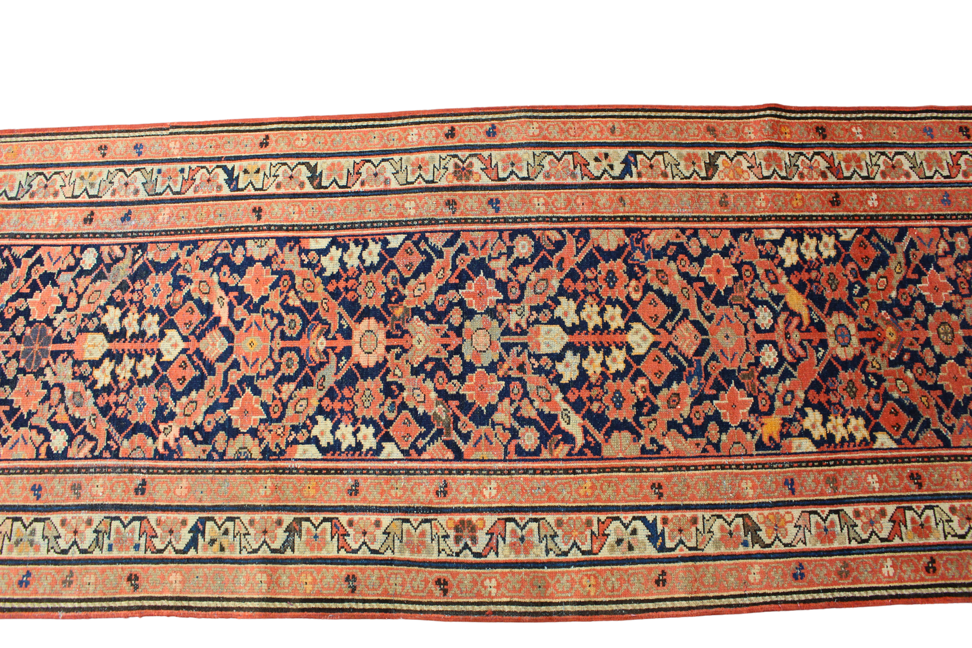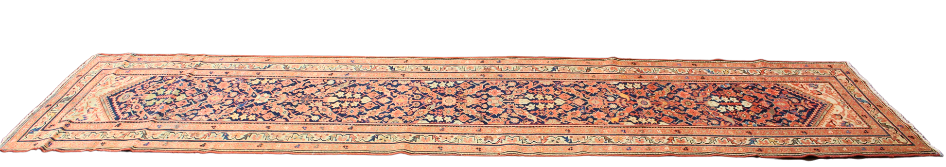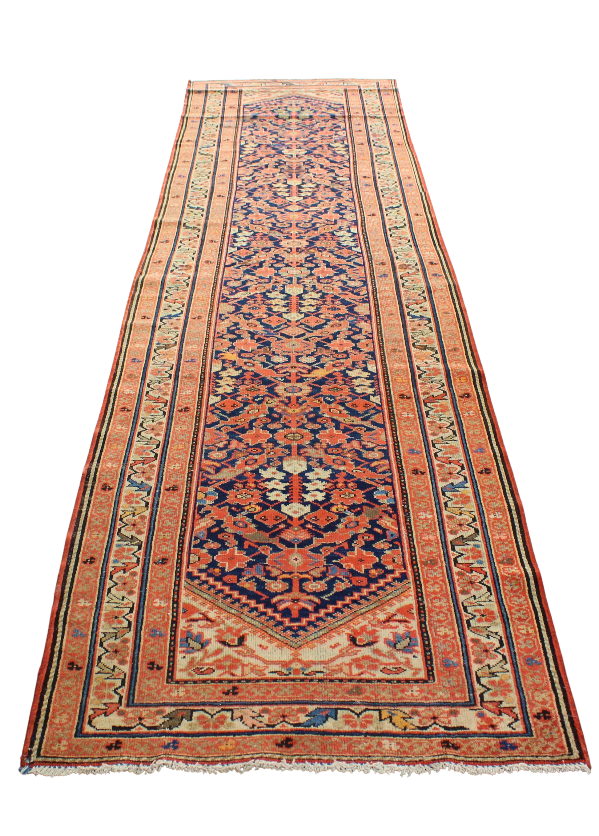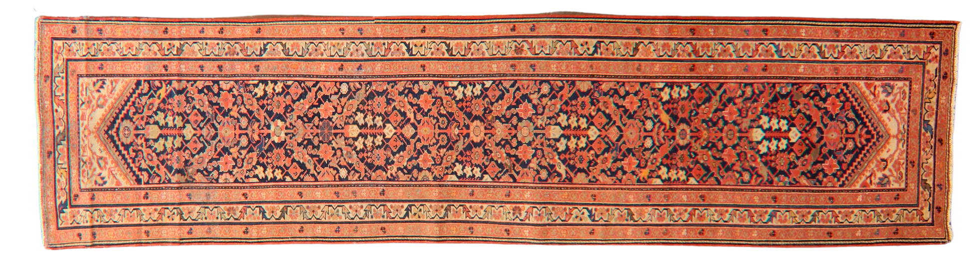 With its classic medallion-and-spandrel layout stretched into a runner format, this antique Persian Malayer (3.3 × 13 ft) offers a striking blend of symmetry and saturation. The navy field is filled with floral rosettes and angular vines in warm coral, soft apricot, and cream, arranged around a diamond-shaped central axis that culminates in dramatic arrowhead-style ends.