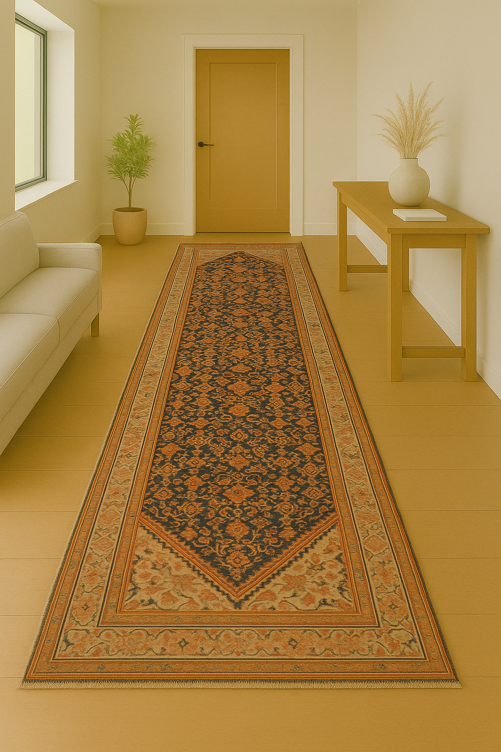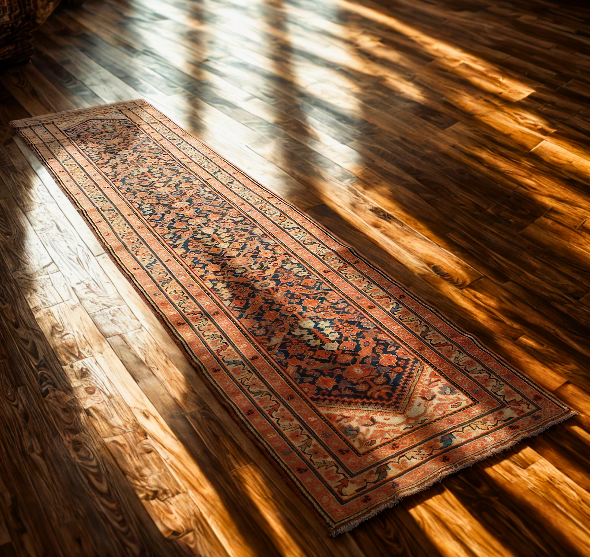 The dual-tone spandrels in the runner’s corners mimic full medallions, giving the piece a framed and complete aesthetic, while the surrounding borders feature rhythmic vine-and-blossom motifs that tie the entire composition together.