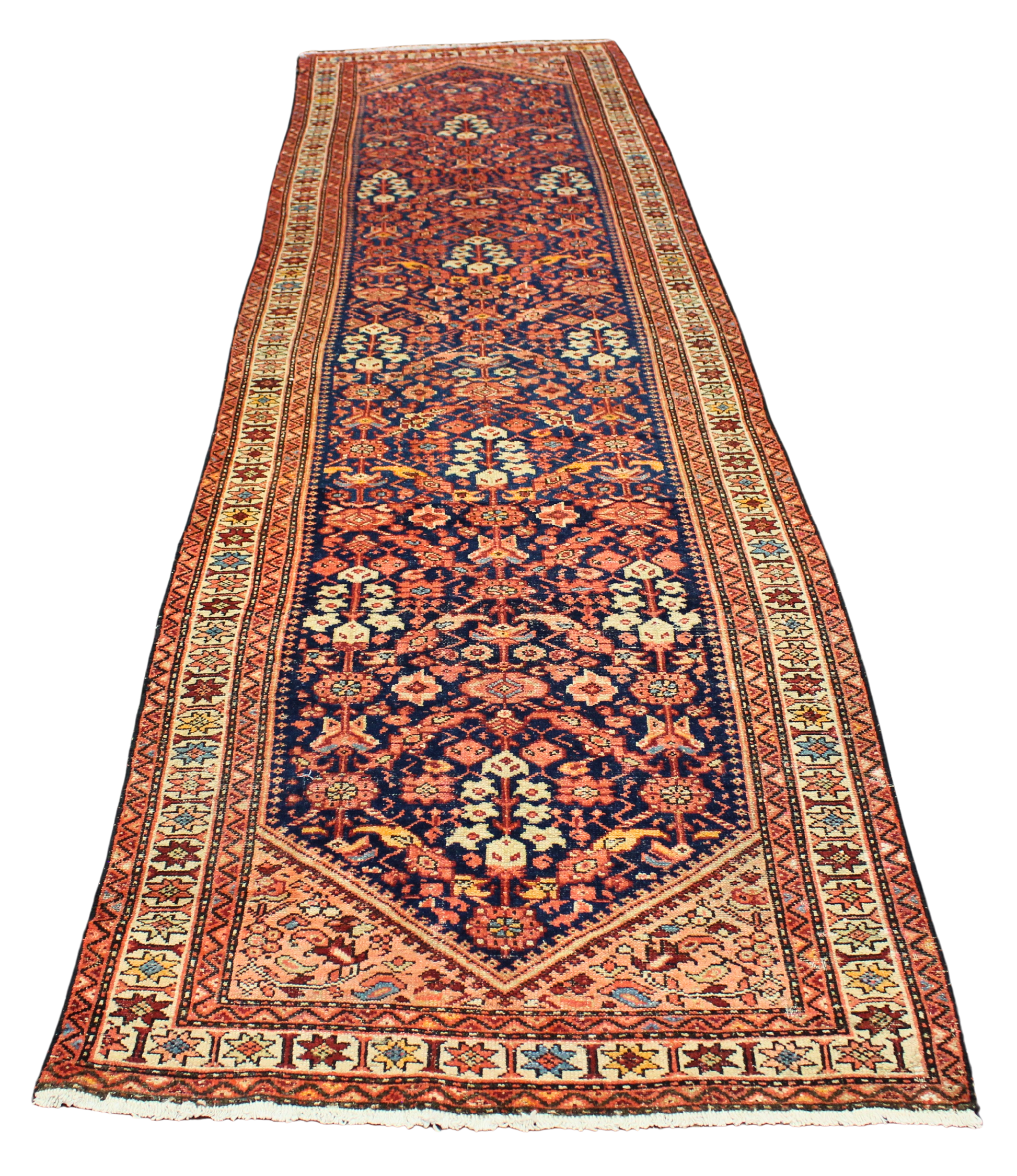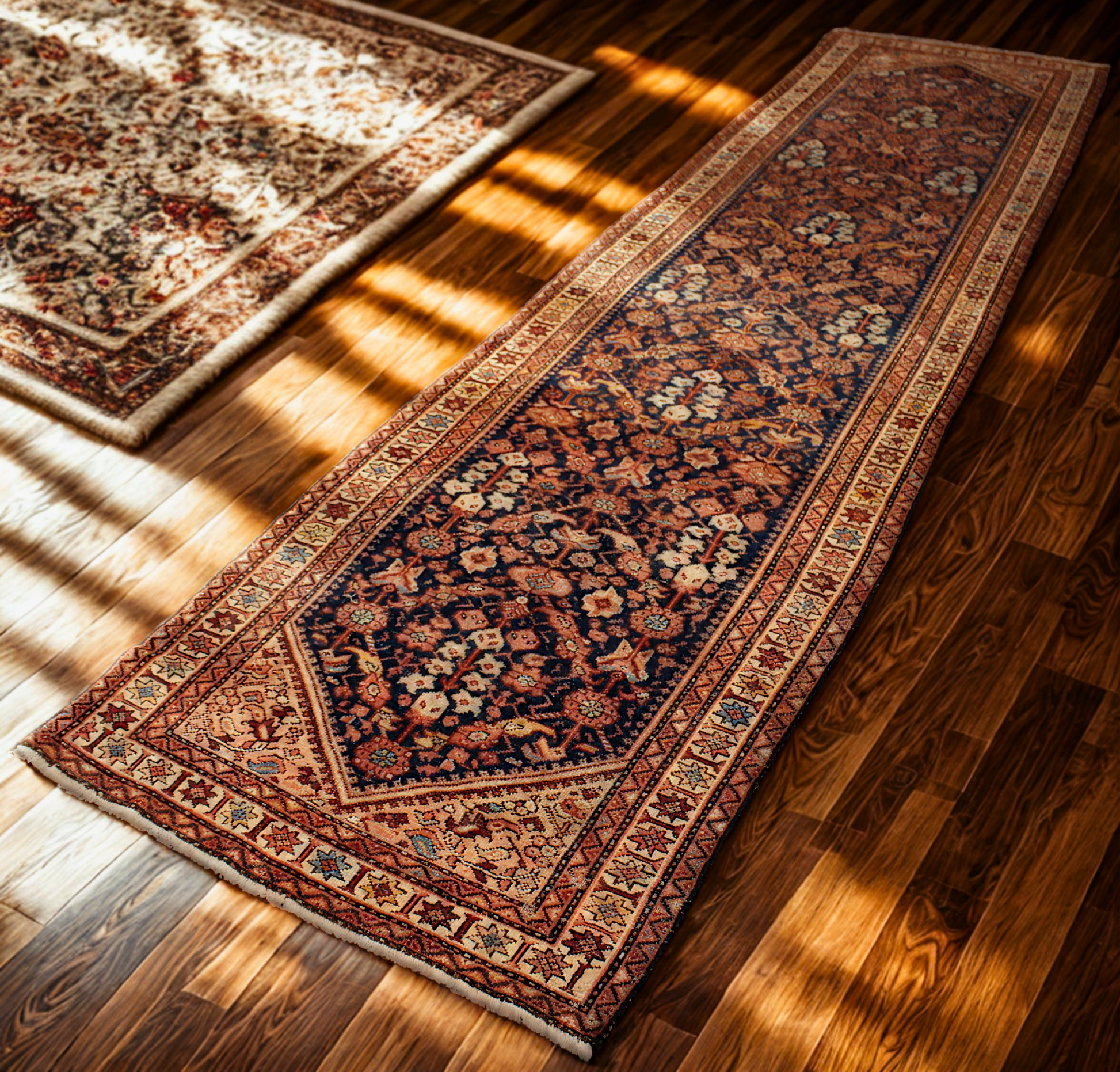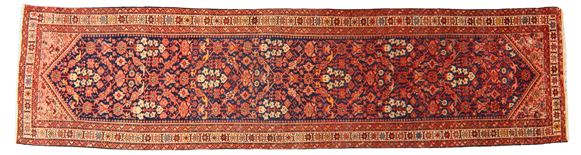 This rare and richly detailed antique Malayer runner from persian (3.4 × 13.3 ft) weaves together natural beauty and tribal storytelling in a masterful village composition. The centerpiece of the rug is a mirrored series of medallions filled with stylized floral bouquets, flanked by elegantly rendered animals — including prancing deer or stags — a motif believed to represent vitality and protection in Persian folk art.