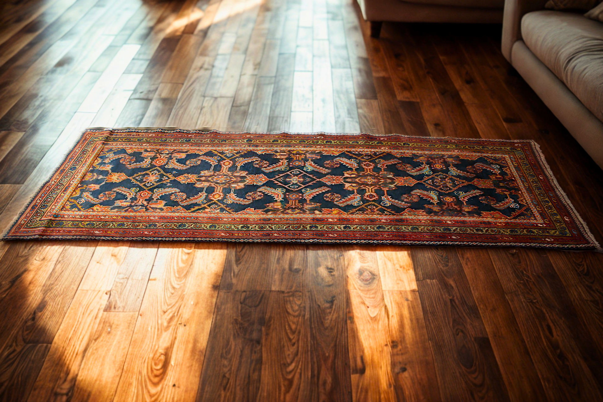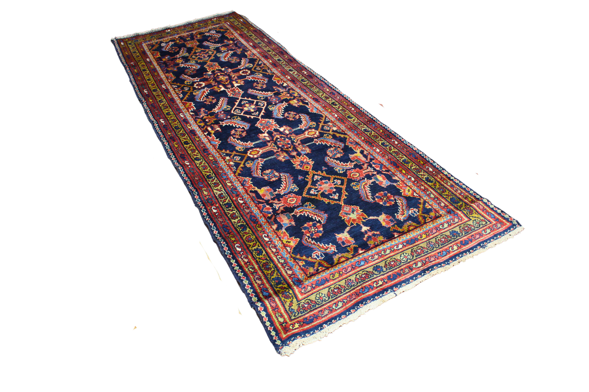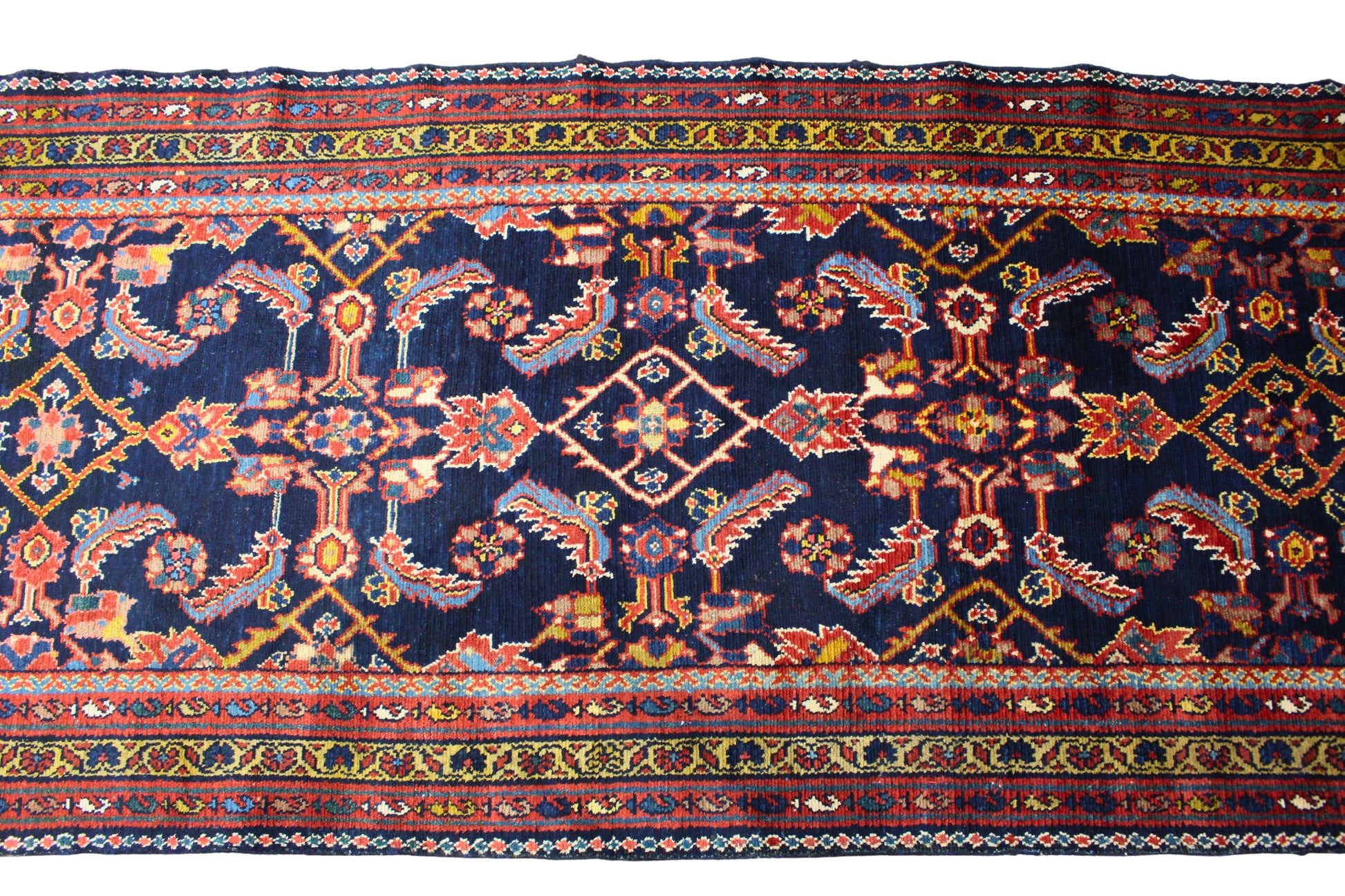 This antique Hamedan runner (3.6 × 9.5 ft) is a bold expression of Persian village weaving, showcasing a high-contrast palette that captures attention with every step. The deep indigo field provides a dramatic backdrop for the vivid rust, coral, and ivory floral motifs that spiral rhythmically through the length of the rug.