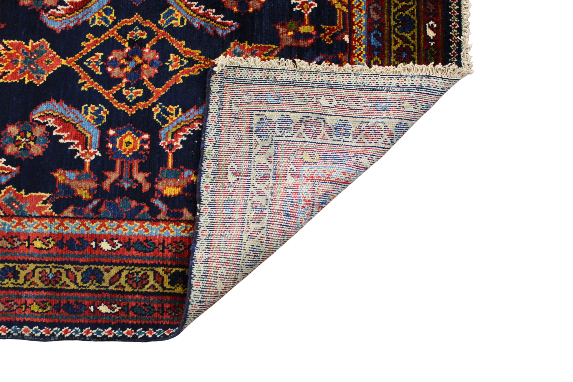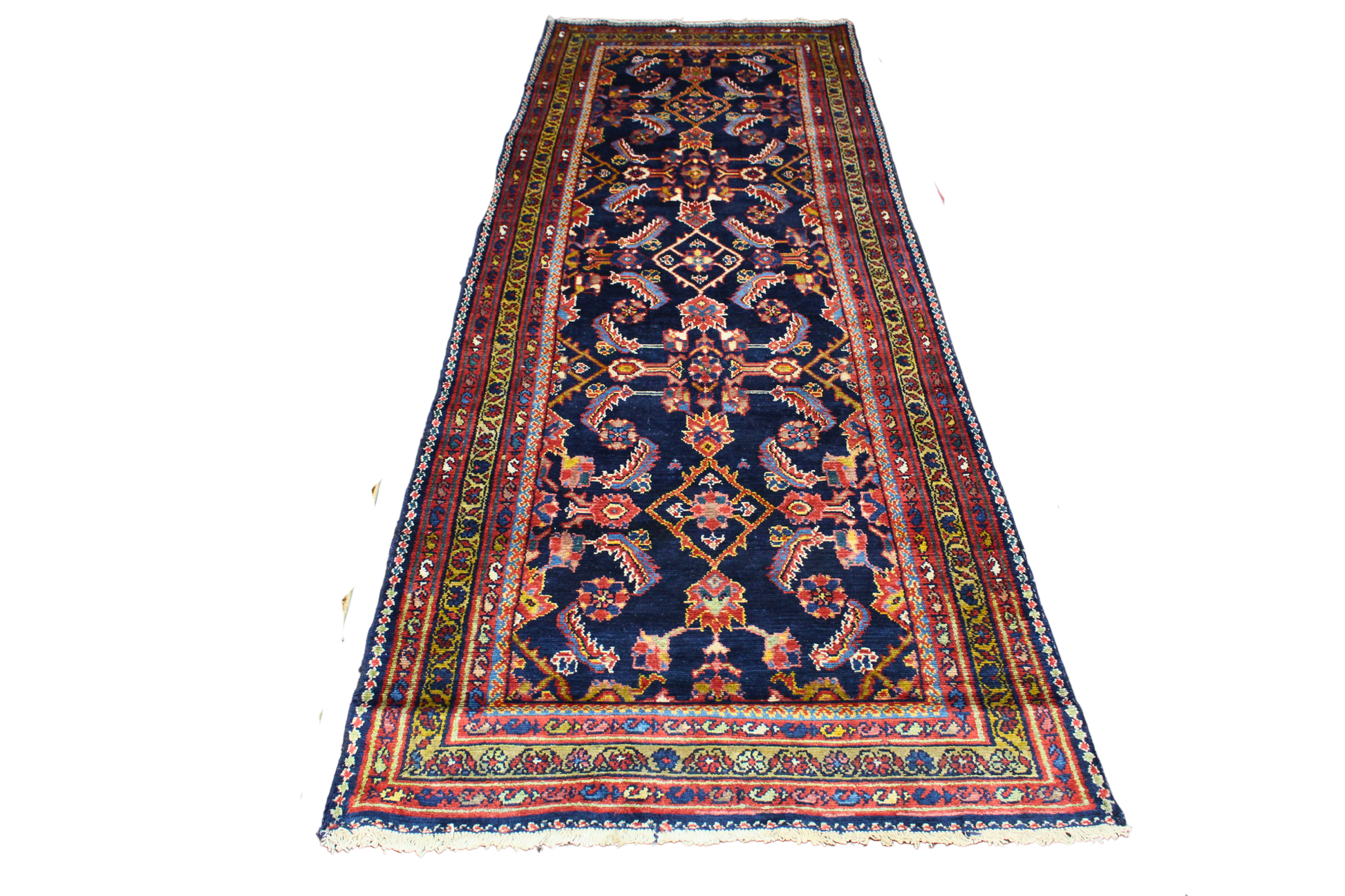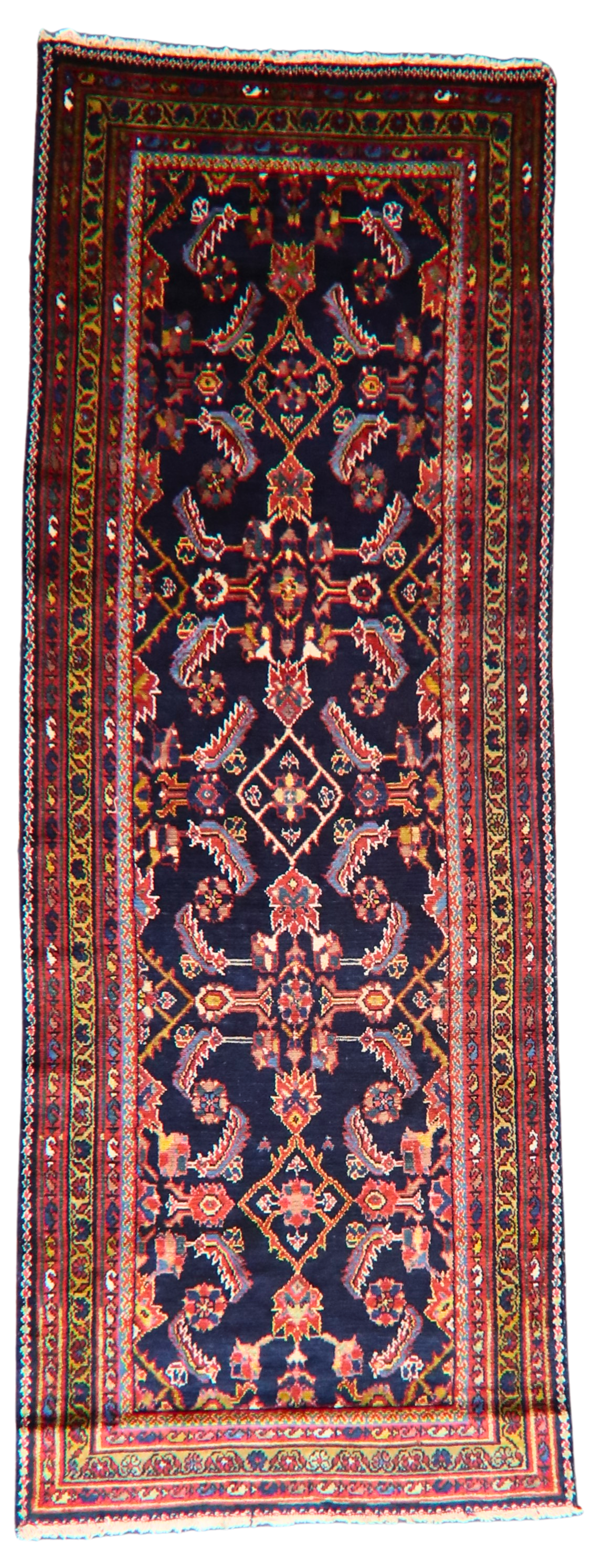 This antique Hamedan runner (3.6 × 9.5 ft) is a bold expression of Persian village weaving, showcasing a high-contrast palette that captures attention with every step. The deep indigo field provides a dramatic backdrop for the vivid rust, coral, and ivory floral motifs that spiral rhythmically through the length of the rug.