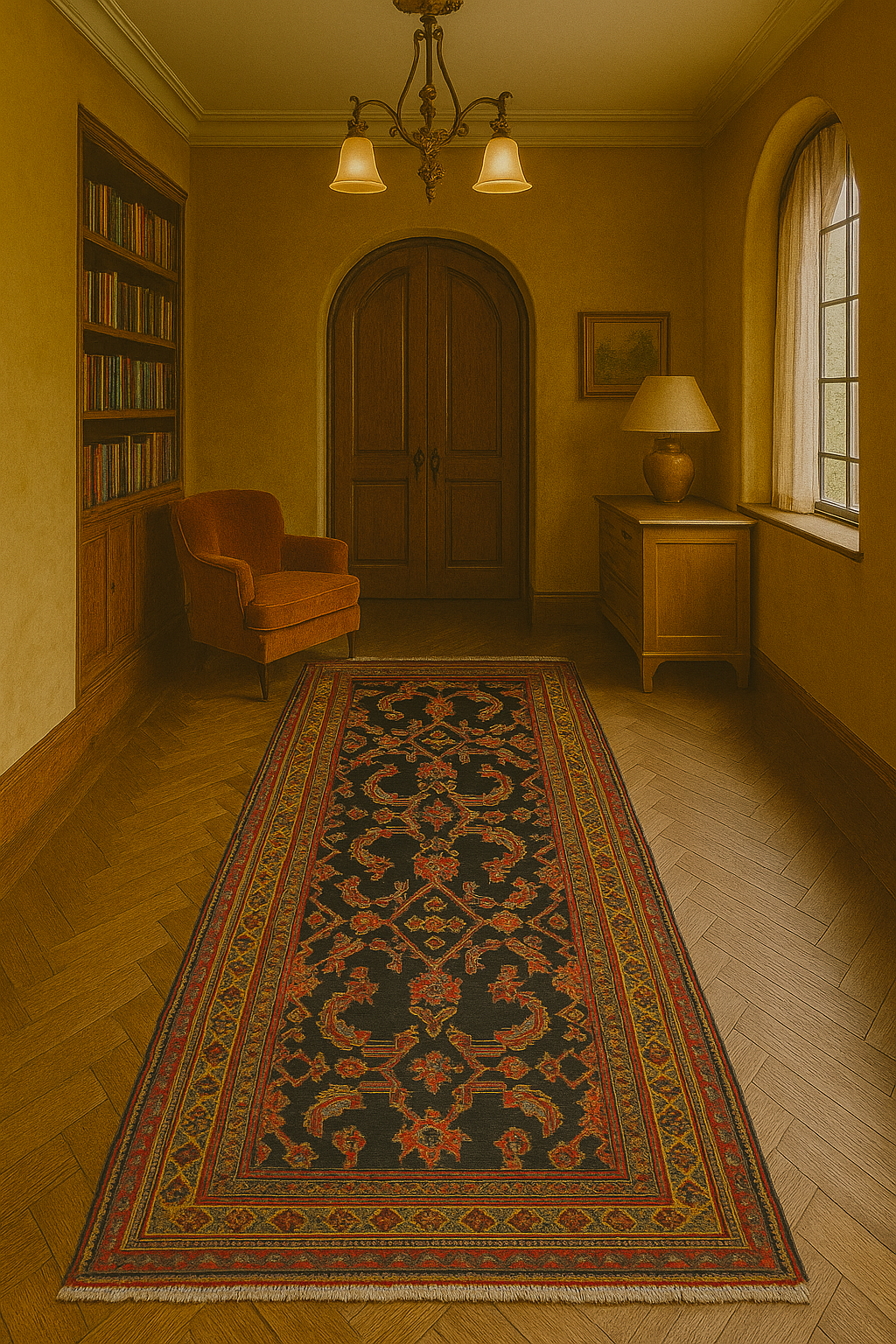 Its narrower profile makes it ideal for hallways, transitional spaces, or alongside a bookcase in a moody study. The rug’s luminous wool pile, dyed with natural pigments, adds both comfort and centuries-old charm.