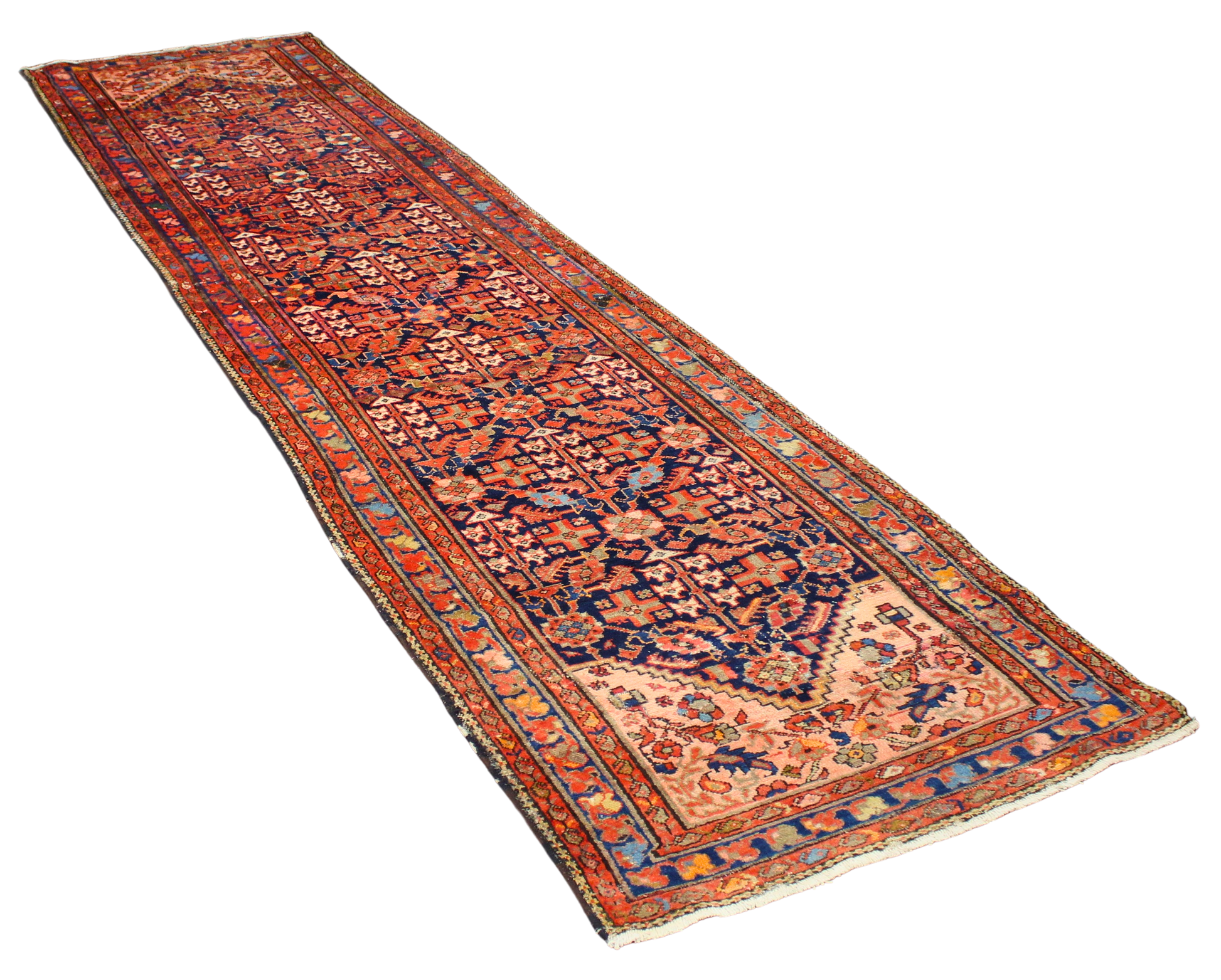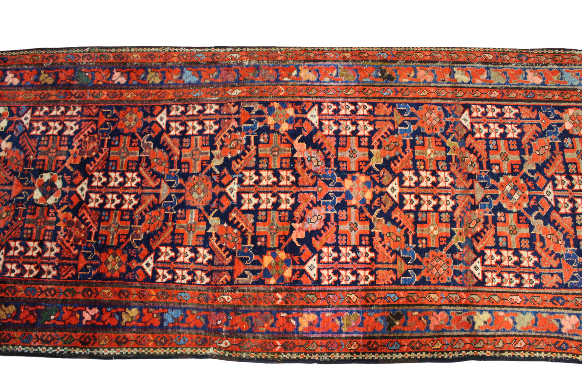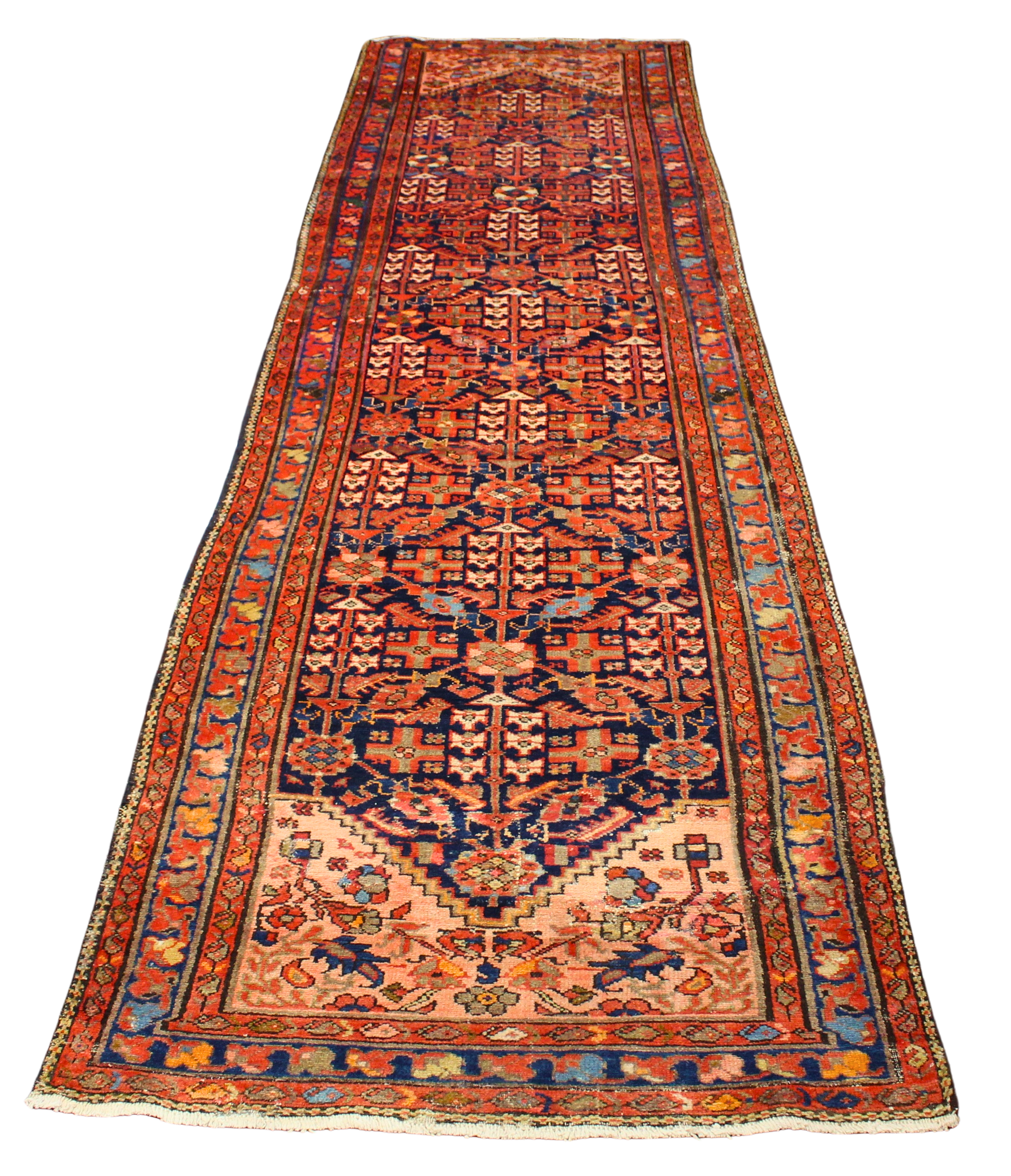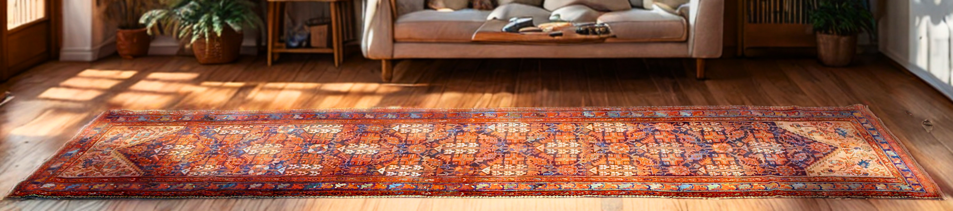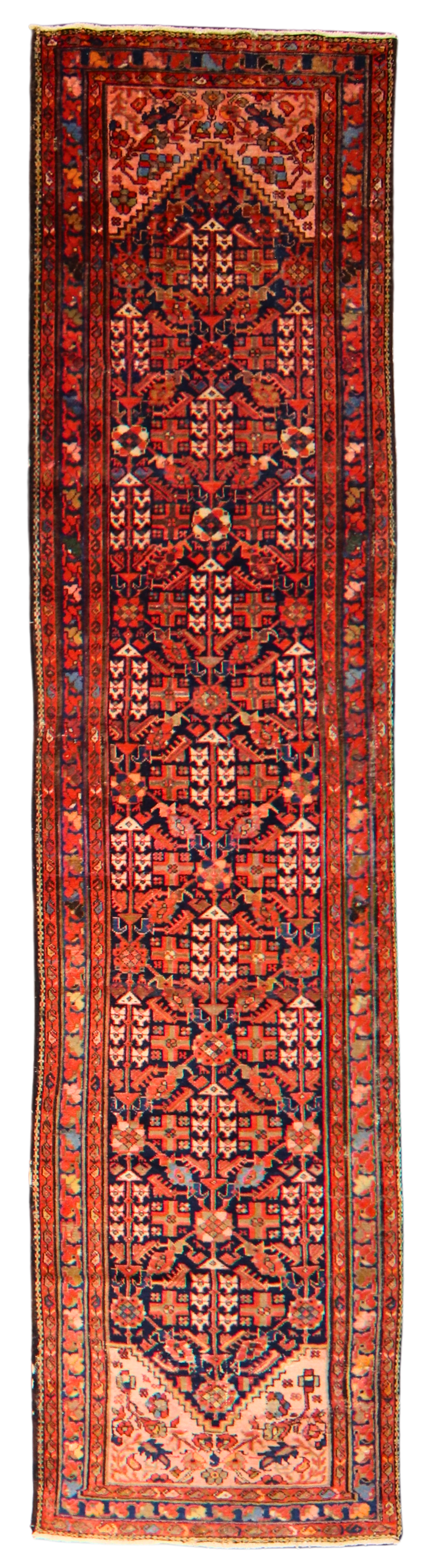 This striking antique Malayer runner, handwoven in persian, spans an elegant 3.3 × 13.6 feet — a masterpiece of village craftsmanship with powerful visual rhythm and exquisite detail. The rug’s rare vertical symmetry and angular stylized motifs speak of tribal symbolism, with vibrant rust-reds, deep indigo, ivory, and celadon greens creating a vivid, well-balanced palette.