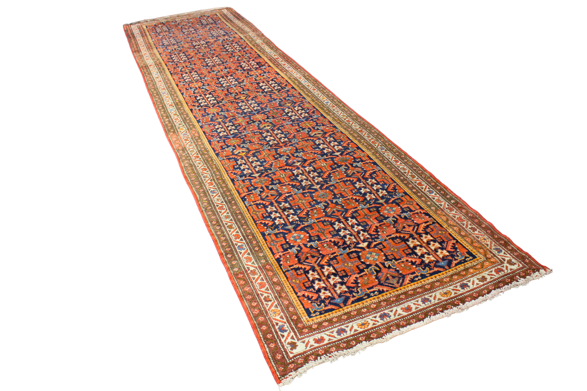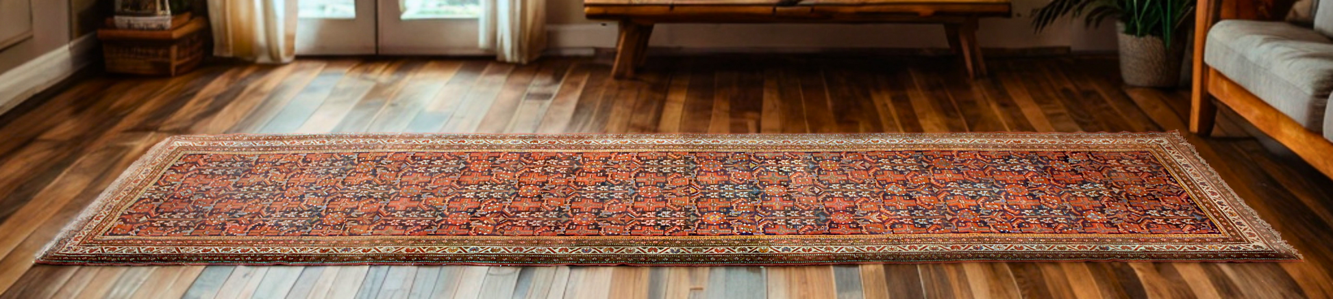An intricate mosaic of angular floral motifs and tribal symbolism, this antique Malayer runner from Persia (3.1 × 13.5 ft) is a striking example of village weaving at its most expressive. The rug’s elongated field bursts with repeating cross-hatch medallions, framed by serrated palmettes and stylized leafy forms that pulse with vibrant rhythm across its length.
