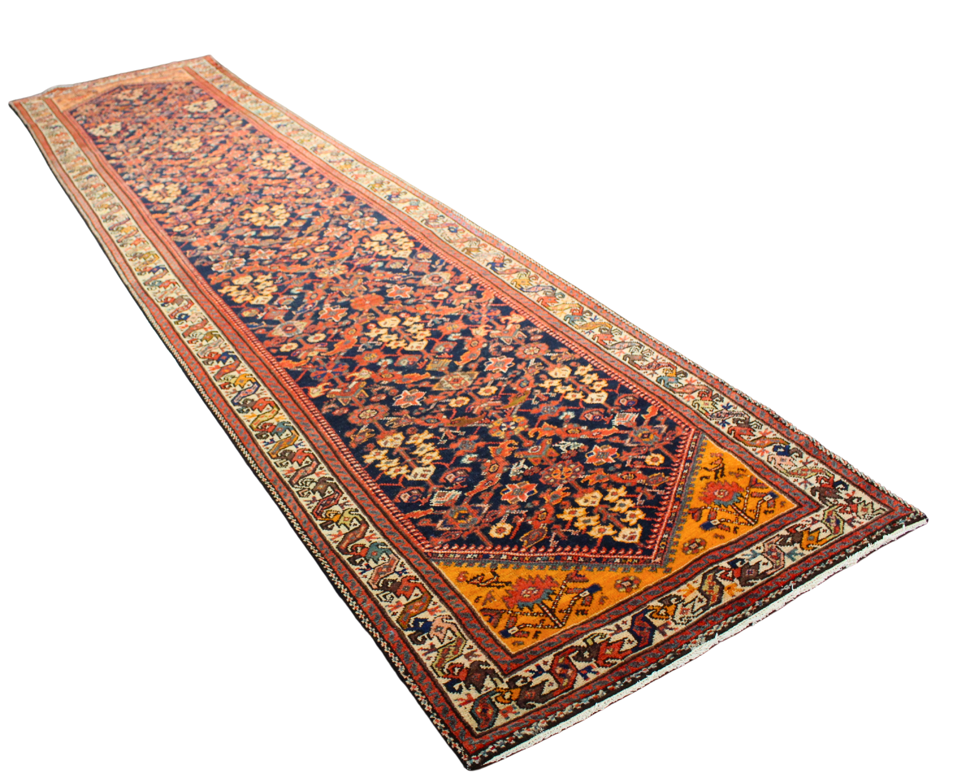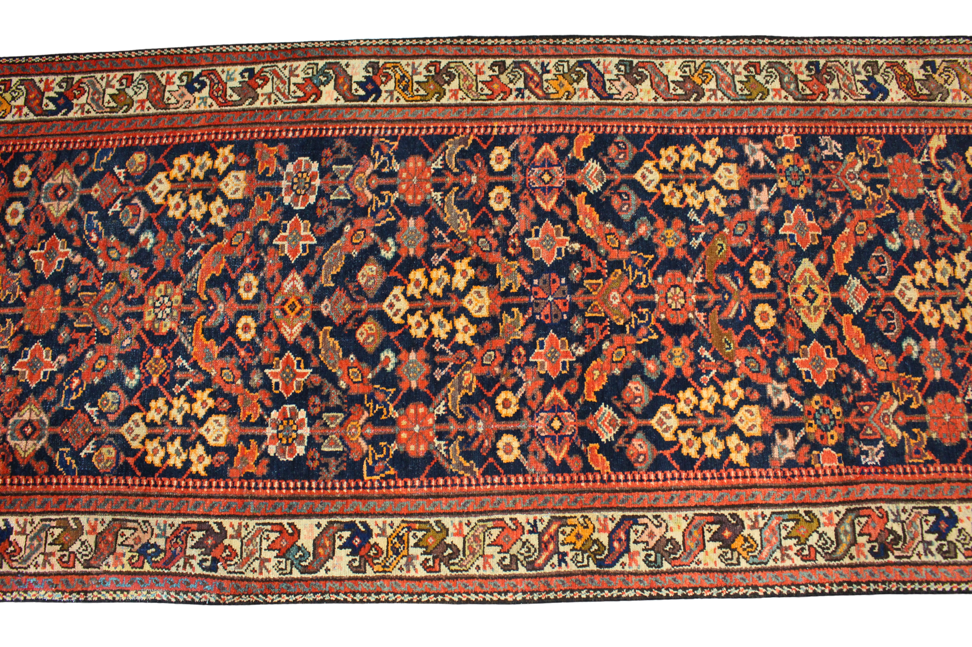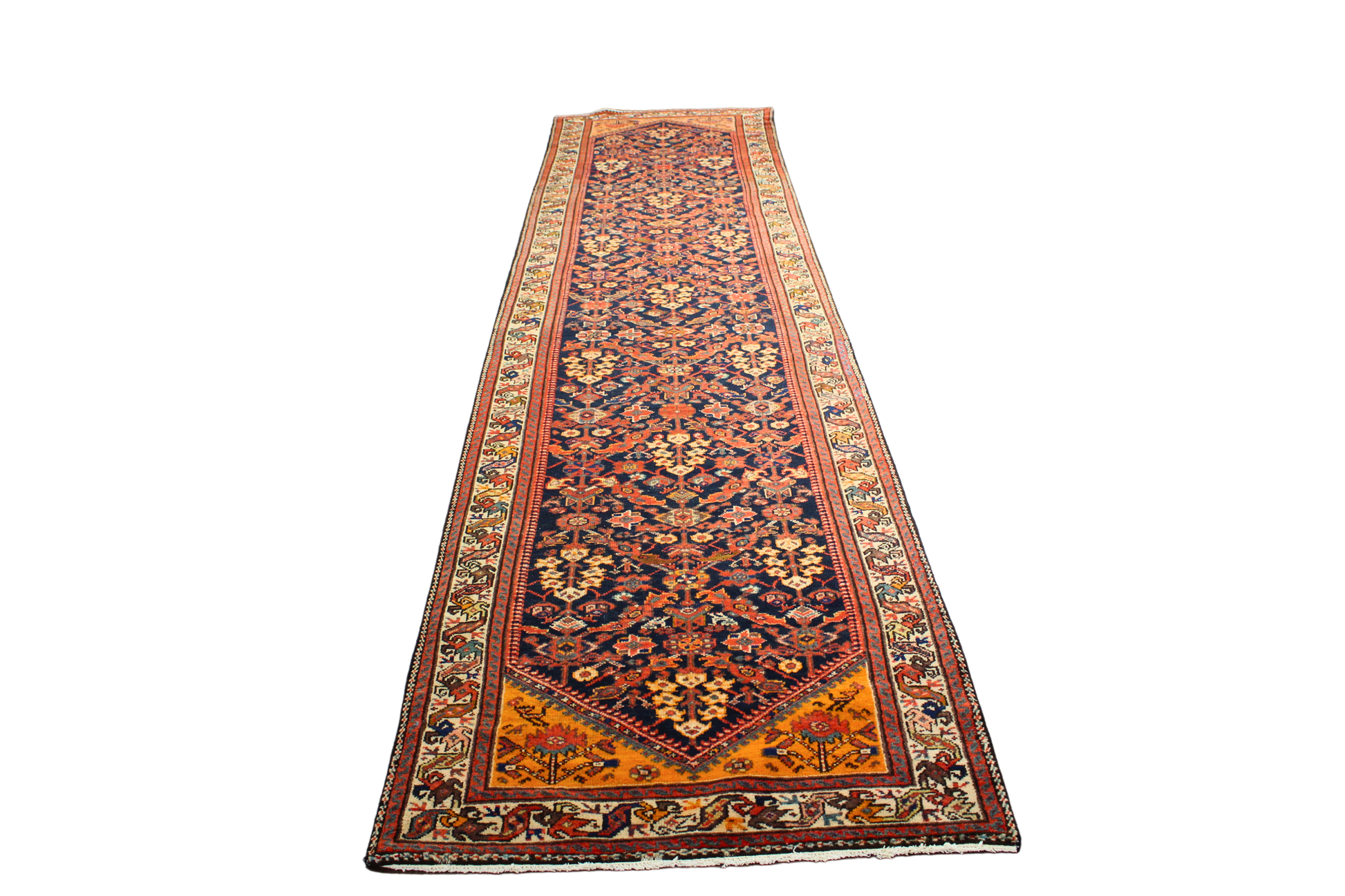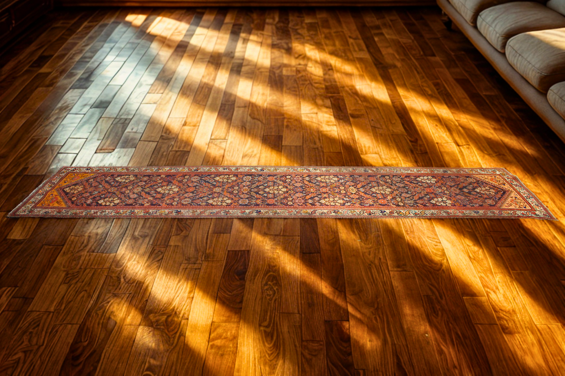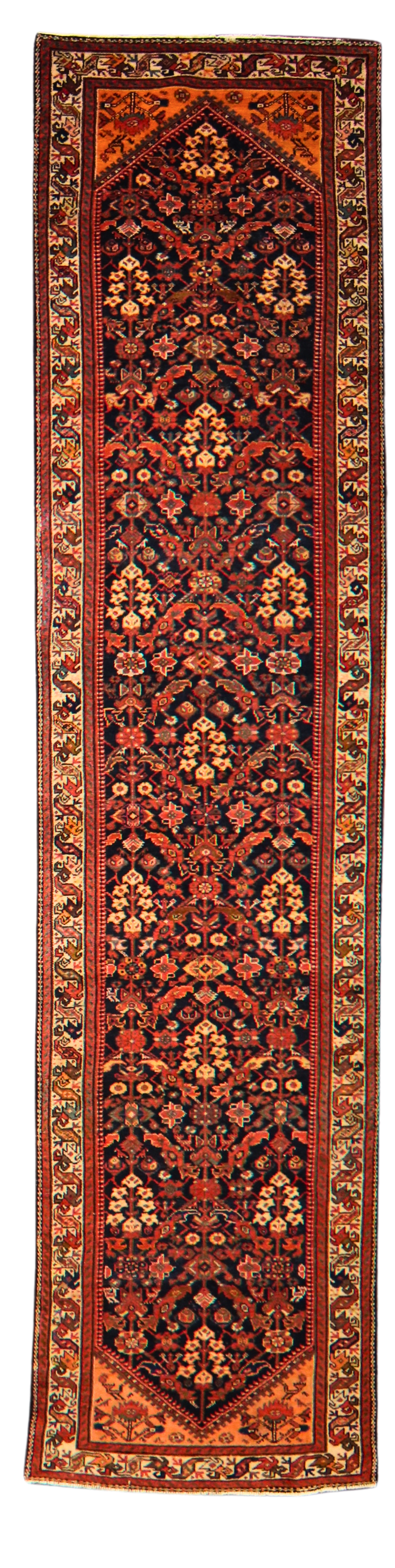 This antique Malayer runner from persian (3.3 × 13.8 ft) radiates with the warm glow of Persian artistry, especially in its striking end panels — glowing in a sunset-like gradient of terracotta and saffron, adorned with stylized trees and floral emblems. These mirrored spandrels frame a richly patterned field woven on a midnight ground, filled with flowering shrubs, rosettes, and geometric latticework in rust red, ivory, soft coral, and sage.