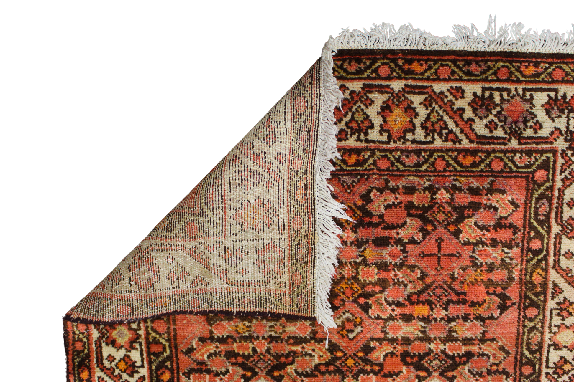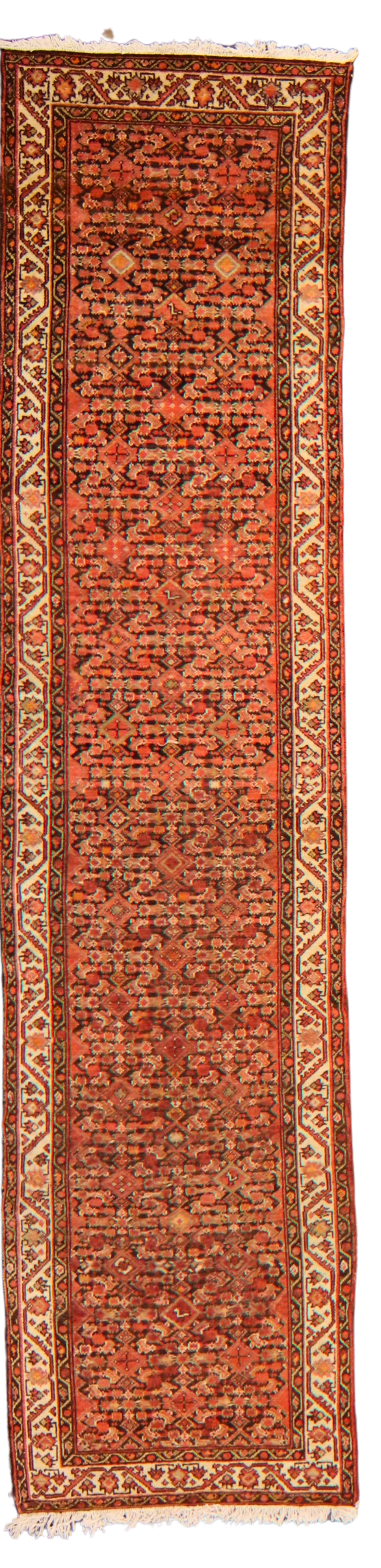 Rich with earthy warmth and tribal rhythm, this antique Malayer runner from persian (2.10 × 12 ft) features a dense allover design set against a glowing terracotta field. Tiny boteh forms, stylized blossoms, and geometric diamonds form an endless lattice across the rug, creating texture and movement while maintaining visual balance. The symmetry of the pattern and fine detailing showcase the exceptional skill of Malayer weavers in the early 20th century.