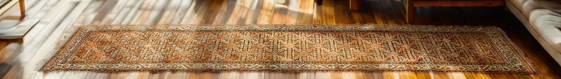 This piece is perfectly suited for narrower hallways or stair landings, where its slim proportions and luminous color can warm up transitional spaces. The rug’s natural age patina, visible abrash, and soft wear add to its antique authenticity and enduring charm.