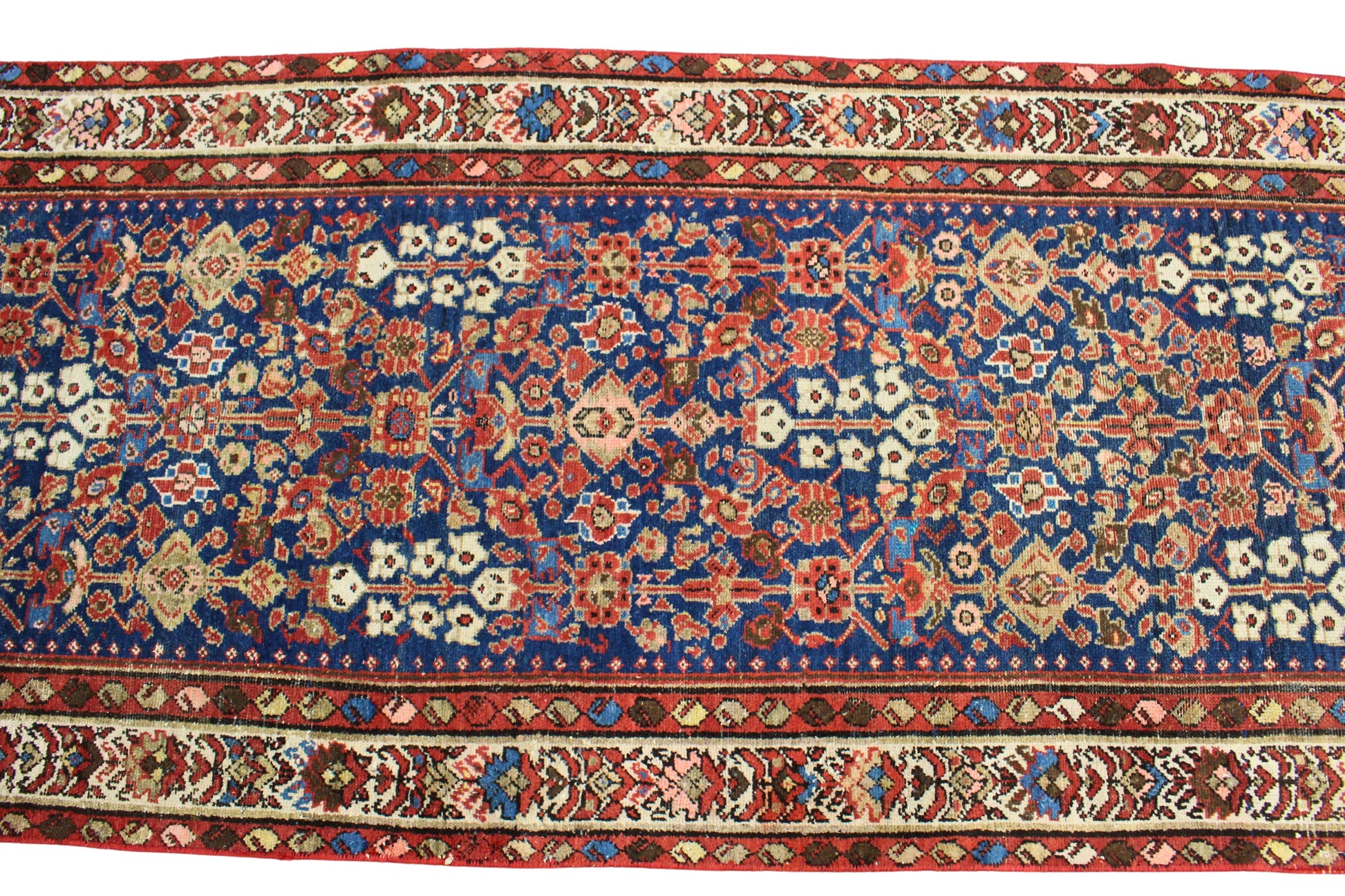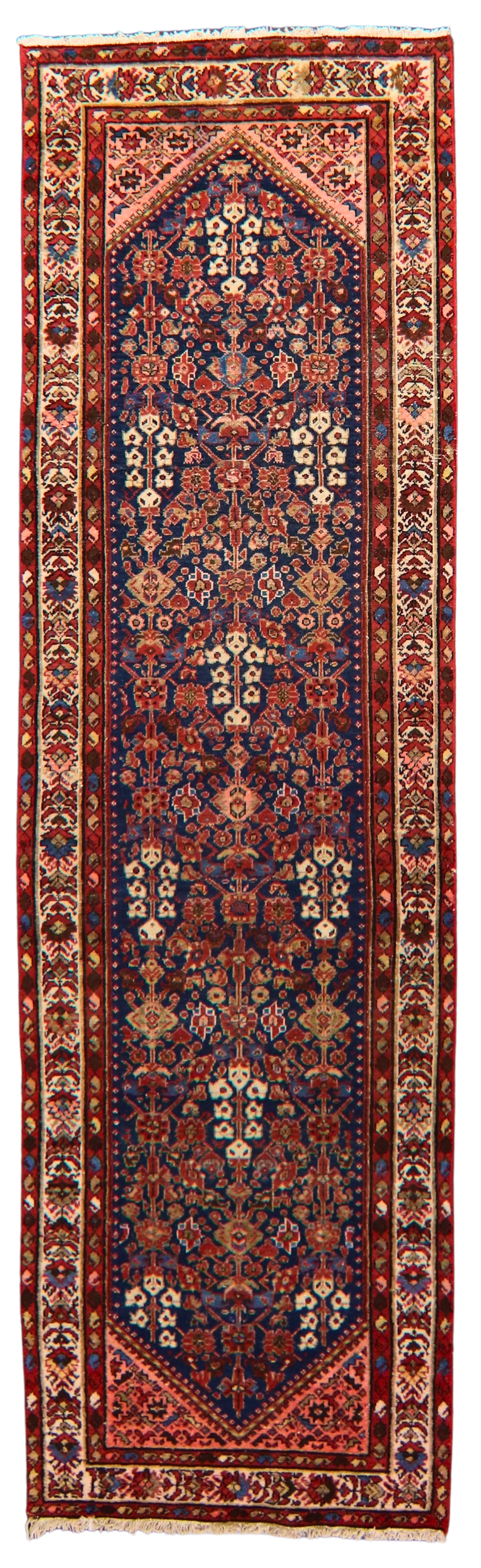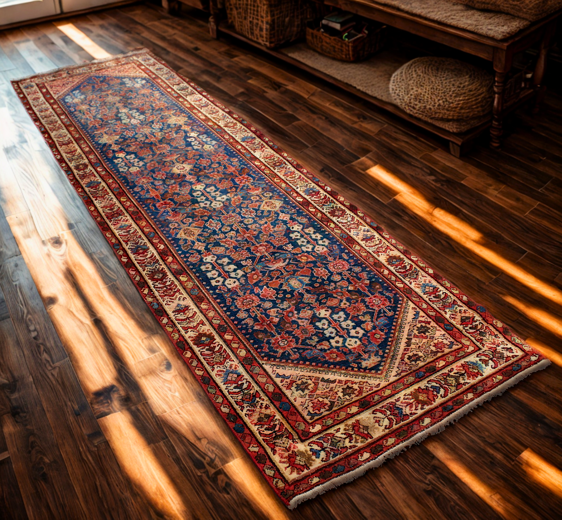 This antique Persian Malayer runner (3.5 × 11.7 ft) is a timeless corridor statement, marrying vertical symmetry with botanical finesse. A rare medallion-spired layout unfolds from each end, with vines and blossoms climbing across the deep midnight-blue field like a stylized garden wall.
