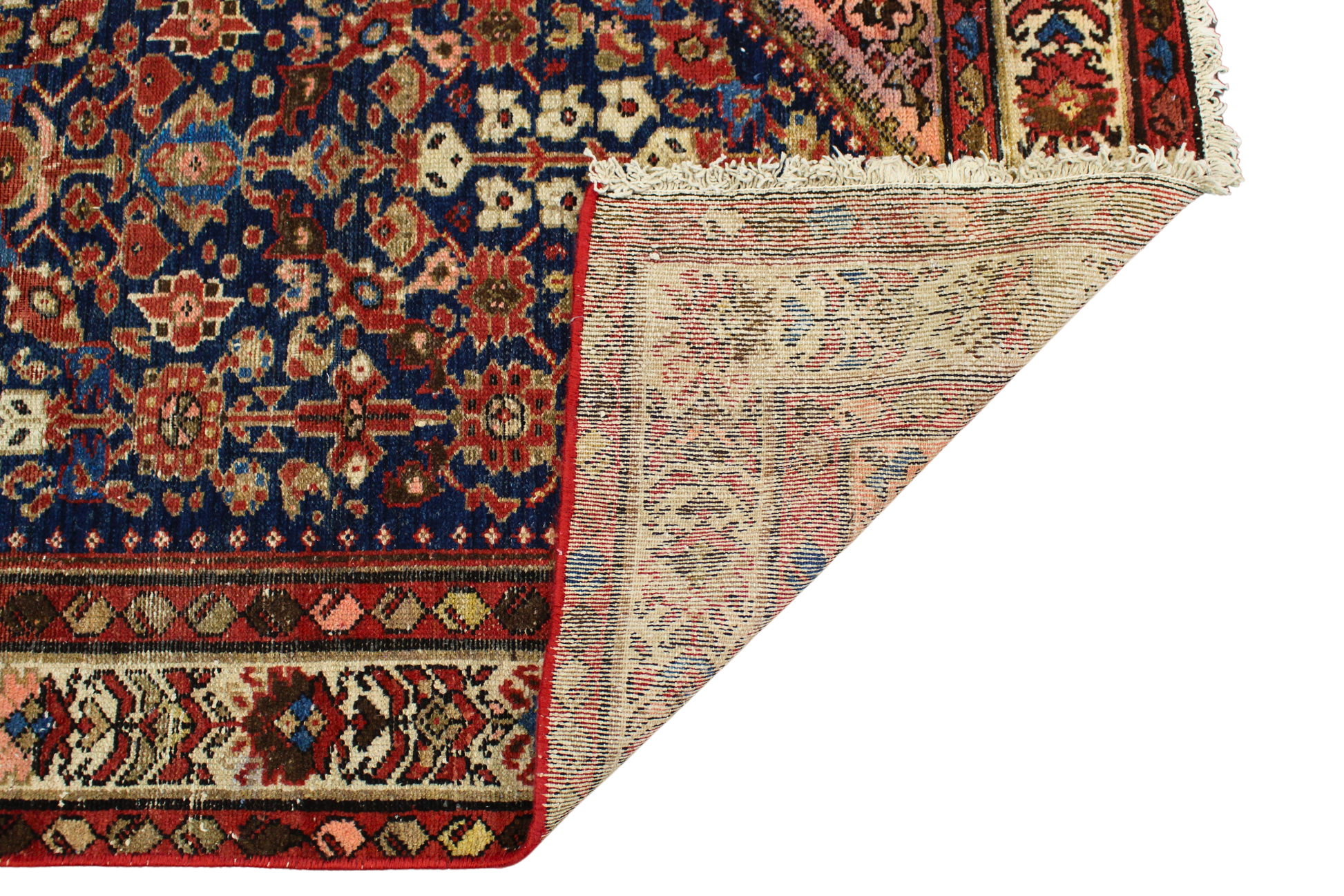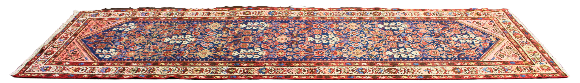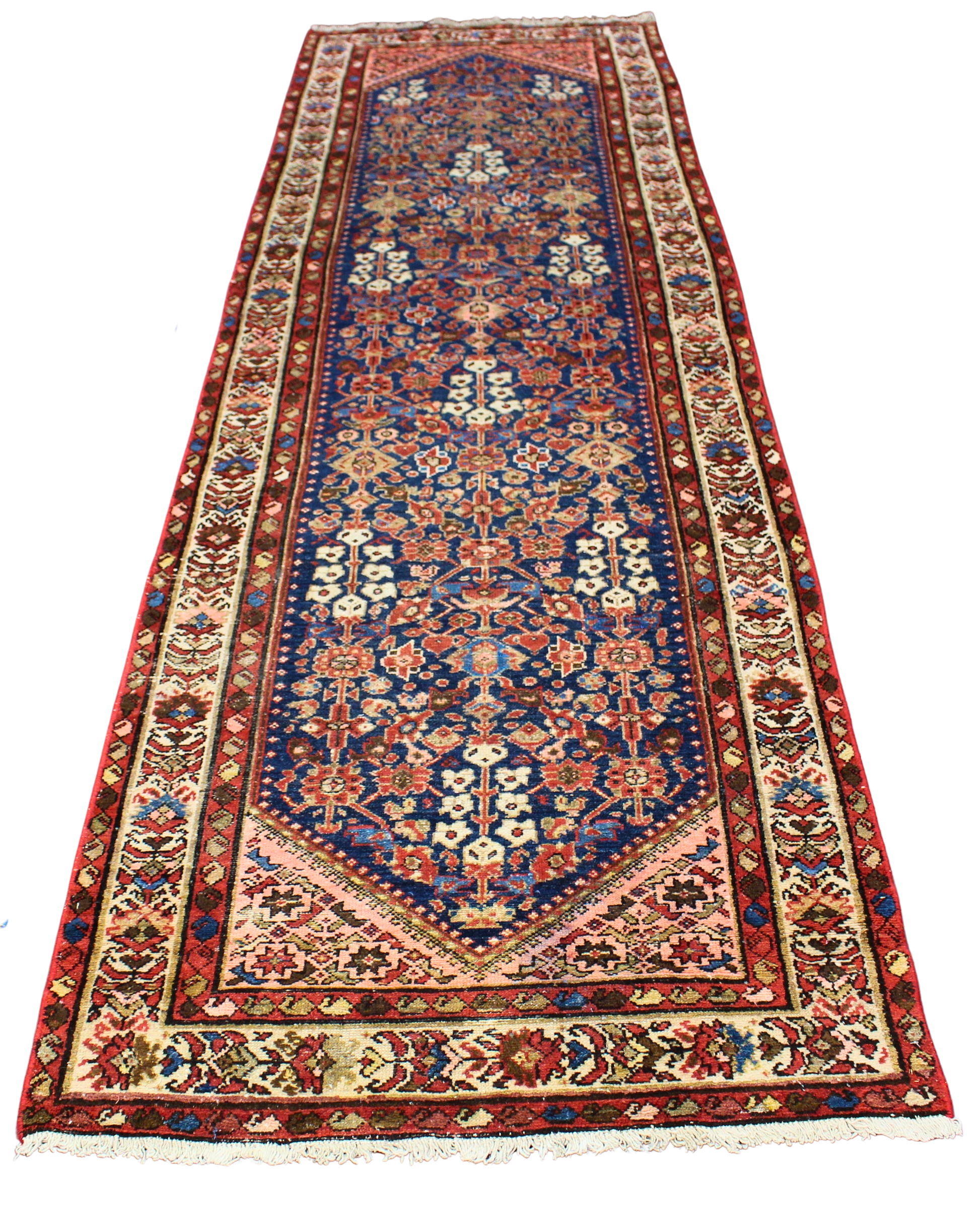 This antique Persian Malayer runner (3.5 × 11.7 ft) is a timeless corridor statement, marrying vertical symmetry with botanical finesse. A rare medallion-spired layout unfolds from each end, with vines and blossoms climbing across the deep midnight-blue field like a stylized garden wall.