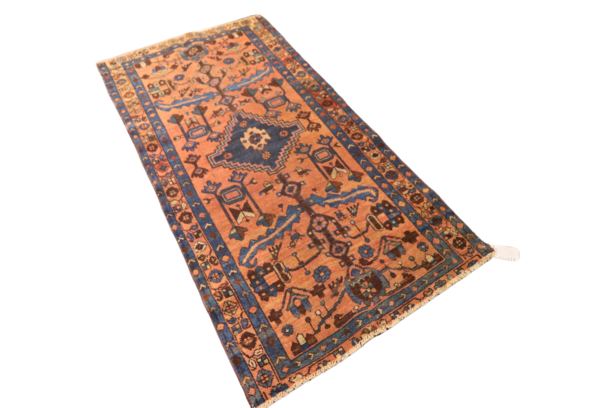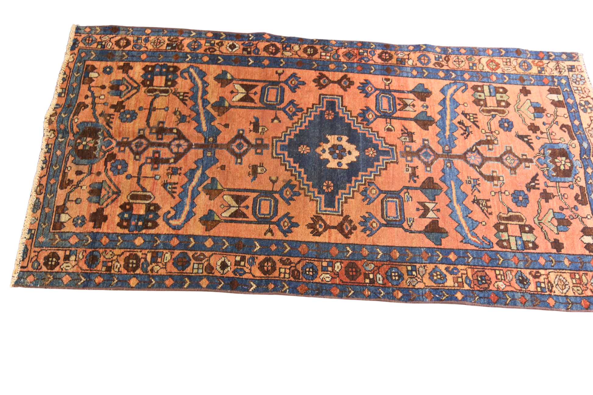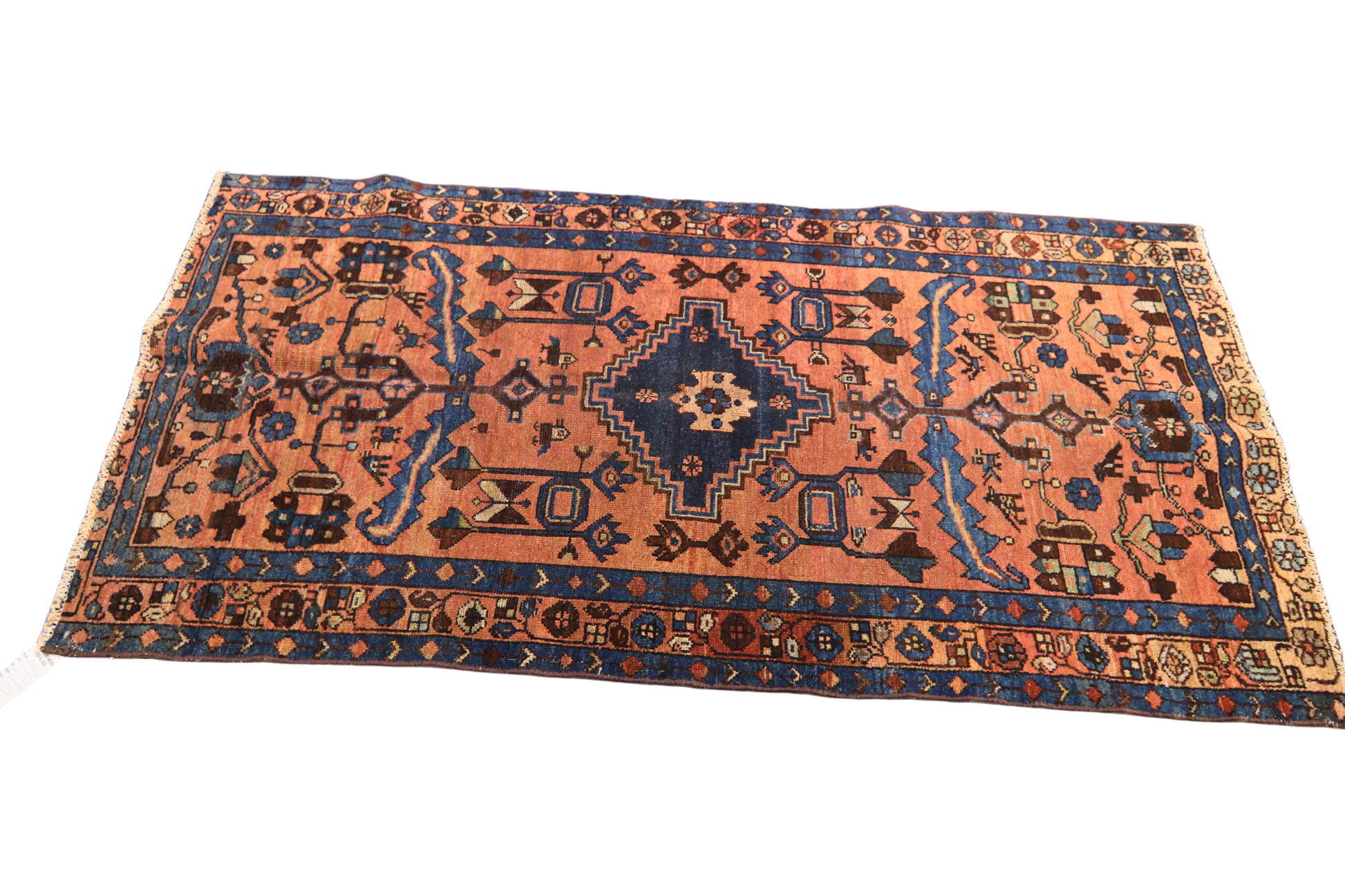 This antique Lilihan rug (3.1 × 6.4 ft) is a beautiful example of rural Persian craftsmanship, woven with a playful yet structured balance of tribal motifs. At its heart, a stepped diamond medallion in deep indigo anchors the soft terracotta field, surrounded by a lively tapestry of geometric florals, animal-like figures, and abstract symbols that nod to nomadic storytelling.