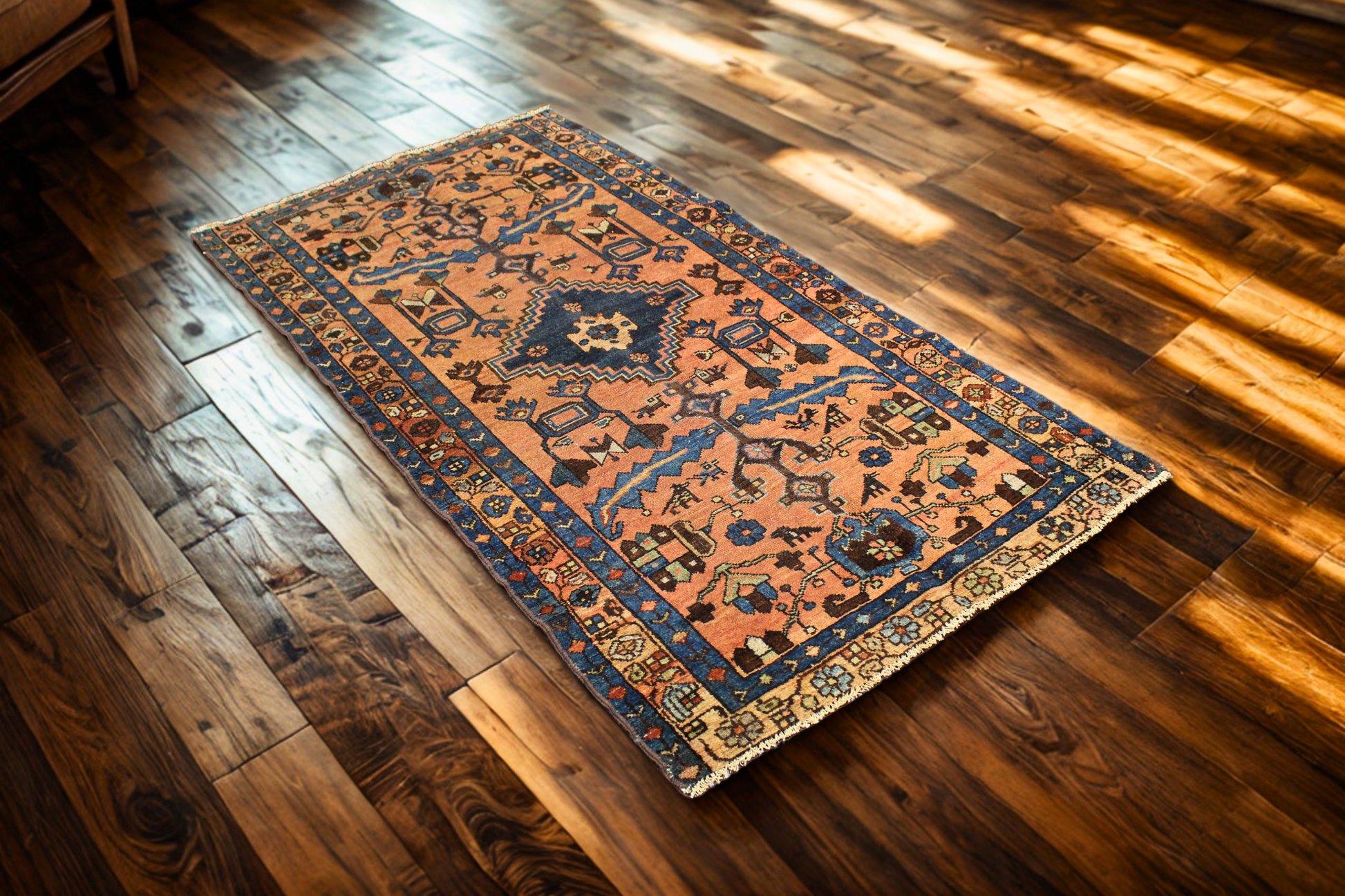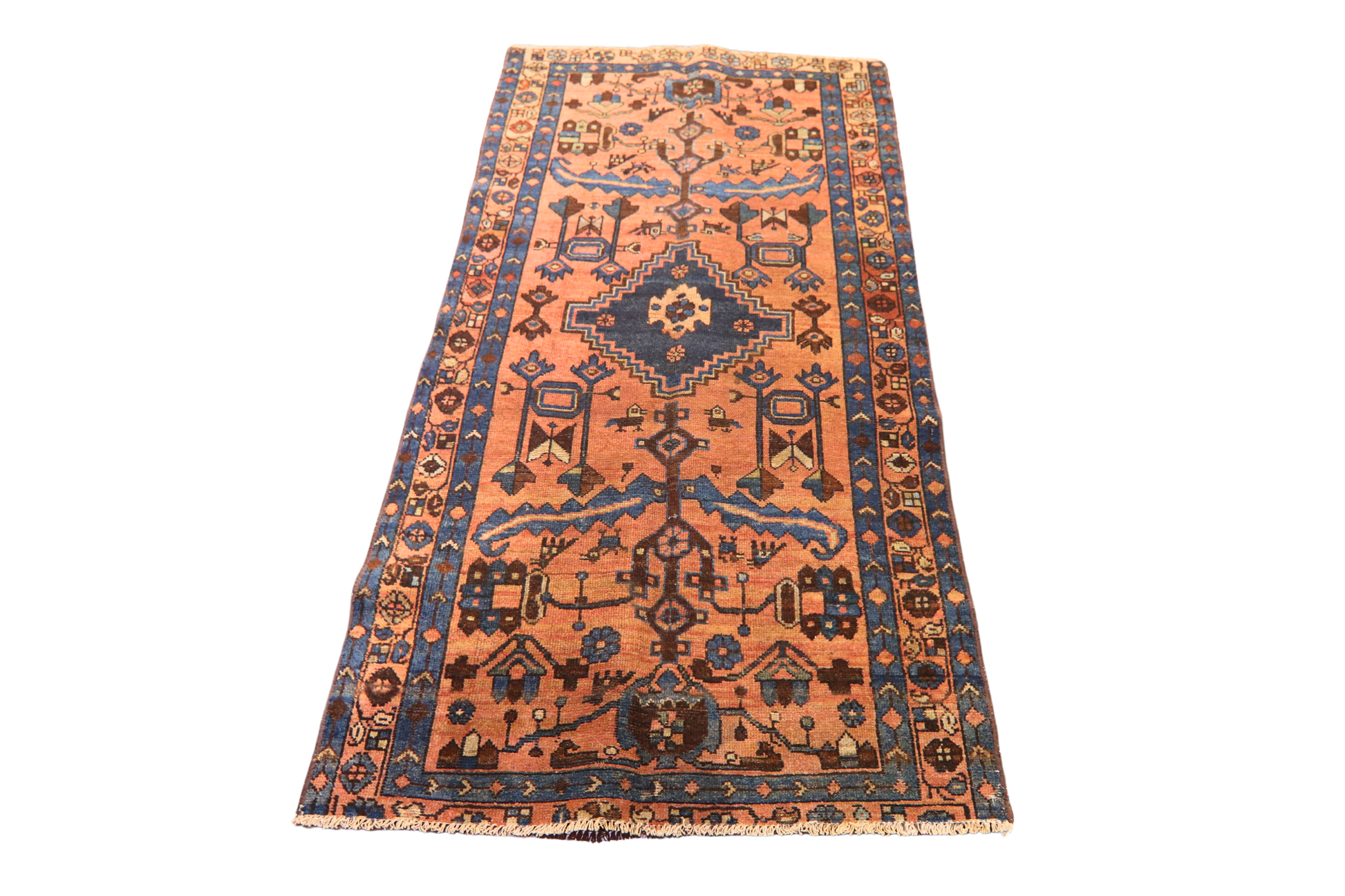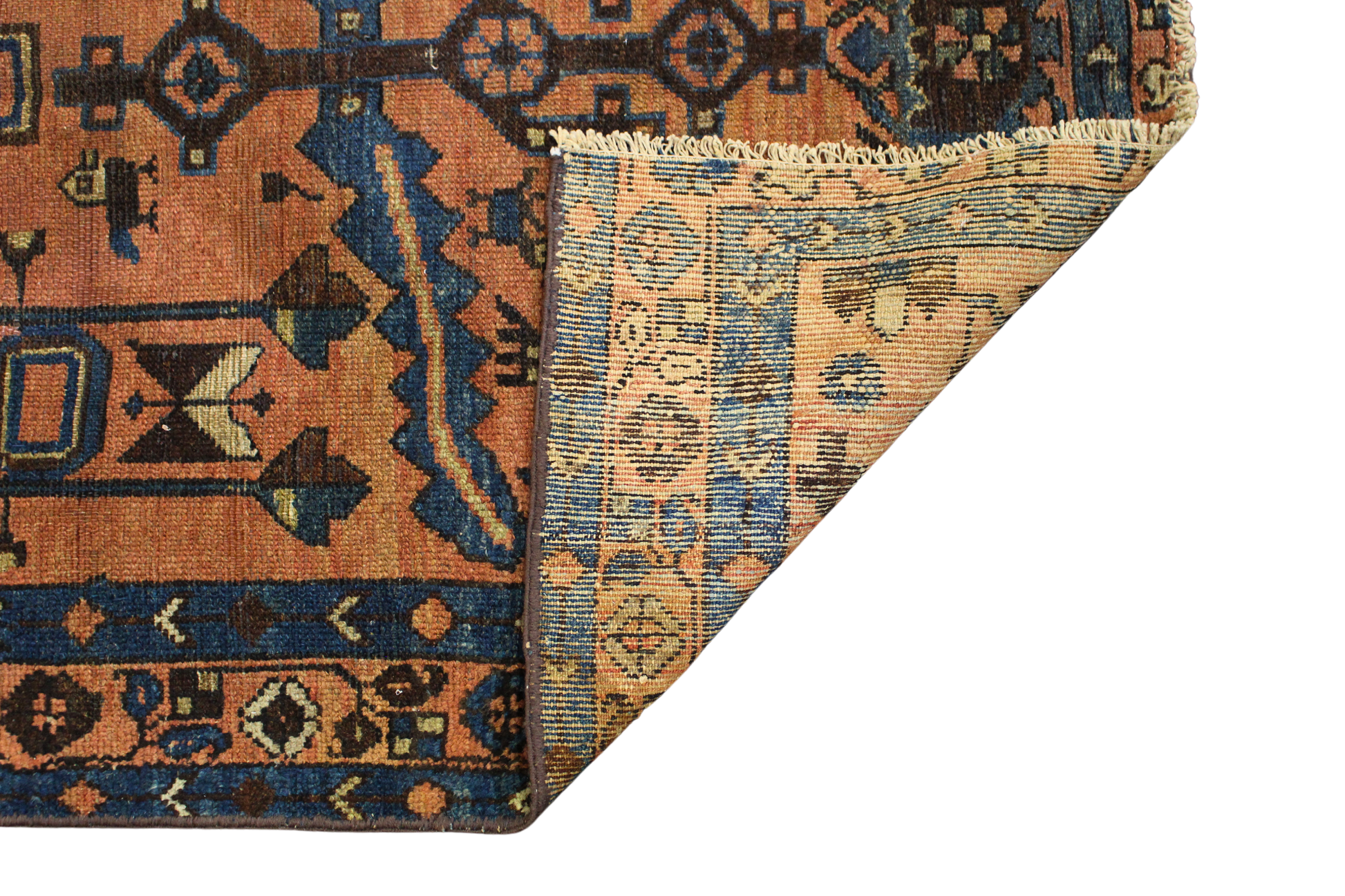This antique Lilihan rug (3.1 × 6.4 ft) is a beautiful example of rural Persian craftsmanship, woven with a playful yet structured balance of tribal motifs. At its heart, a stepped diamond medallion in deep indigo anchors the soft terracotta field, surrounded by a lively tapestry of geometric florals, animal-like figures, and abstract symbols that nod to nomadic storytelling.