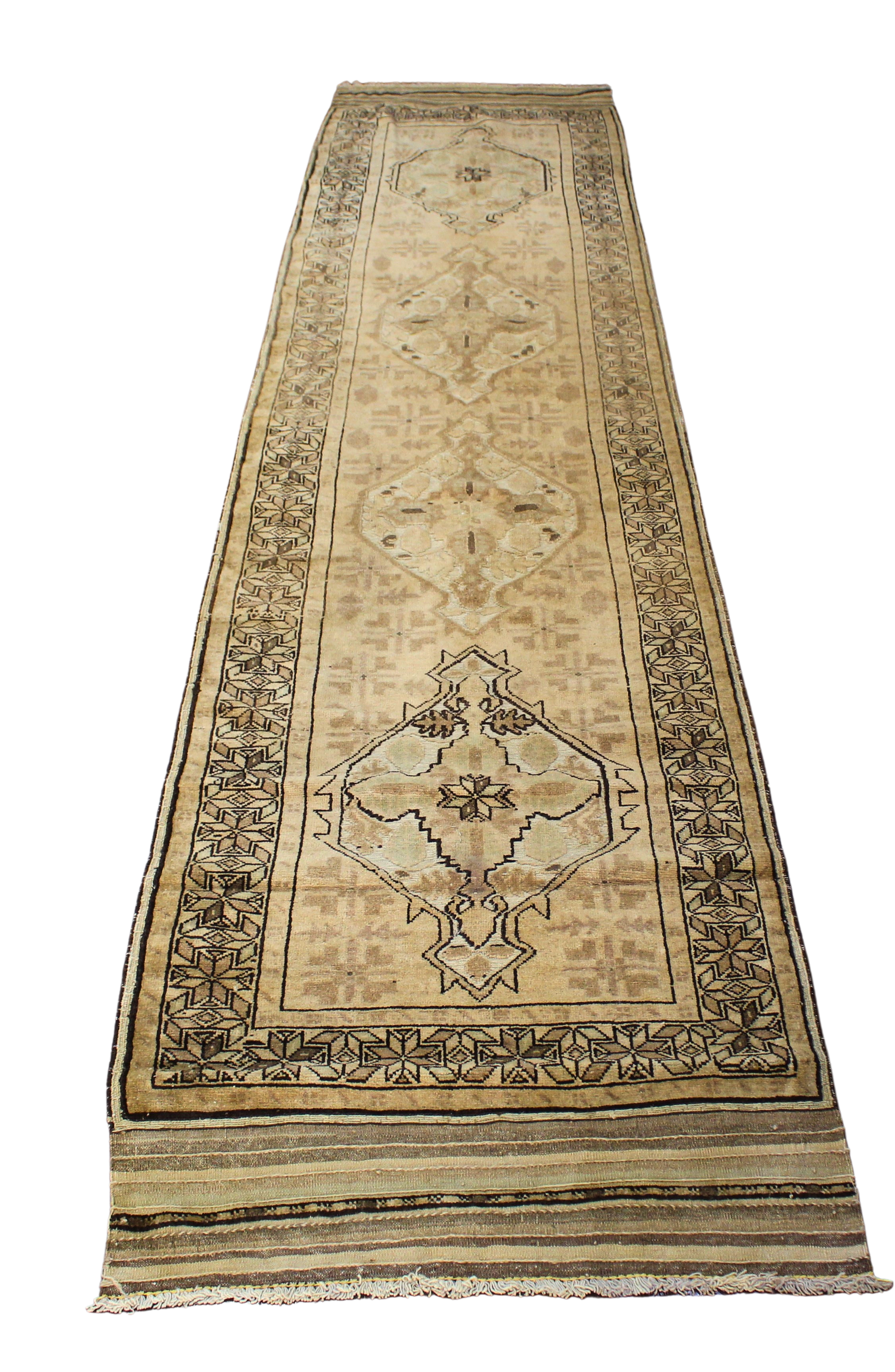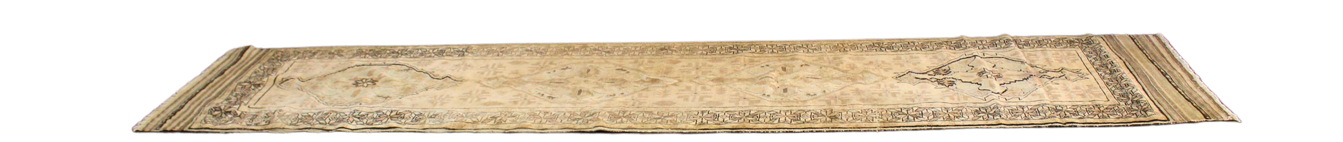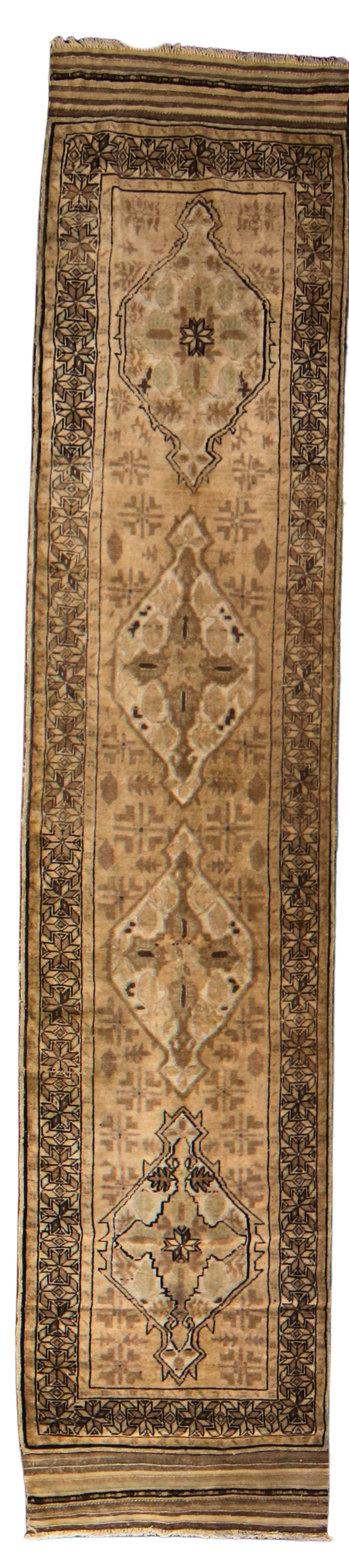Graceful and understated, this antique Afghan runner (2.7 × 12 ft) delivers timeless elegance through its structured composition and muted palette. A sequence of angular diamond medallions anchors the central field, rendered in soft camel, faded olive, and hints of charcoal — a palette softened beautifully by age. Framing the rug is a distinctive geometric border with star-like rosettes that add subtle rhythm and balance to the piece.