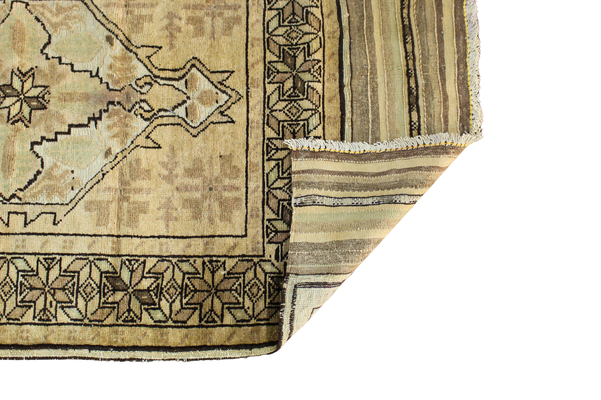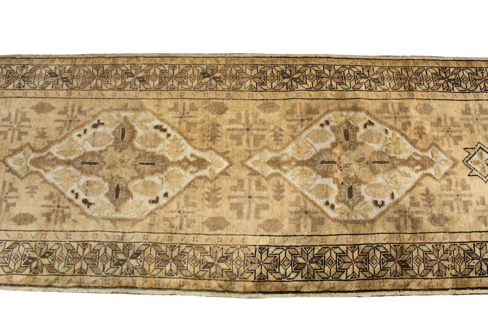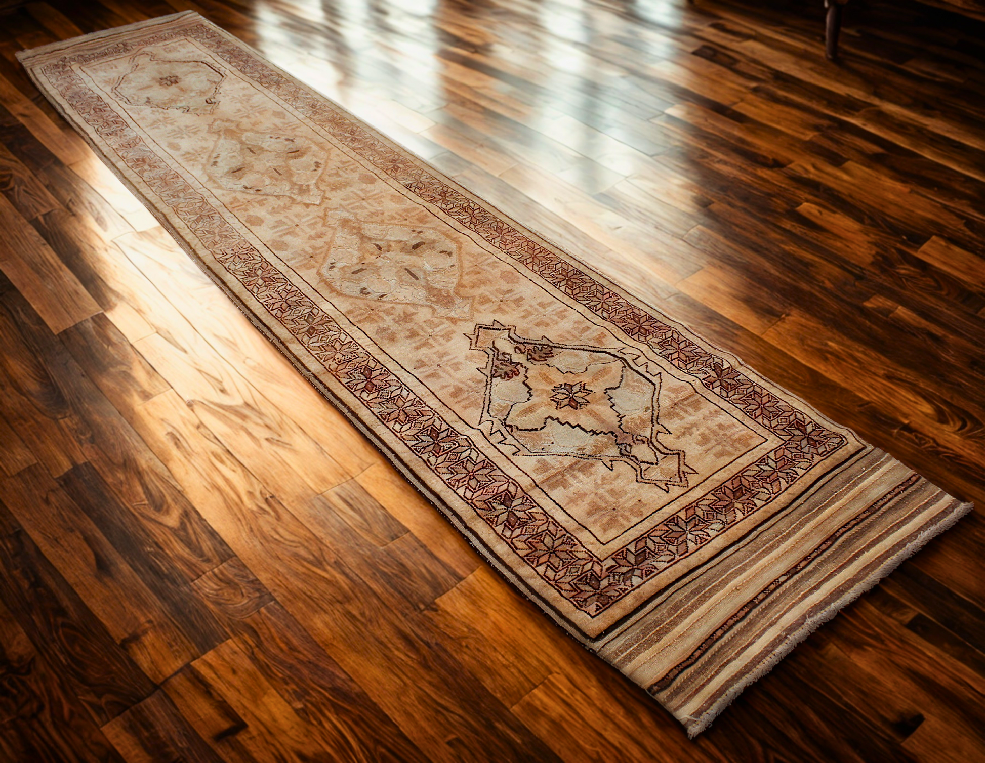 Graceful and understated, this antique Afghan runner (2.7 × 12 ft) delivers timeless elegance through its structured composition and muted palette. A sequence of angular diamond medallions anchors the central field, rendered in soft camel, faded olive, and hints of charcoal — a palette softened beautifully by age. Framing the rug is a distinctive geometric border with star-like rosettes that add subtle rhythm and balance to the piece.
