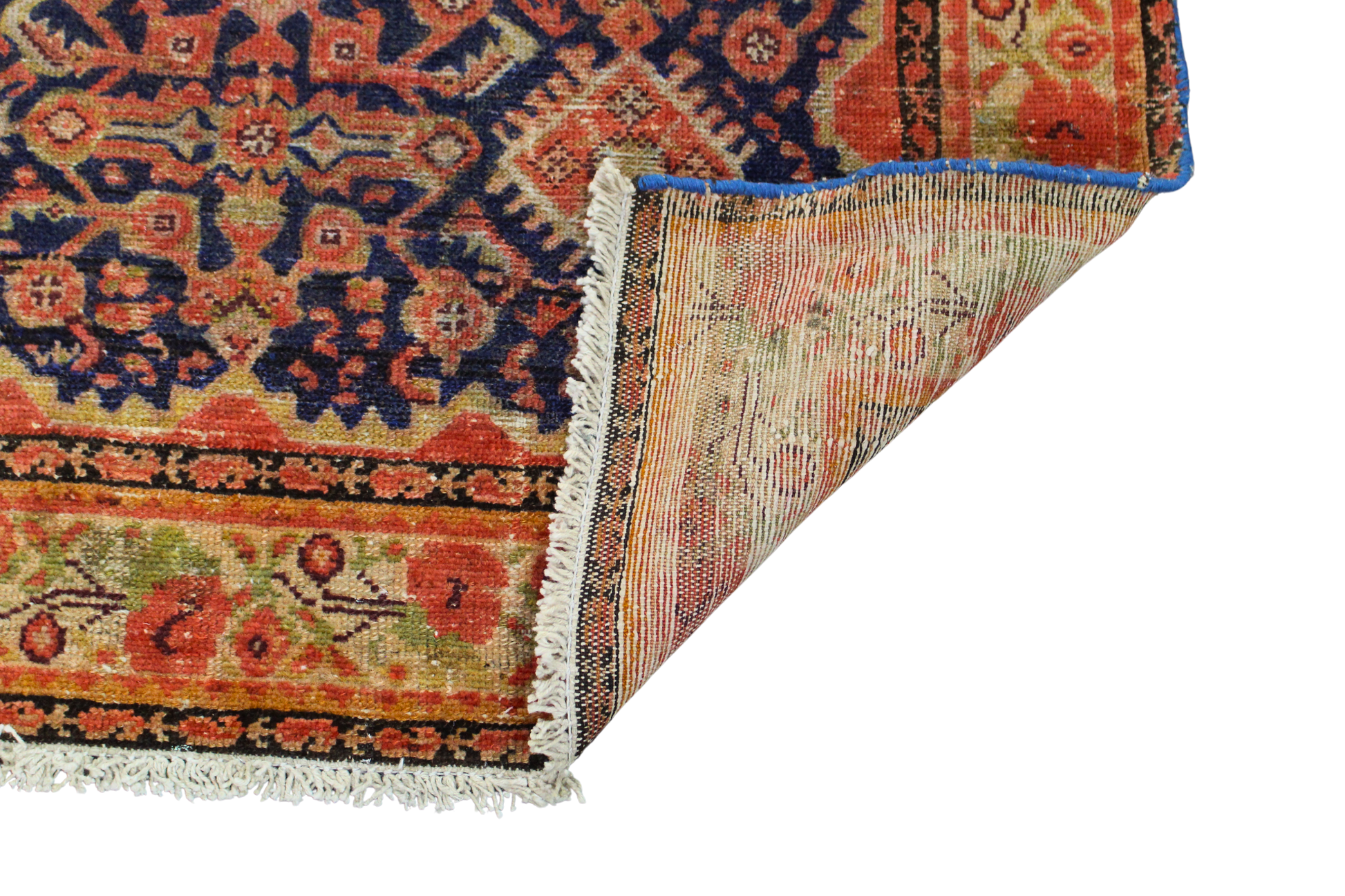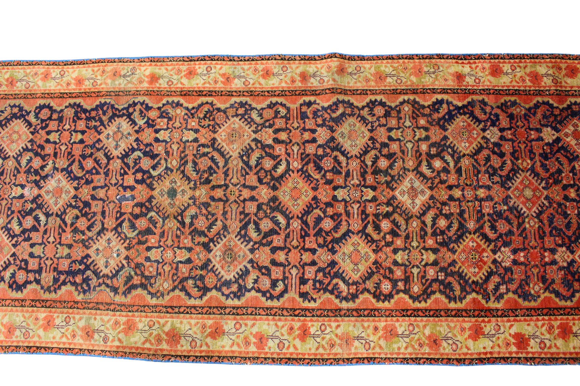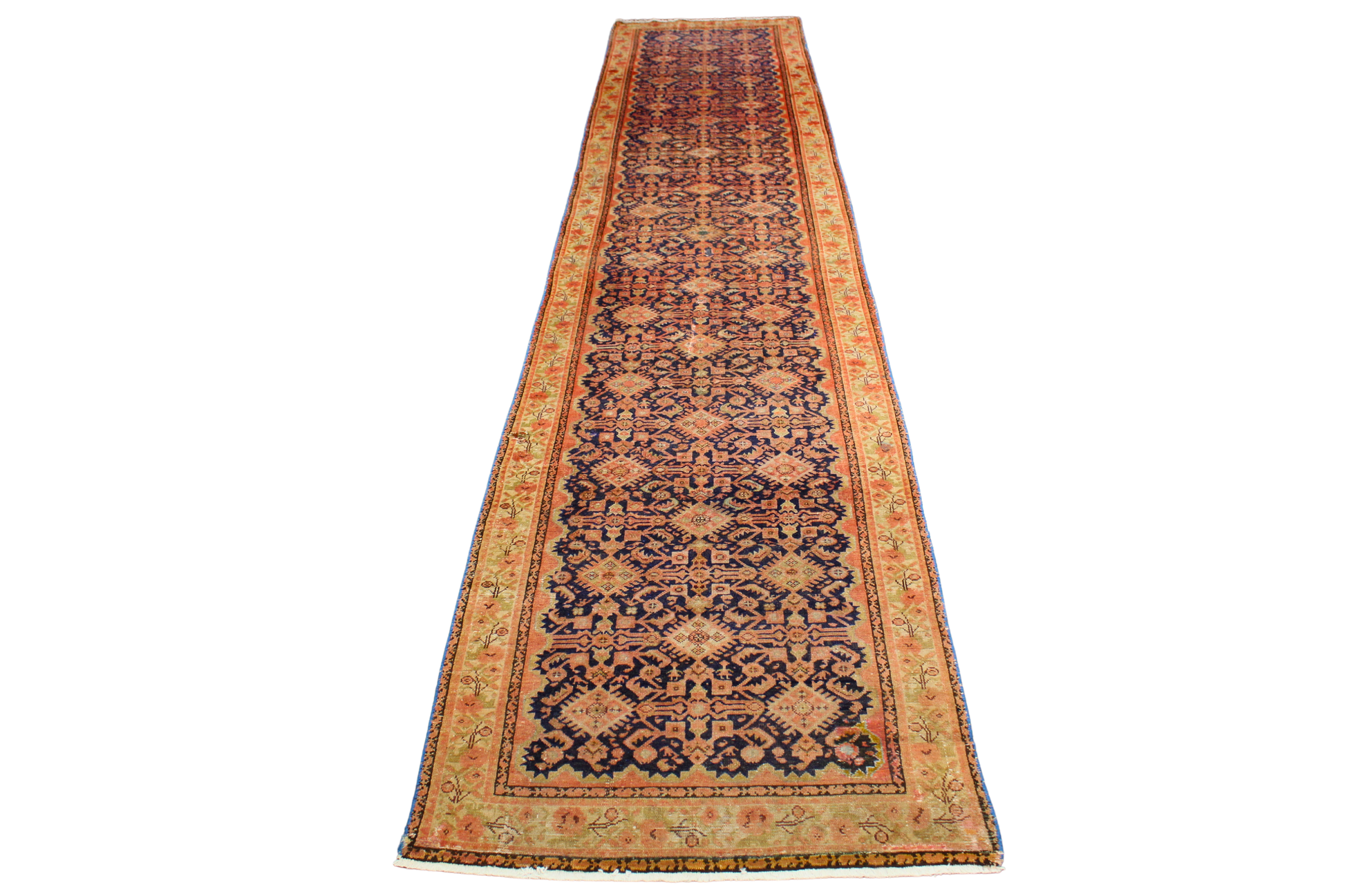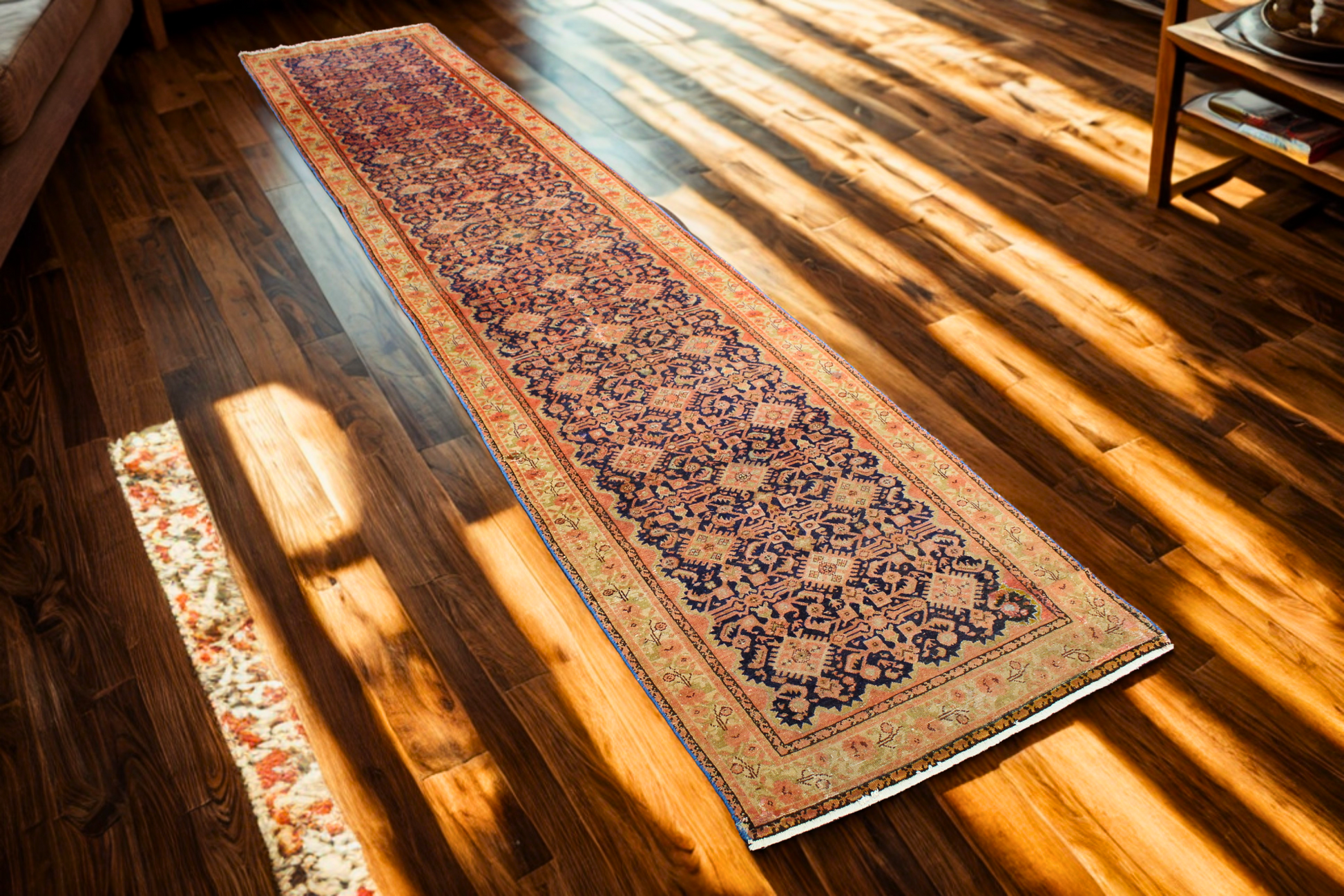 Brimming with regal rhythm and tribal complexity, this antique Persian Malayer runner (3.3 × 16.4 ft) commands attention with its deeply saturated palette and dense field of floral latticework. The navy ground is filled with a diagonal grid of rosettes and hooked diamonds, bracketed by jagged-leaf tendrils and stylized birds — a signature motif in village weavings from the region.