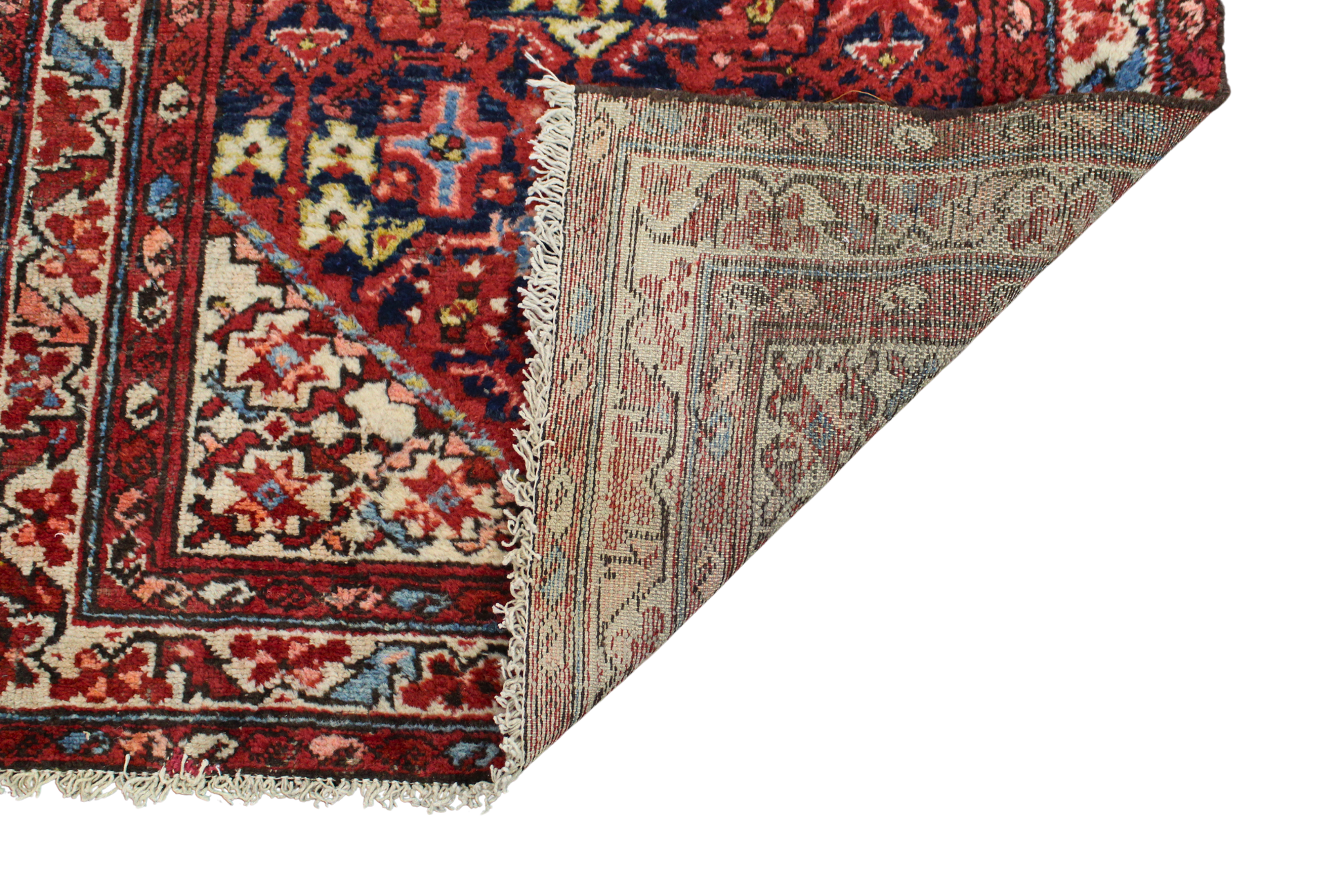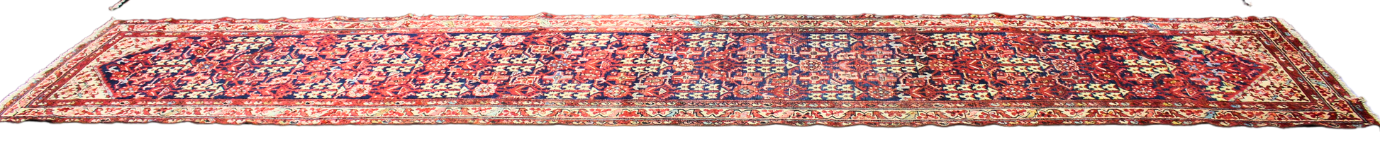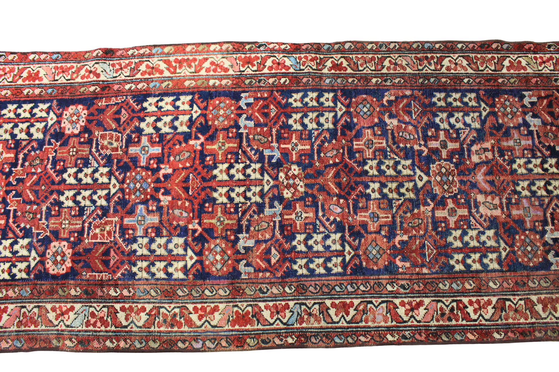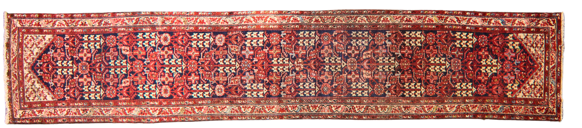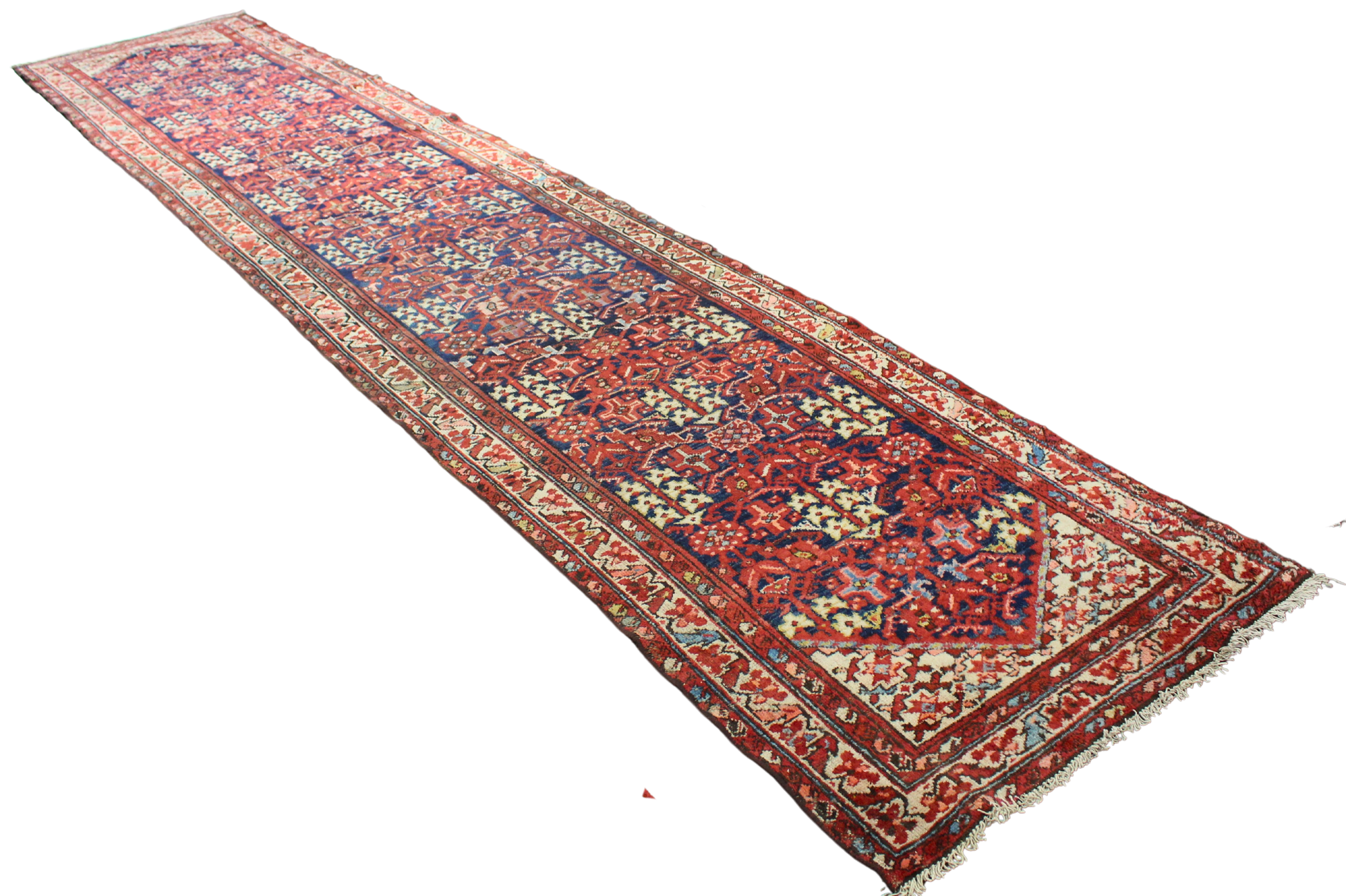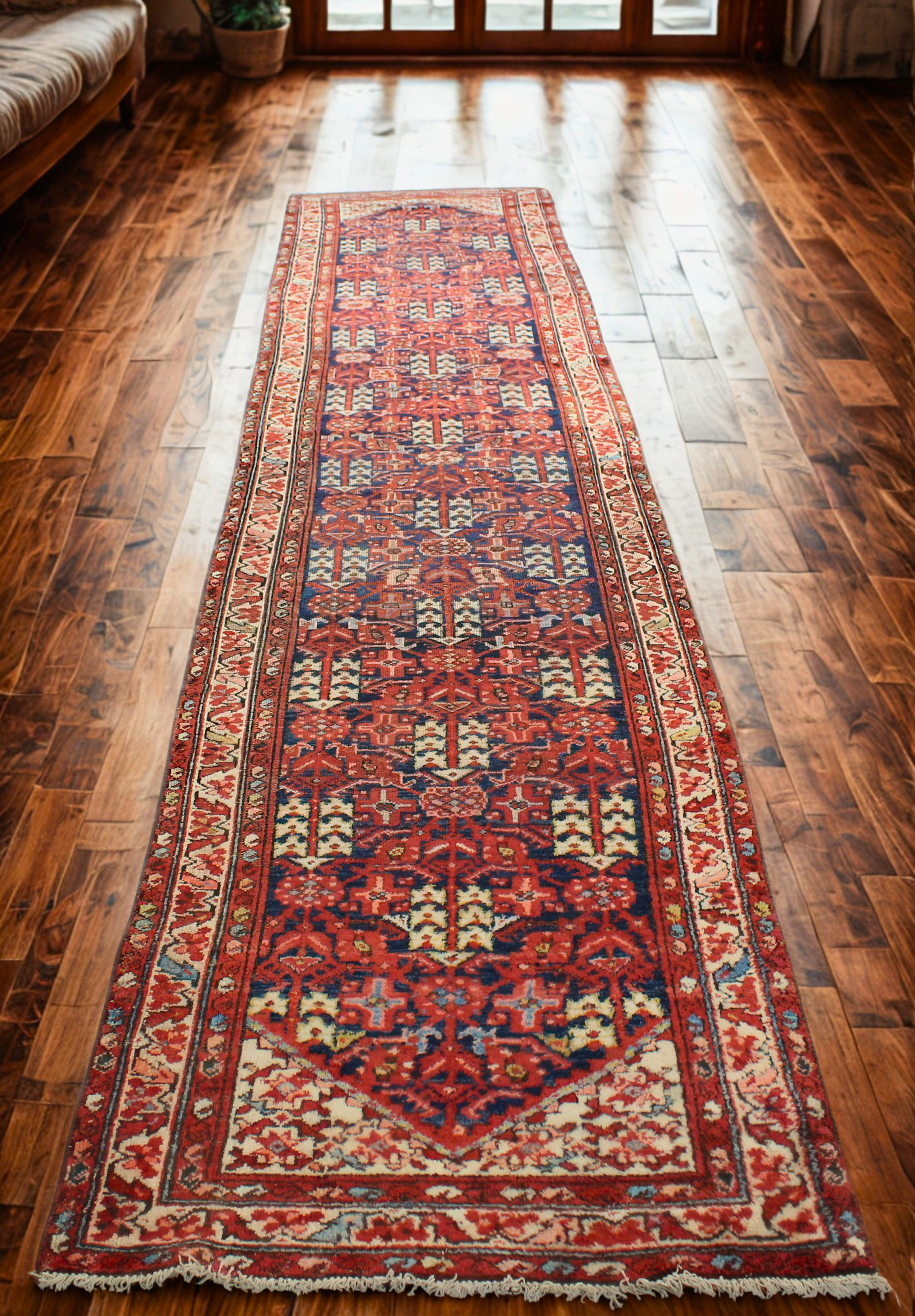 This antique Malayer runner from persian (3.2 × 15 ft) captures the essence of Persian village weaving with its richly layered, tightly structured field and warm, saturated palette. The design is built around a repeating lattice of stylized floral medallions and angular cross motifs, rendered in rust, brick, ivory, and midnight blue — evoking both movement and symmetry.