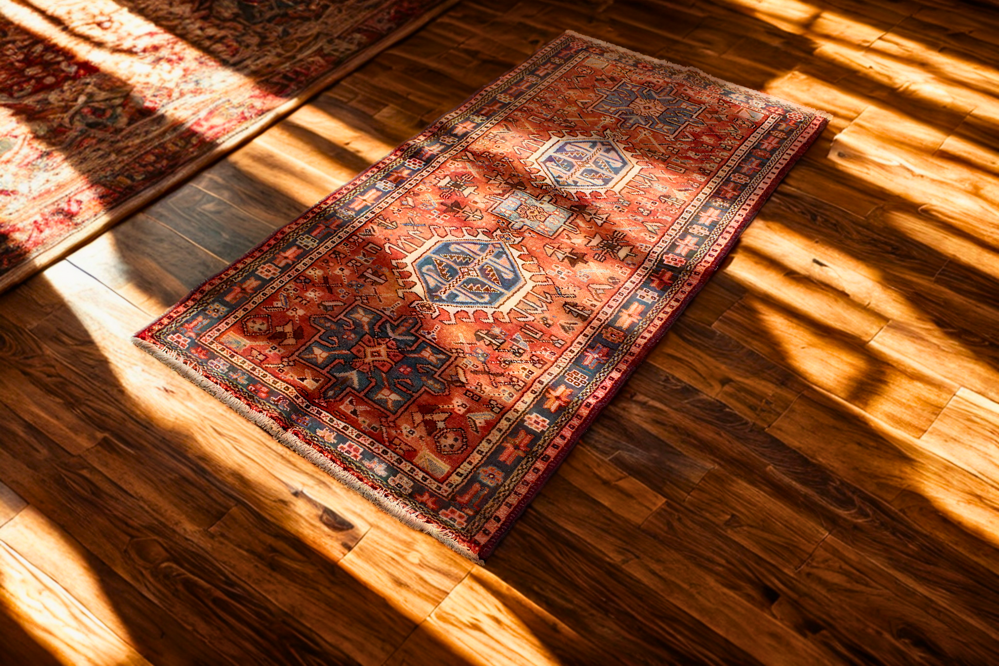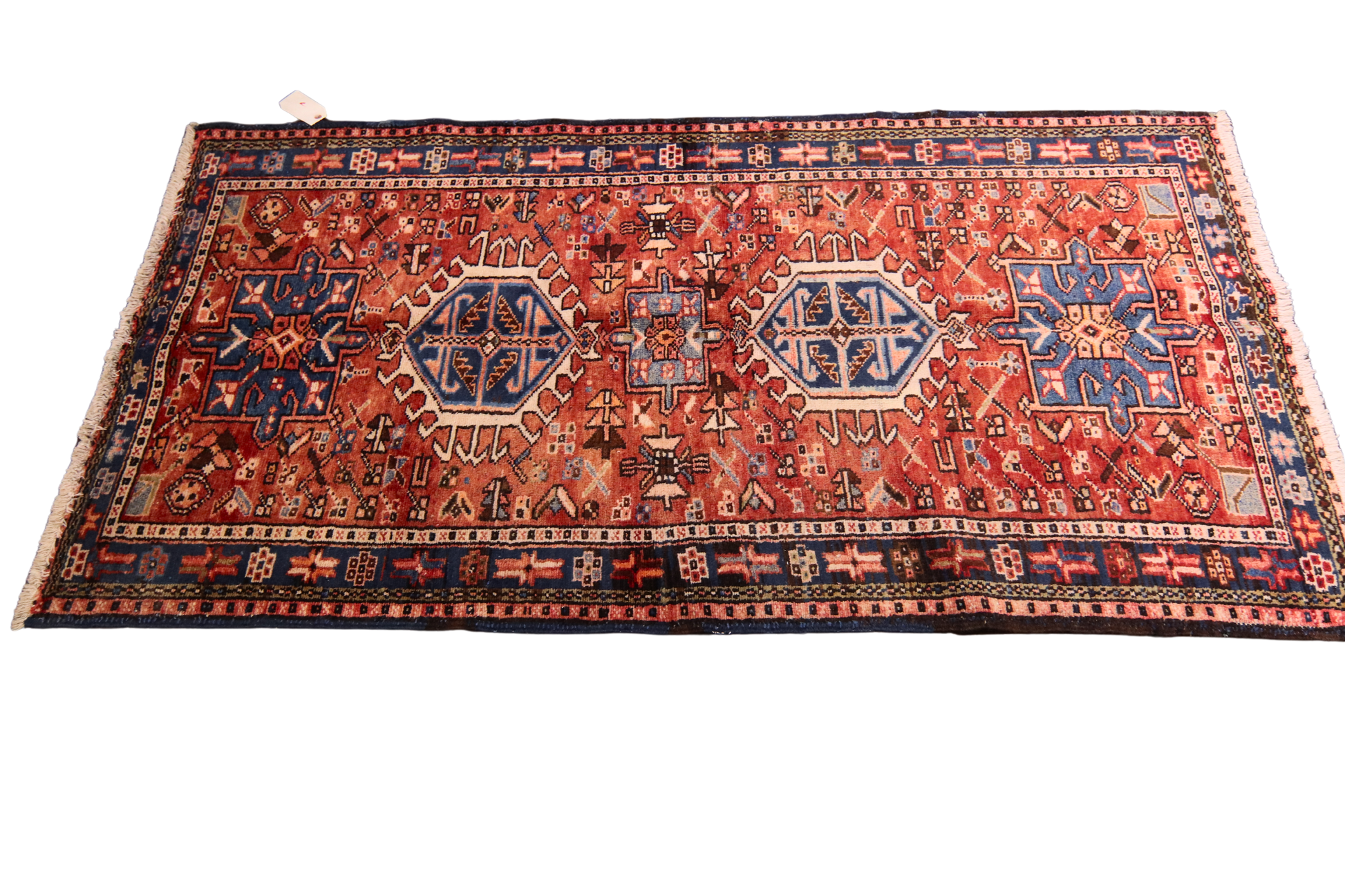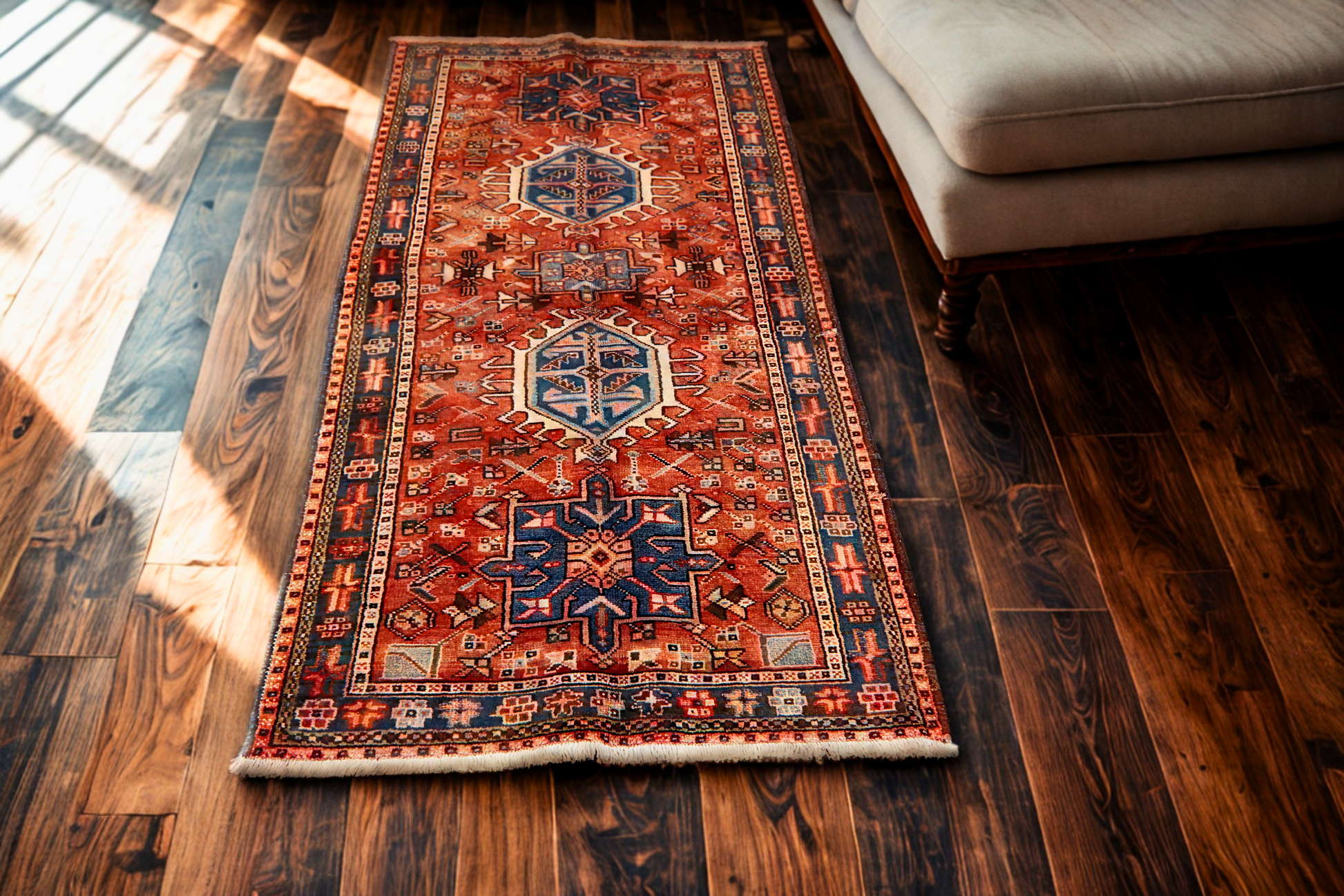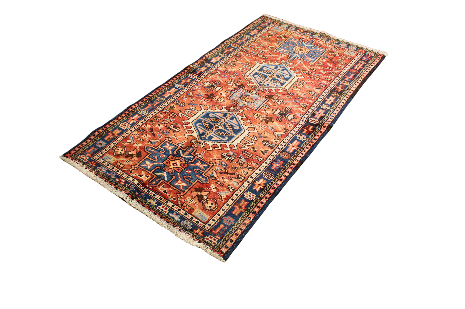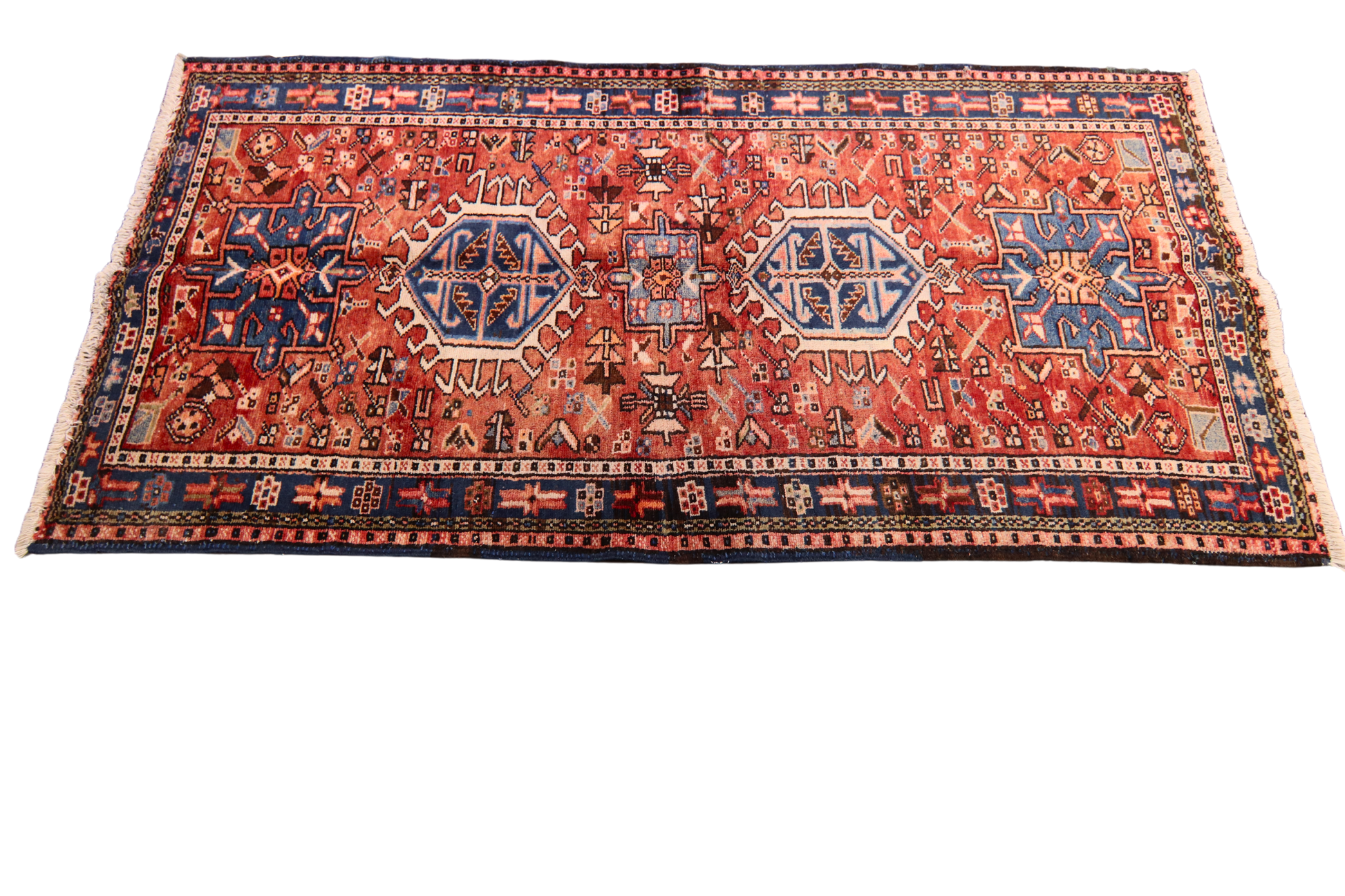 This antique Heriz rug (3.3 × 6.2 ft) displays the robust, angular elegance that defines the Heriz weaving tradition. Its vivid layout features three powerful octagonal medallions in cobalt and ivory, flanked by branching motifs and stepped floral elements on a bold brick-red field. The strong graphic drawing and spacious layout give the design a sense of stability and movement all at once.