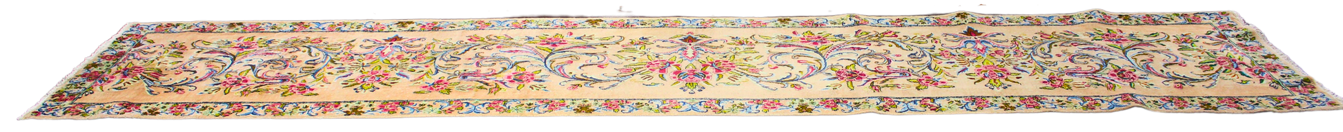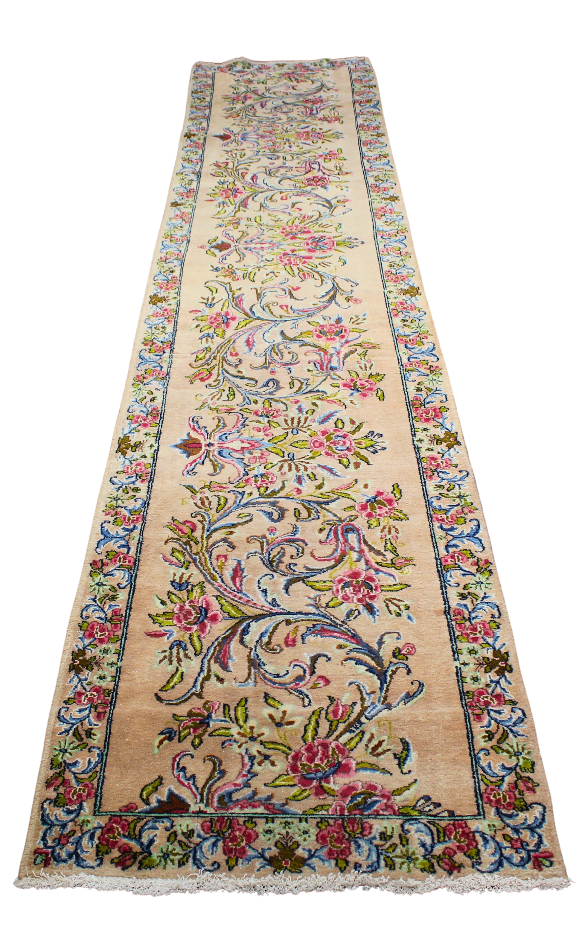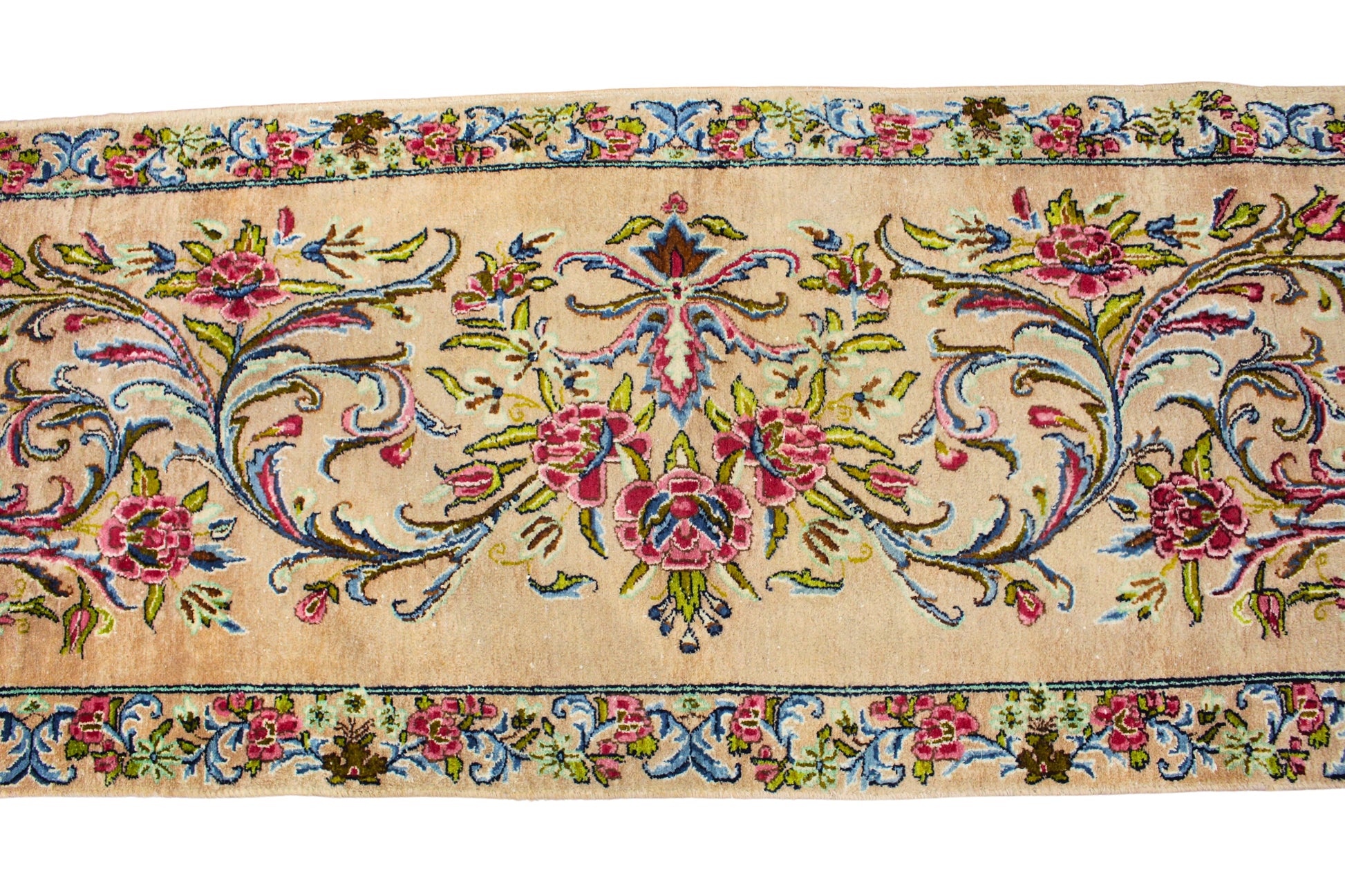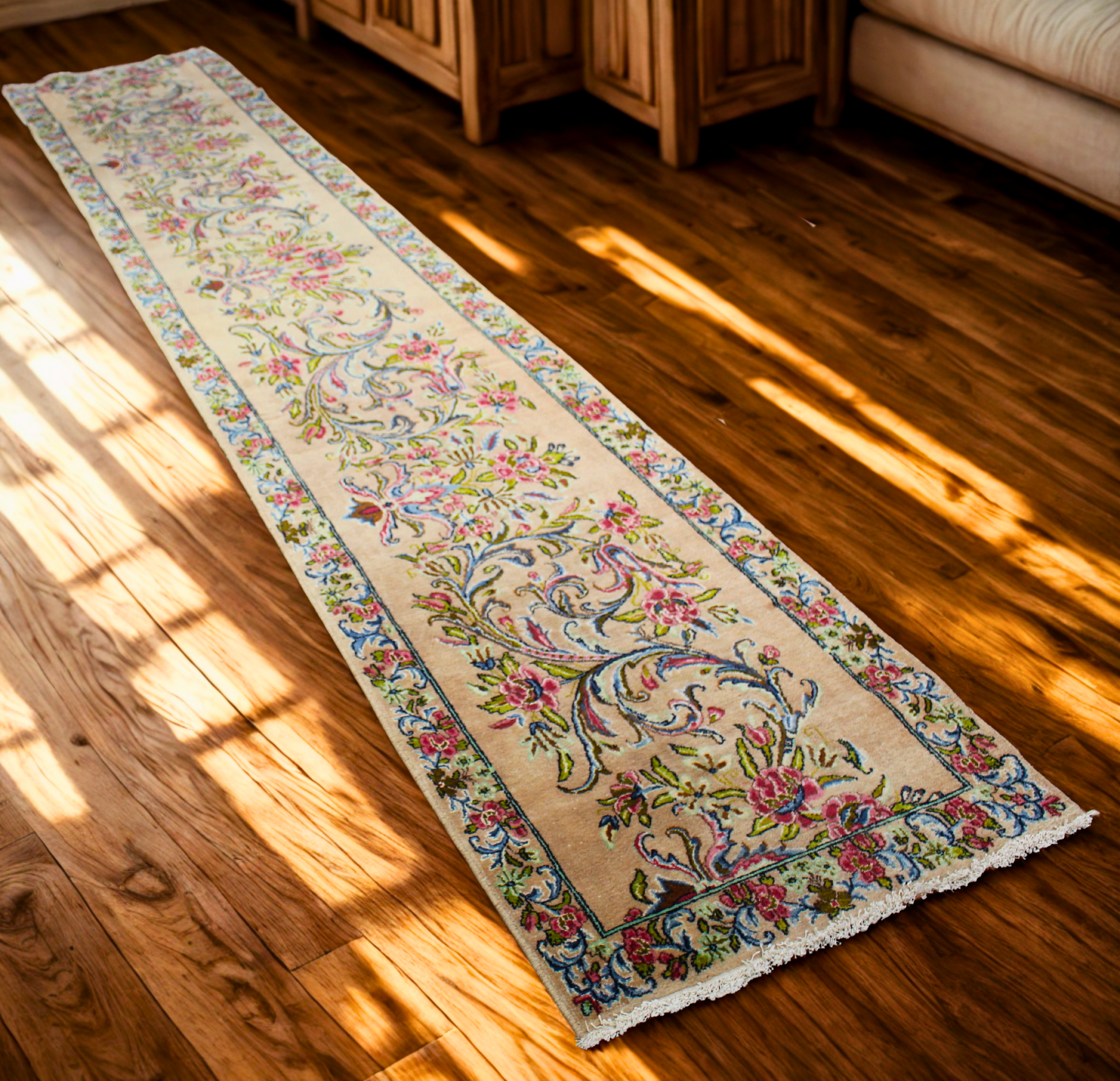 Delicate yet exuberant, this antique Persian Kerman runner (2.9 × 14.10 ft) is a floral masterpiece brimming with romance and refinement. The soft ivory ground serves as a luminous canvas for a garden of painterly roses, swirling vines, and blossoming palmettes — all rendered in vivid shades of ruby red, emerald green, cornflower blue, and golden saffron.