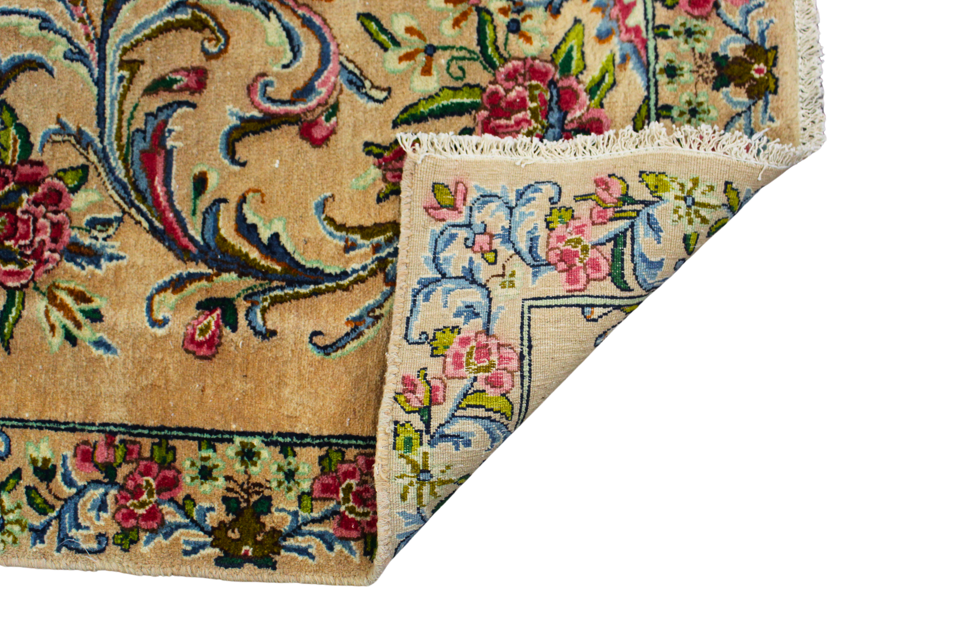 The symmetrical layout breathes balance into the lively composition, while the lush botanical border frames the central field like an ornate picture frame. Known for their artistic expression and refined colorwork, Kerman weavings are treasured for both their beauty and their cultural heritage. This runner’s graceful curves and delicate motifs make it a perfect choice for light-filled hallways or in front of a French console.