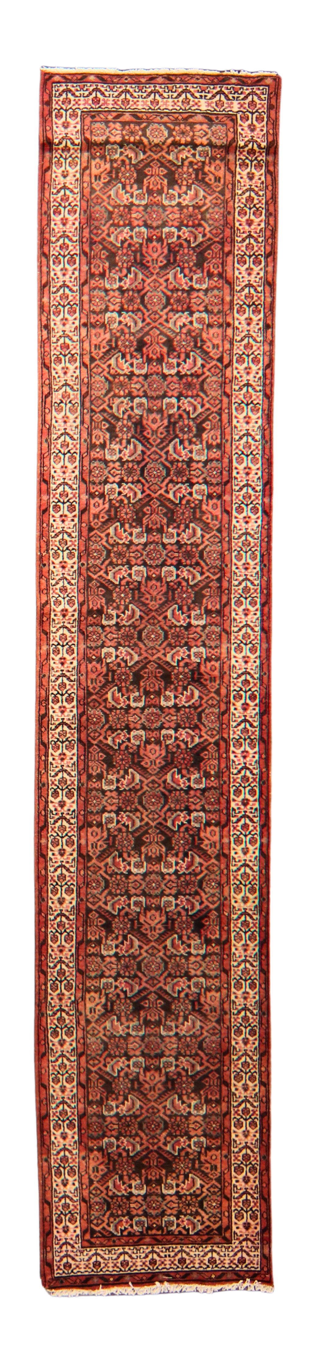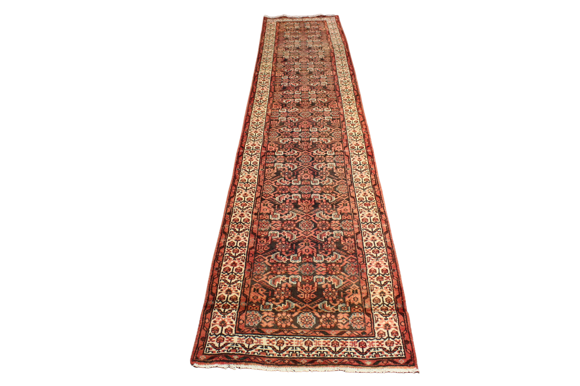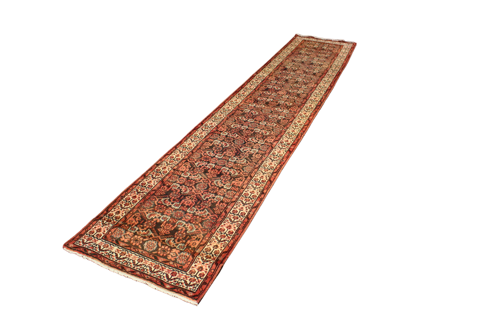 With its elongated proportions and intricate tribal latticework, this antique Malayer runner from Persia (2.6 × 13.4 ft) brings timeless character to hallways or transitional spaces. Its tightly packed geometric motifs, rendered in a warm palette of terracotta, brick red, indigo, and ivory, are framed by striking ivory guard borders adorned with floral rosettes and scrolling vines.