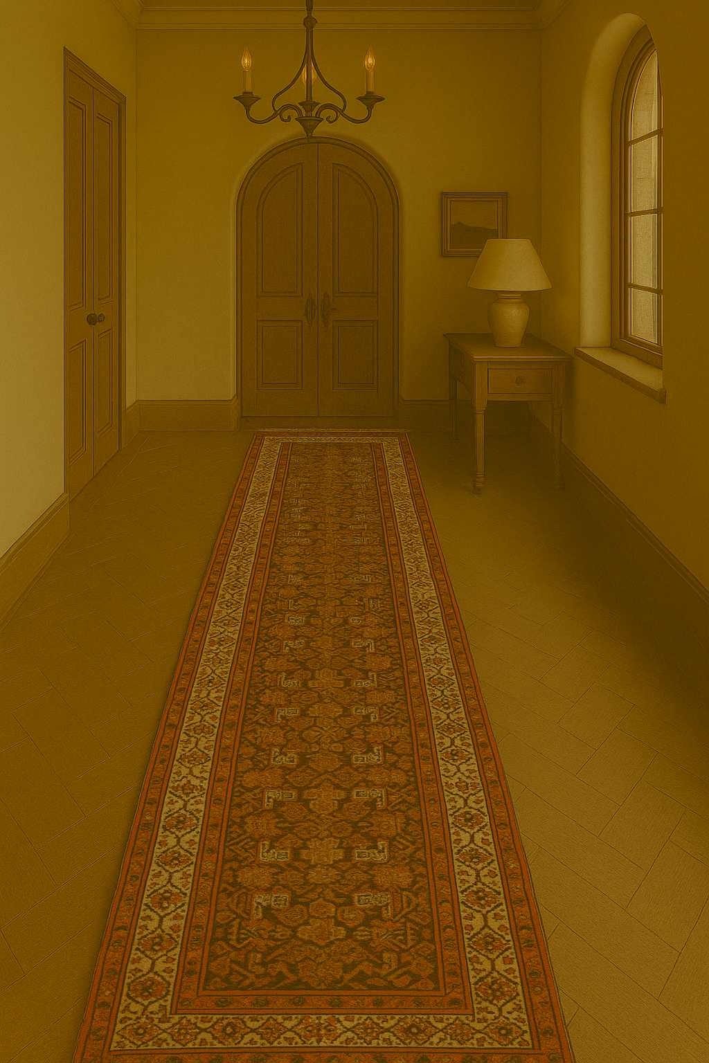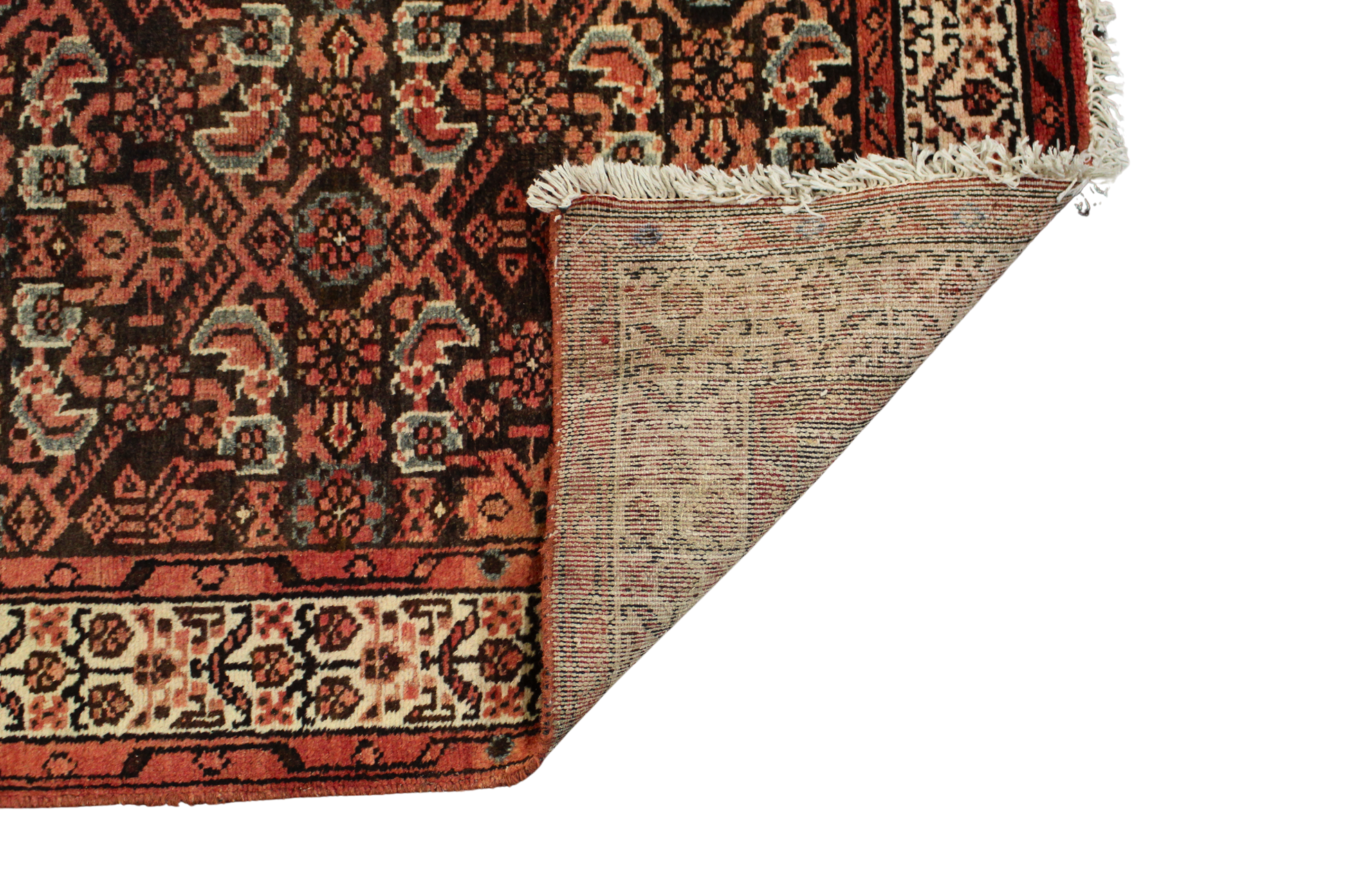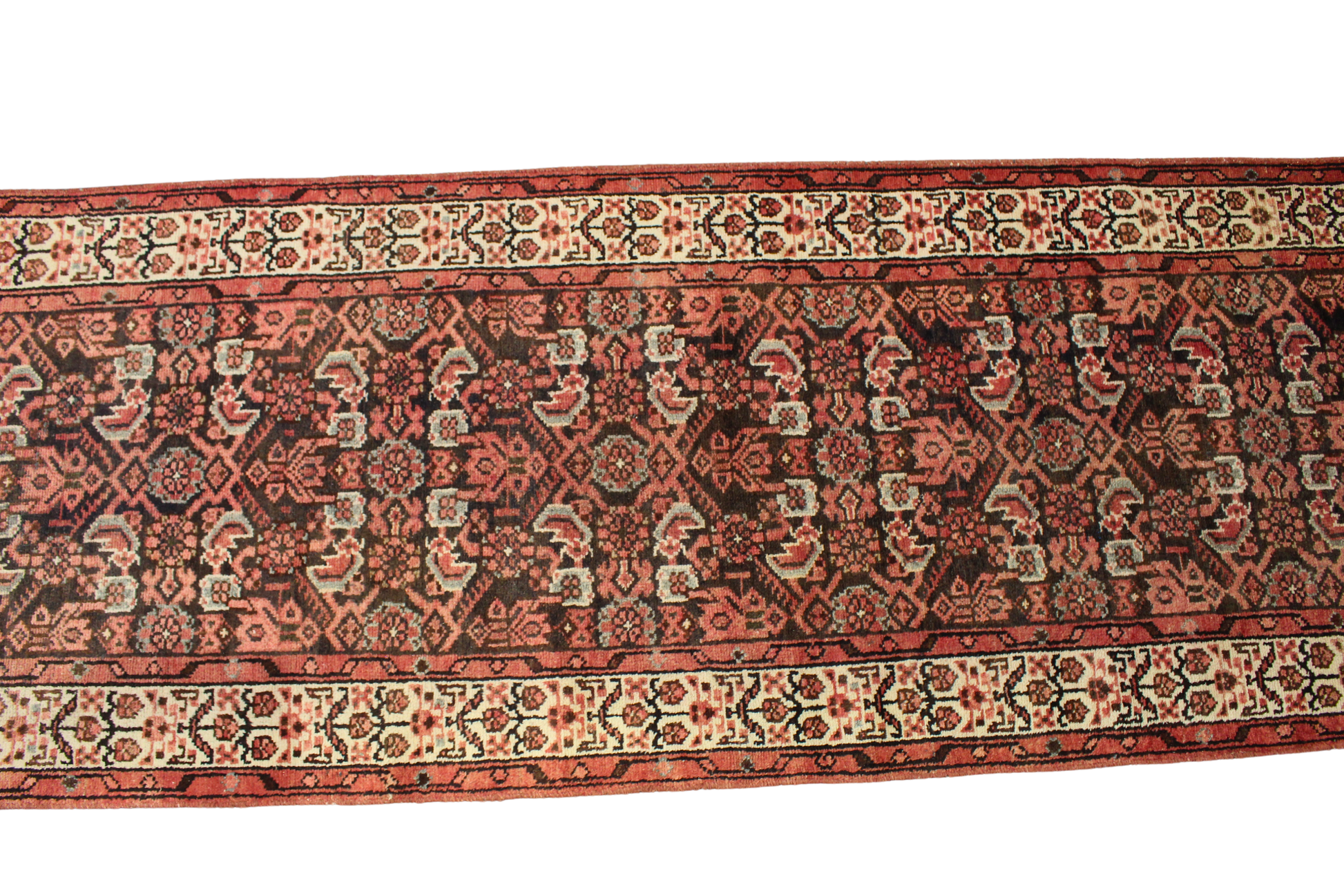 With its elongated proportions and intricate tribal latticework, this antique Malayer runner from Persia (2.6 × 13.4 ft) brings timeless character to hallways or transitional spaces. Its tightly packed geometric motifs, rendered in a warm palette of terracotta, brick red, indigo, and ivory, are framed by striking ivory guard borders adorned with floral rosettes and scrolling vines.