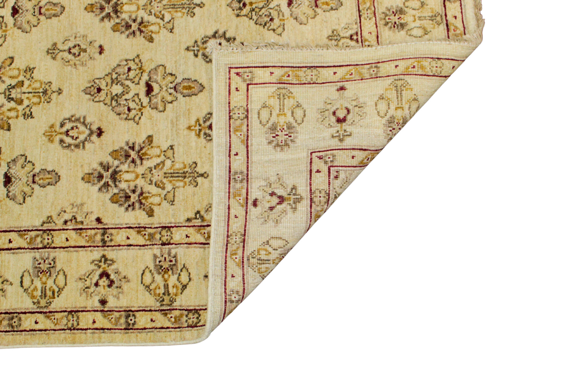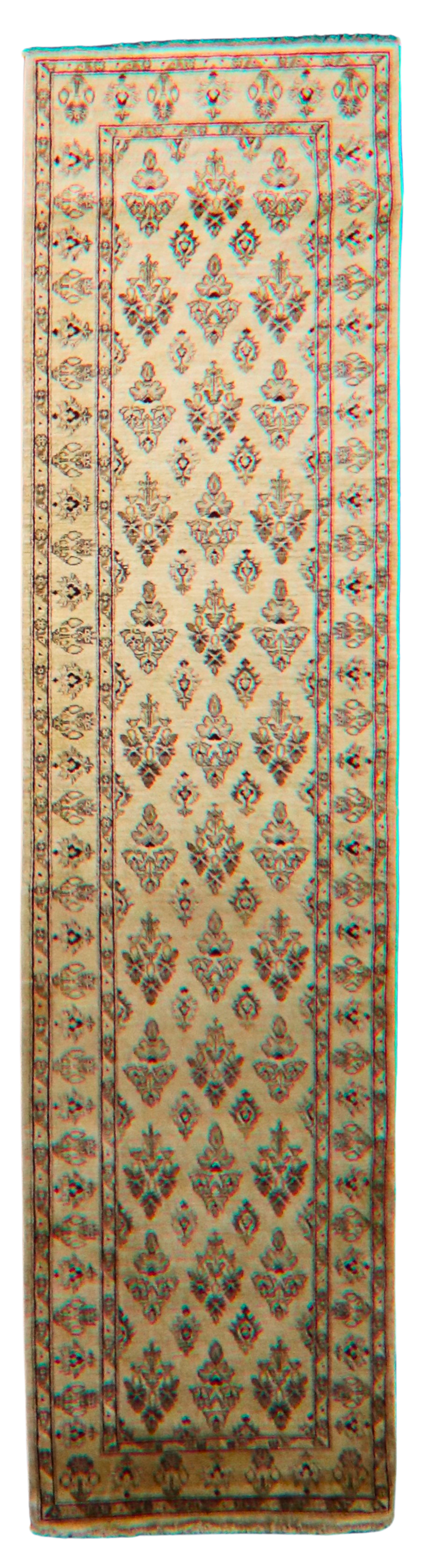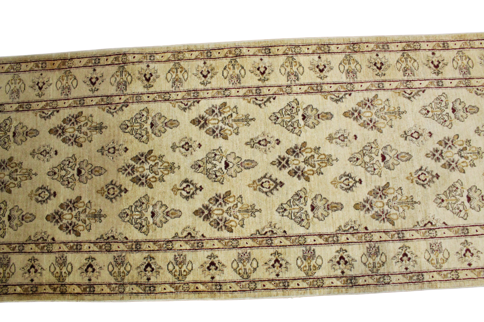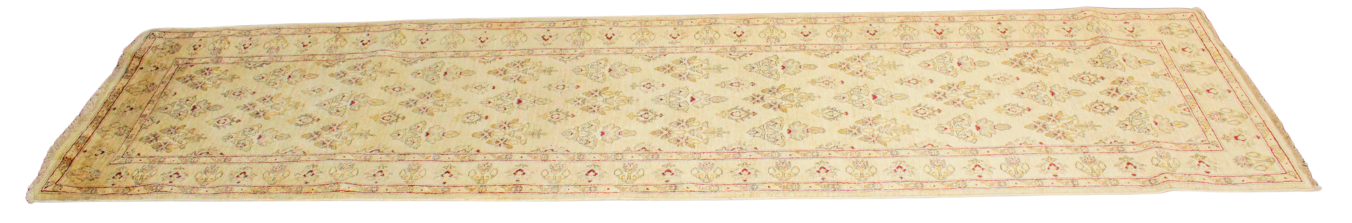 Elegant and refined, this Pakistani Oushak runner features a regal allover floral repeat in a beautifully spaced, symmetrical arrangement. Set against an ivory ground, the scrolling palmettes and boteh-style motifs unfold in gentle tones of mocha, muted sage, and soft teal. The wide border, framed with stylized tulip forms, brings a classic finish to this piece, making it an ideal runner for sophisticated interiors with a light, traditional palette.