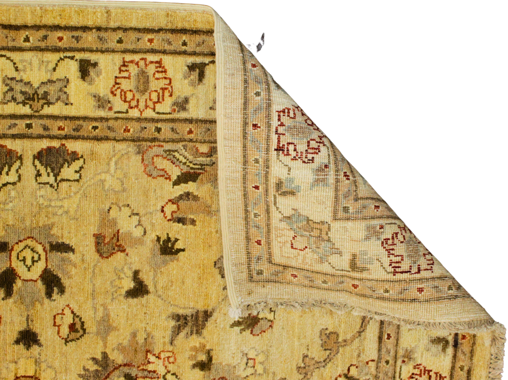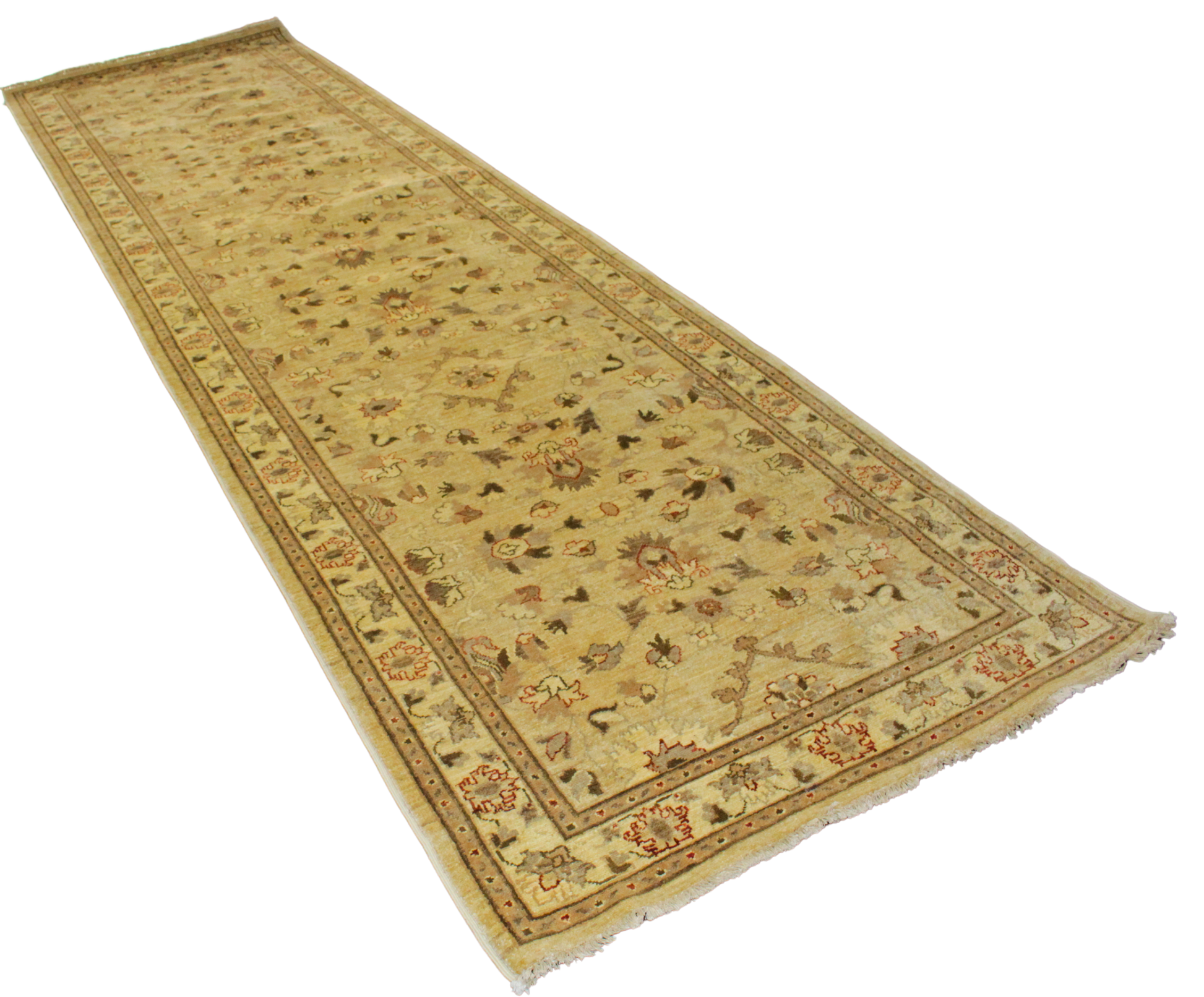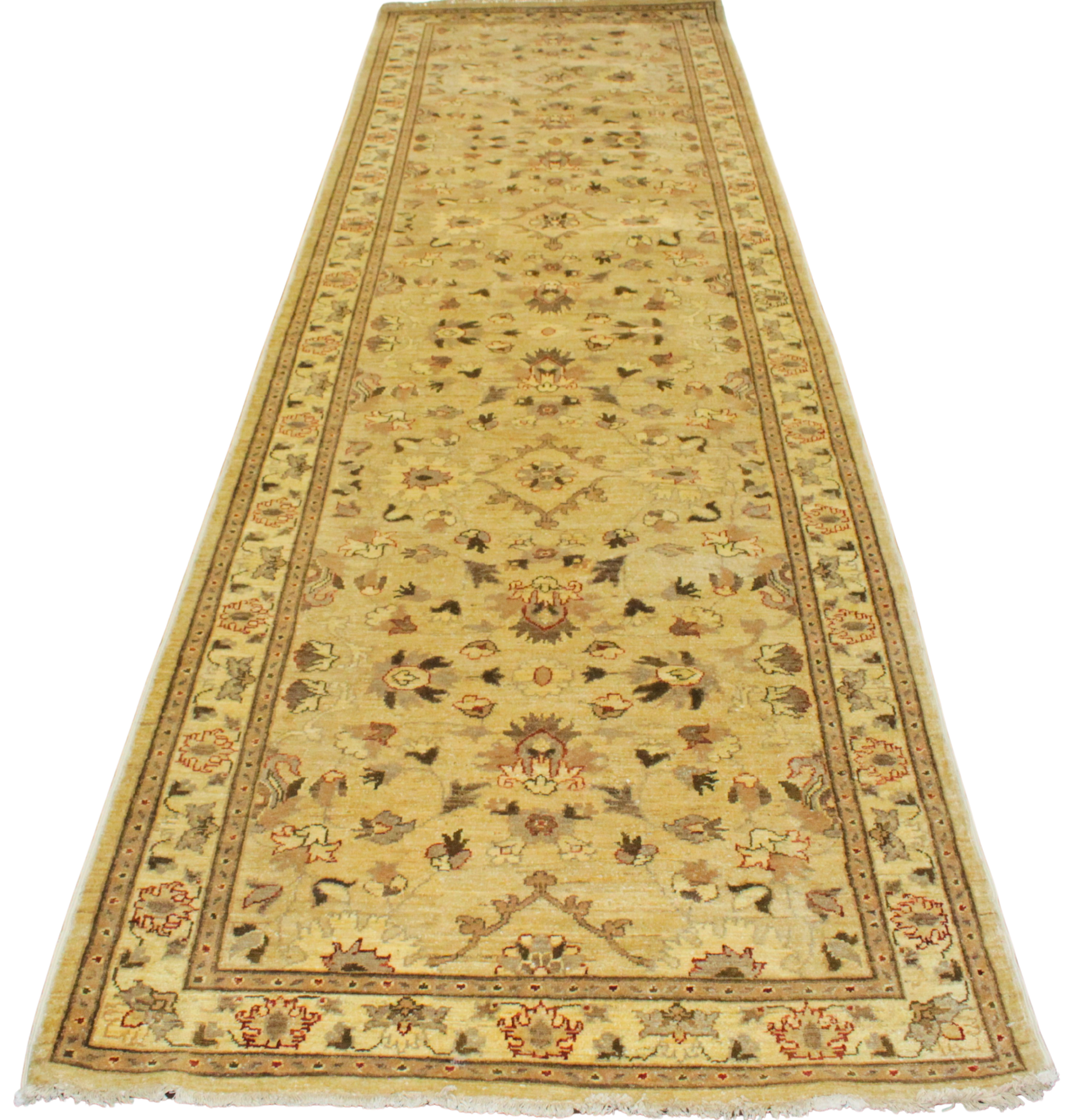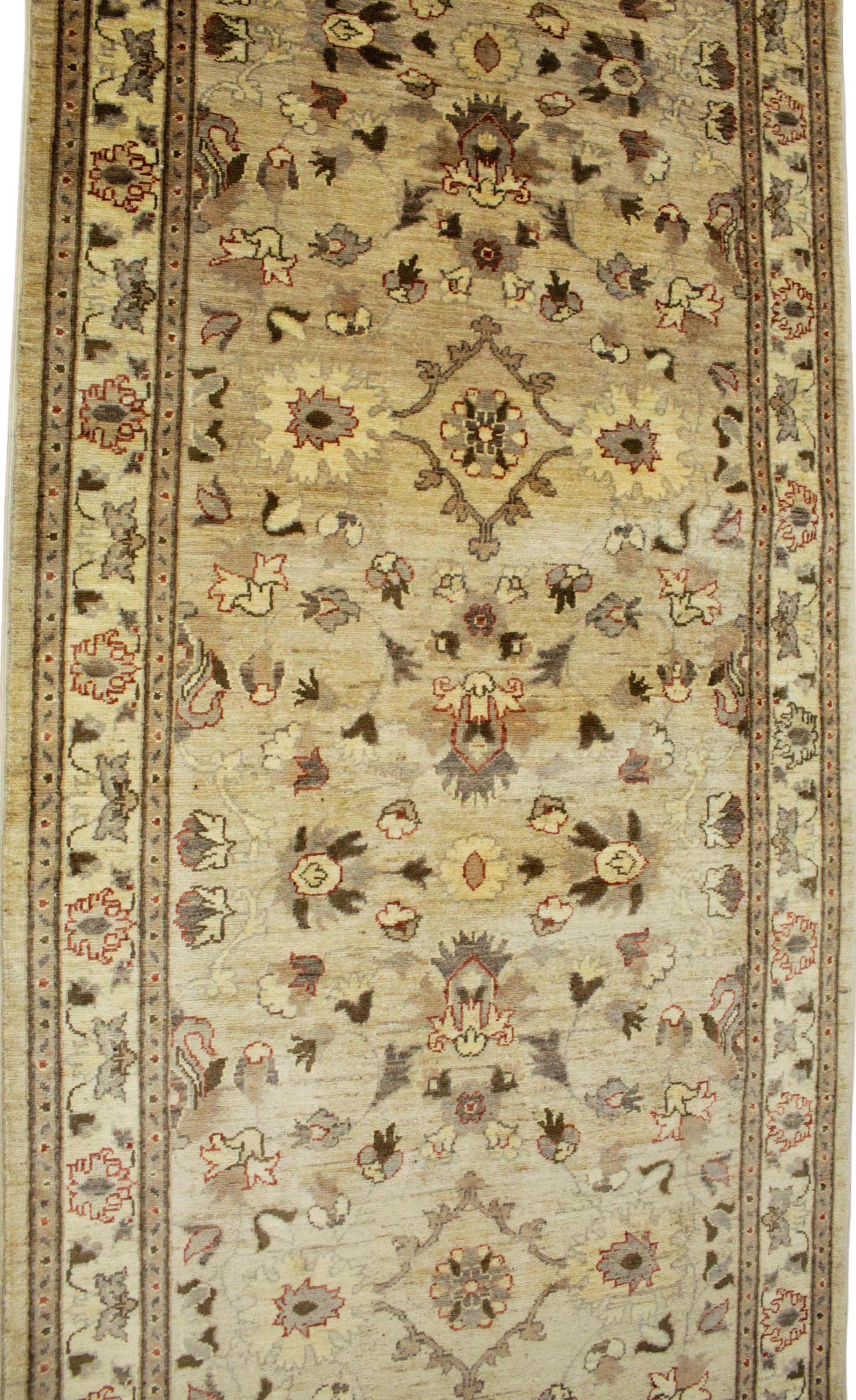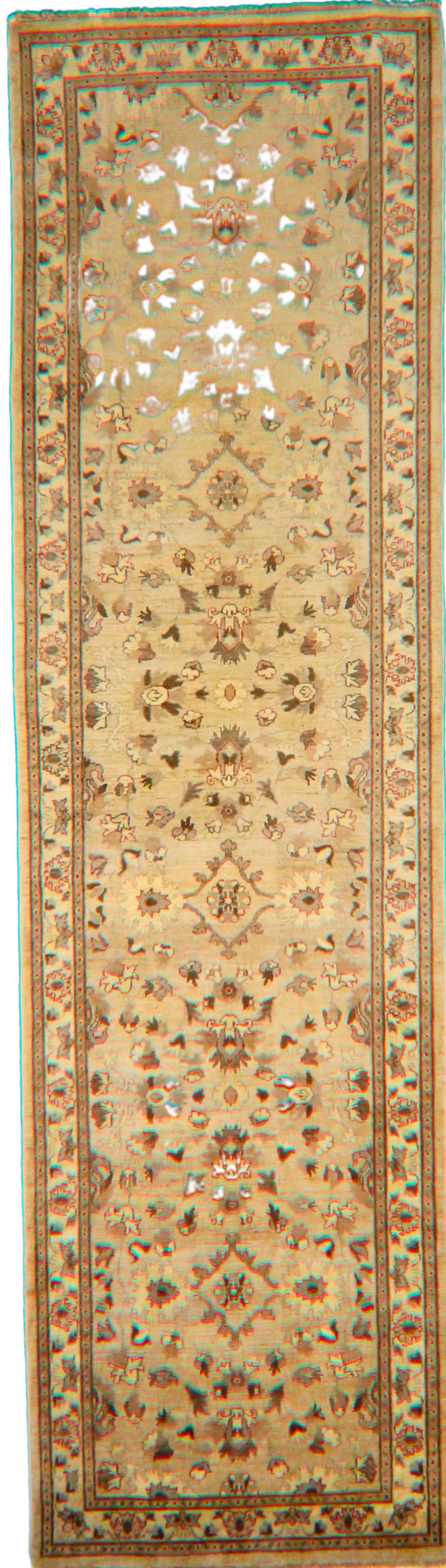 Gracefully stretching over 14 feet, this Afghan runner (3.10 × 14 ft) transforms any corridor into a gallery of classic craftsmanship. Woven with precision in warm neutral tones, it features a delicate lattice of palmettes, rosettes, and stylized vines mirrored in perfect symmetry. The soft ivory field sets the stage for shades of camel, walnut, rust, and olive — giving the rug a timeless, heirloom feel without overwhelming its surroundings.