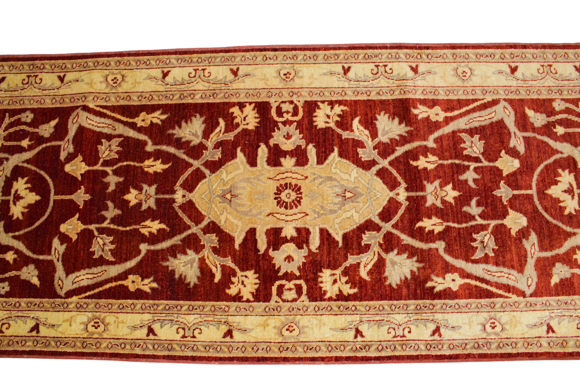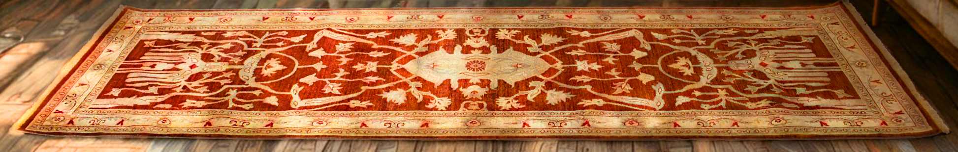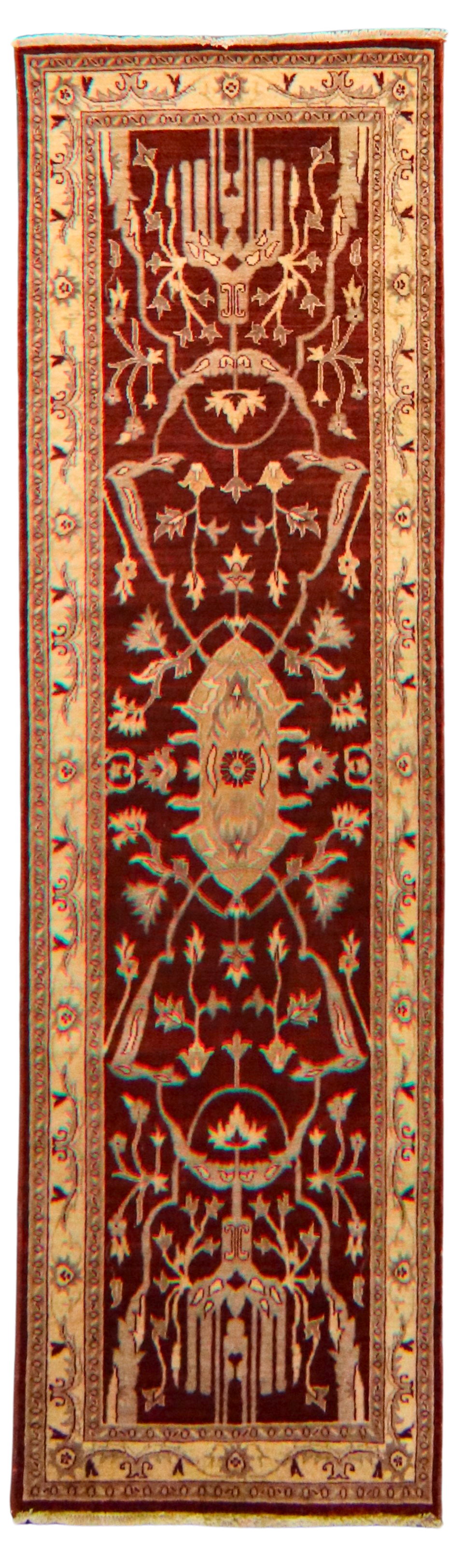 A study in bold refinement, this hand-knotted Oushak runner from Pakistan (3.3 × 10.1 ft) blends Ottoman tradition with rich contrast. The deep ruby-red field serves as a dramatic backdrop for stylized palmettes, delicate vinery, and a central medallion — all rendered in warm ivory with subtle mocha accents. The balanced, symmetrical design adds a regal formality, while the fine wool weave gives it soft texture and a subtle sheen under light.