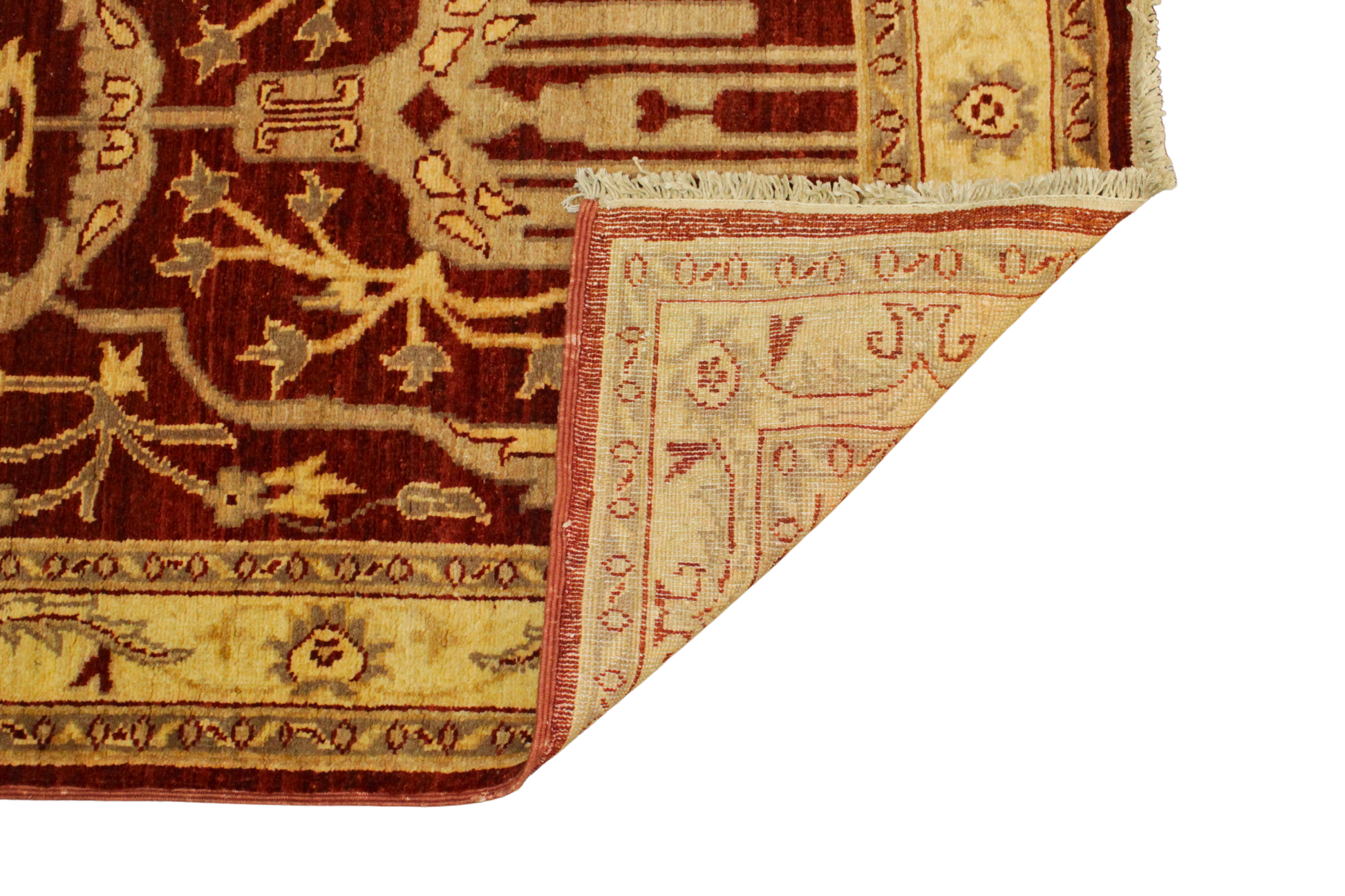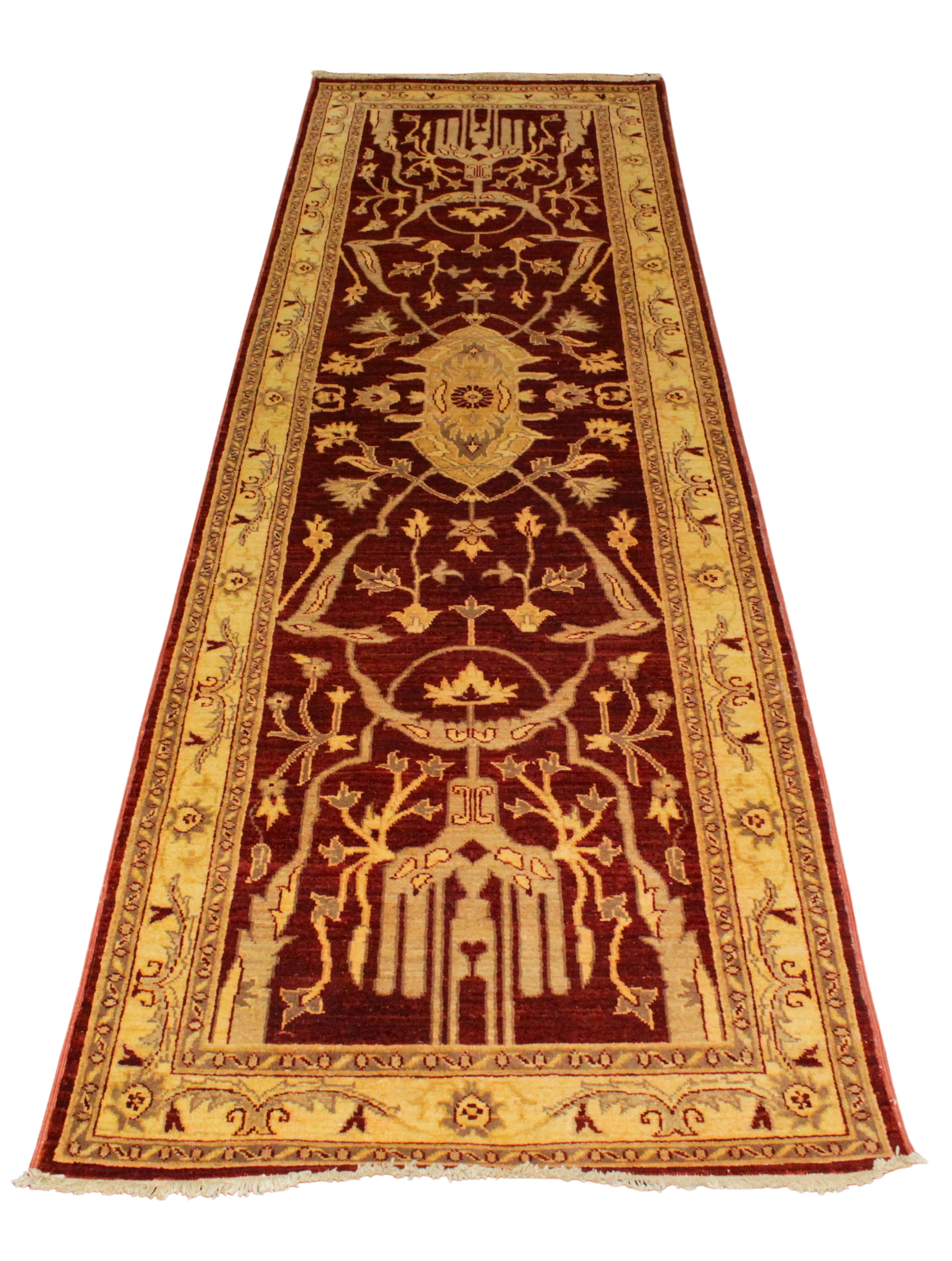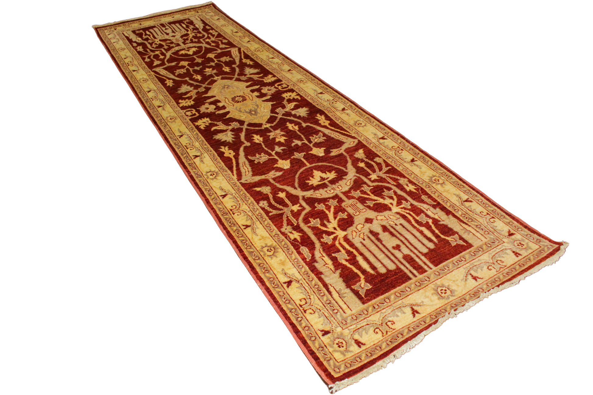 A study in bold refinement, this hand-knotted Oushak runner from Pakistan (3.3 × 10.1 ft) blends Ottoman tradition with rich contrast. The deep ruby-red field serves as a dramatic backdrop for stylized palmettes, delicate vinery, and a central medallion — all rendered in warm ivory with subtle mocha accents. The balanced, symmetrical design adds a regal formality, while the fine wool weave gives it soft texture and a subtle sheen under light.