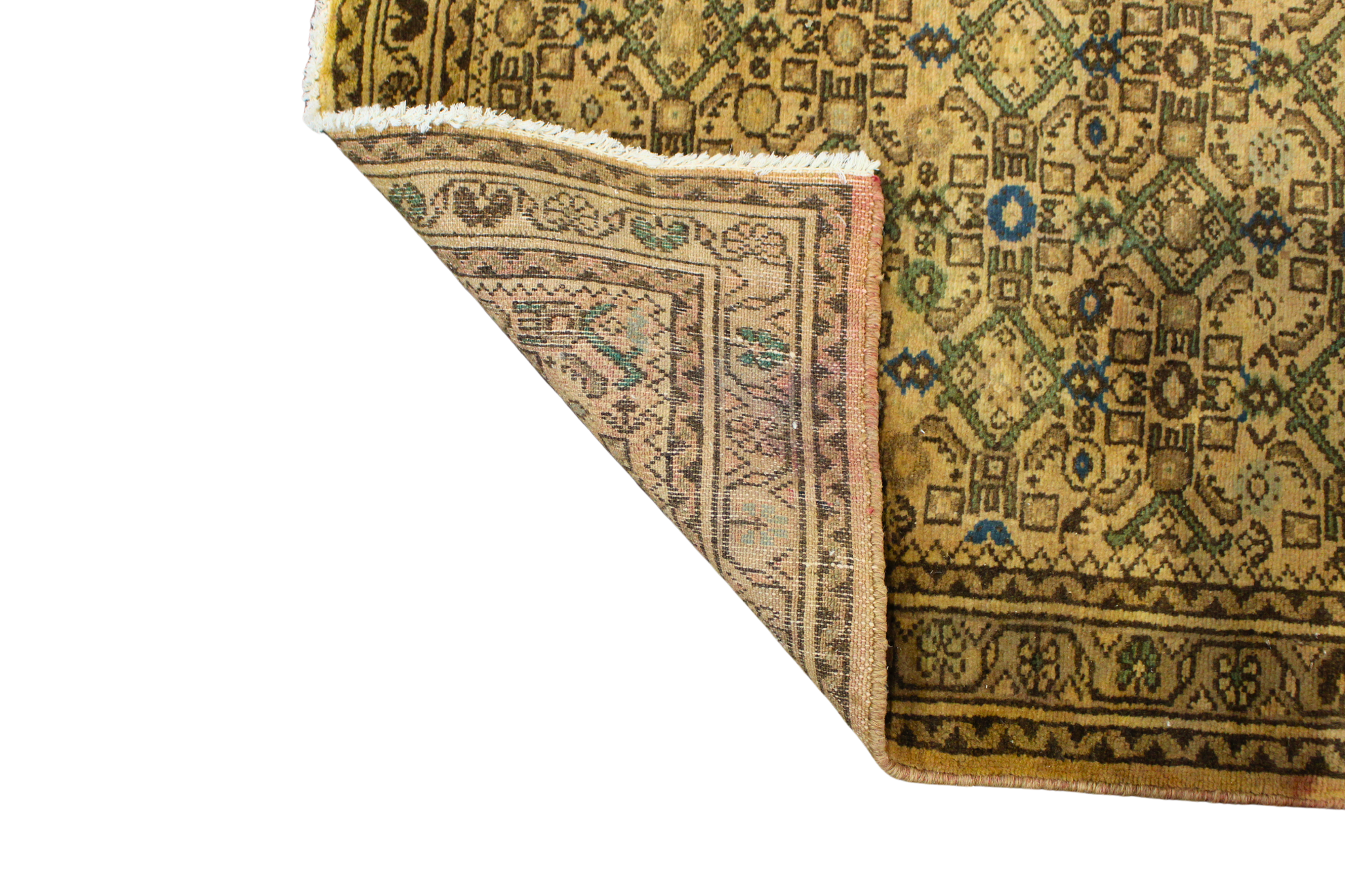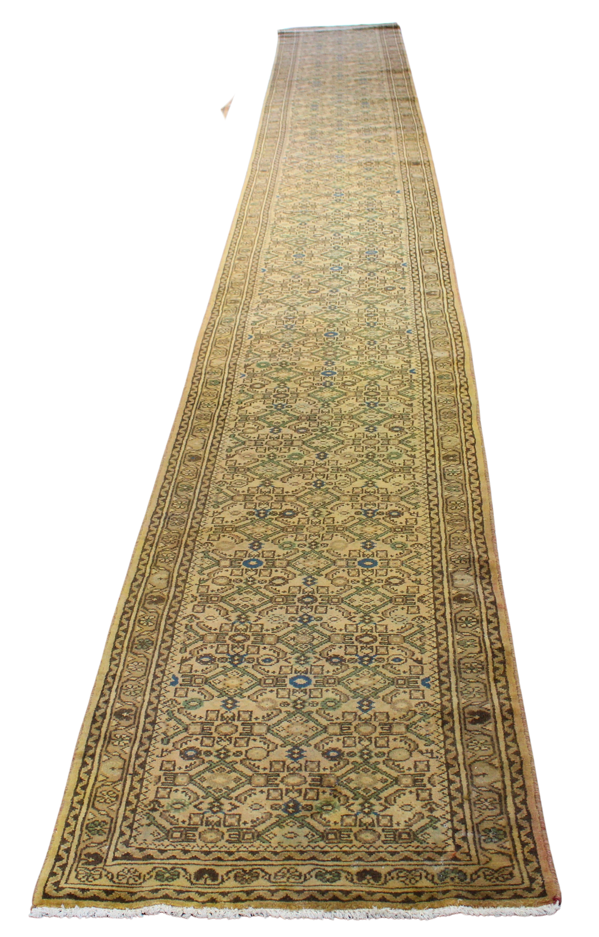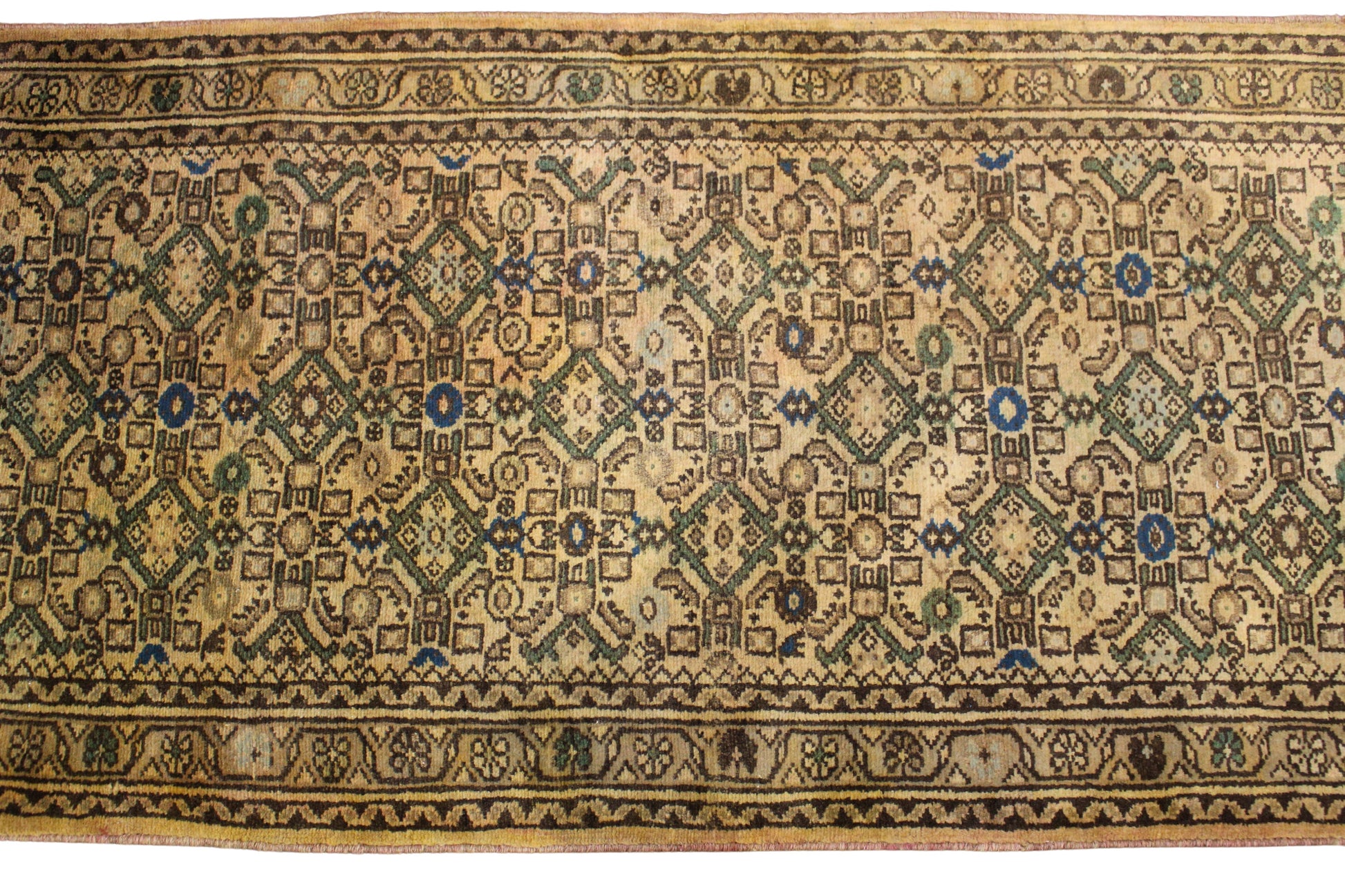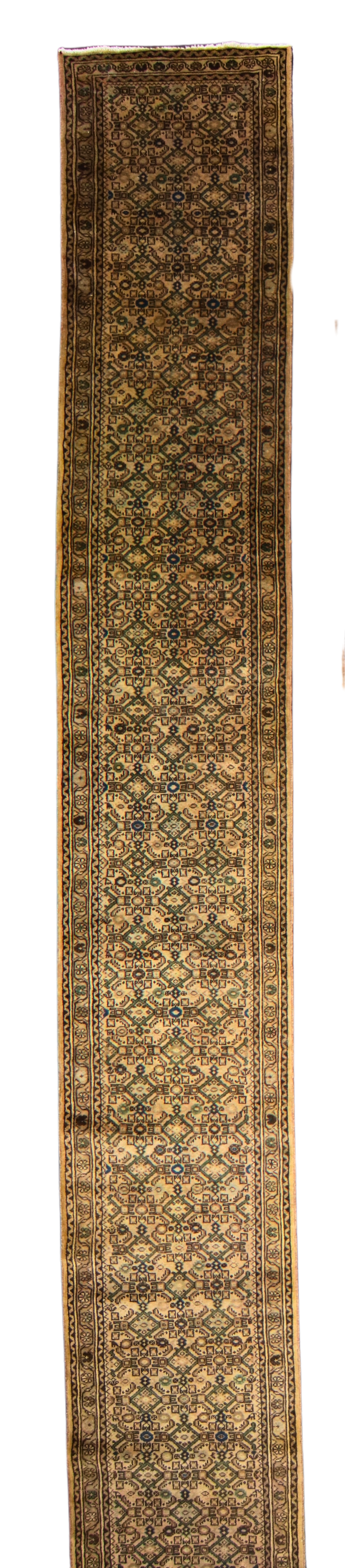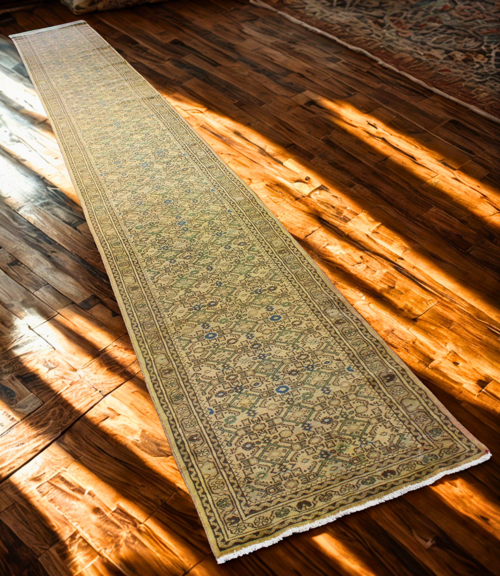 With commanding length and a delicately rendered pattern, this antique Persian Hamedan runner (2.8 × 22.4 ft) exemplifies the durability and elegance of village weaving traditions. The intricate, small-scale diamond and latticework pattern repeats with precision, framed by narrow guard borders and stylized floral elements. Deep indigo accents punctuate a subdued canvas of warm beige, olive, soft saffron, and walnut tones — a palette that blends seamlessly with both classic and modern interiors.