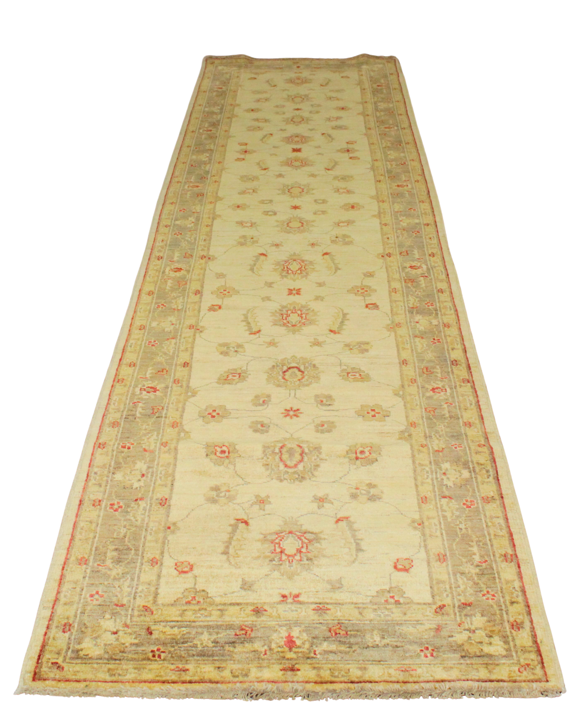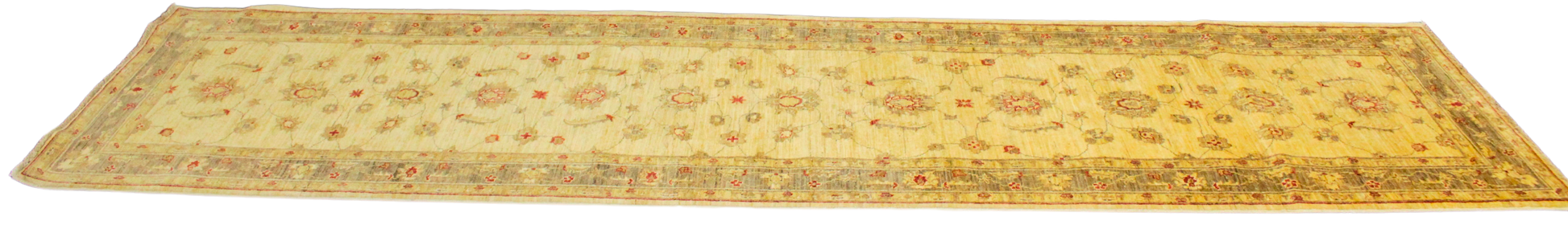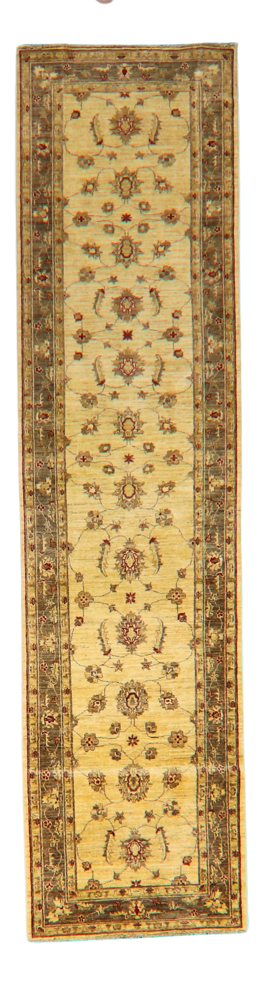 Elegant and refined, this Afghan Oushak runner features a soft parchment field with a stately arrangement of scrolling floral motifs and palmettes in muted terracotta, sage green, and soft cocoa. The wide sage border frames the composition with a classic rhythm, enhancing the formal beauty of the piece while maintaining a relaxed, earthy tone. Its graceful symmetry and inviting palette make it a natural fit for transitional or traditional spaces.