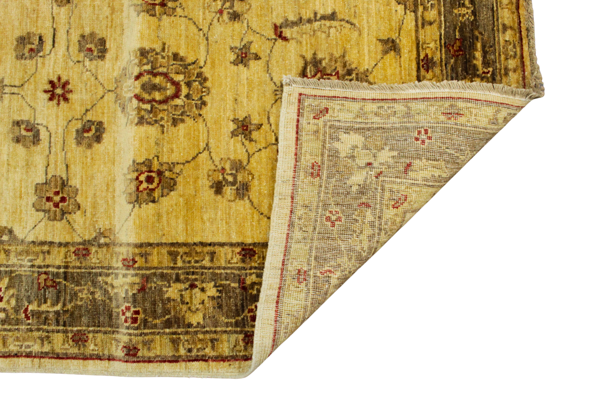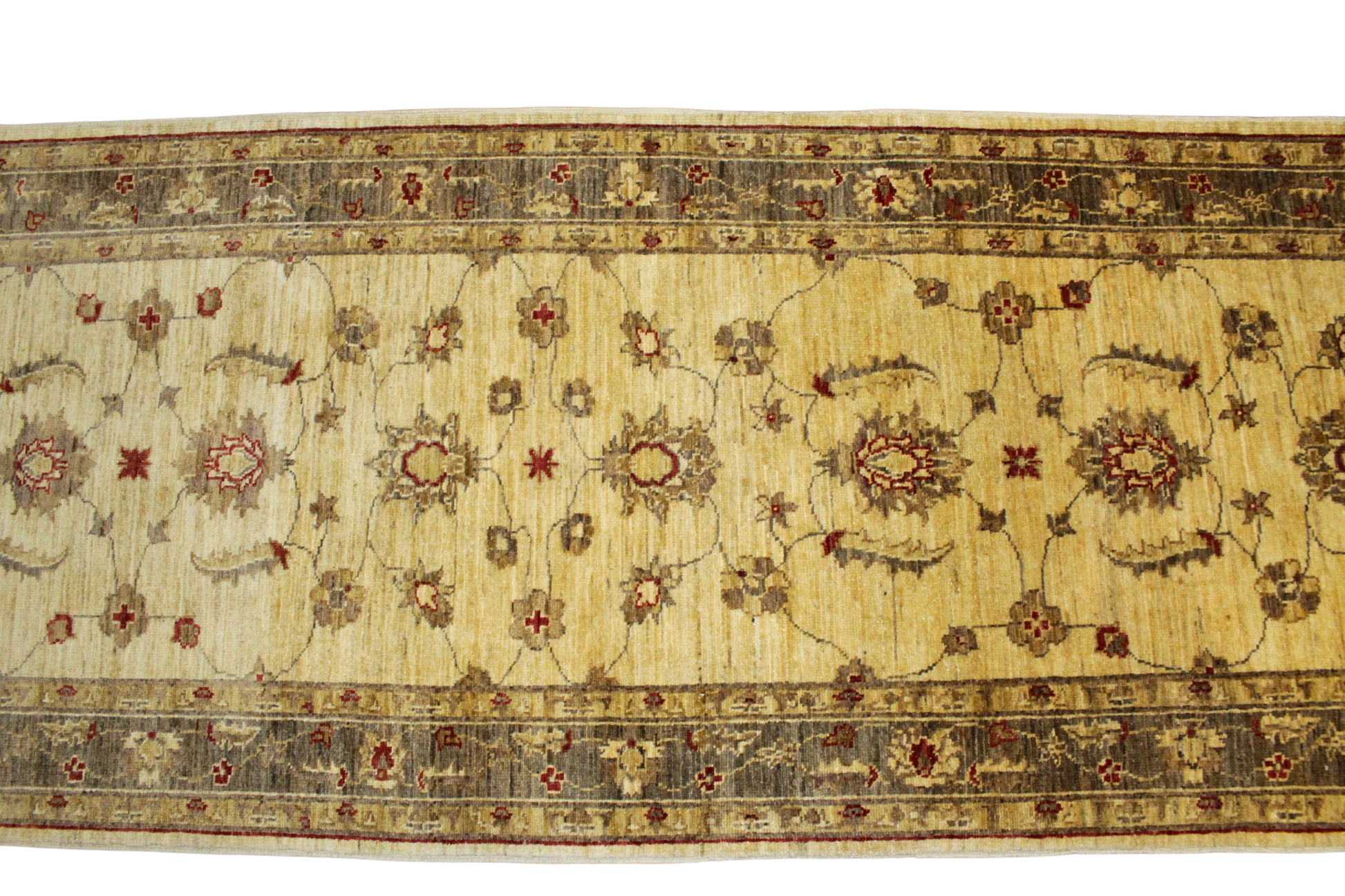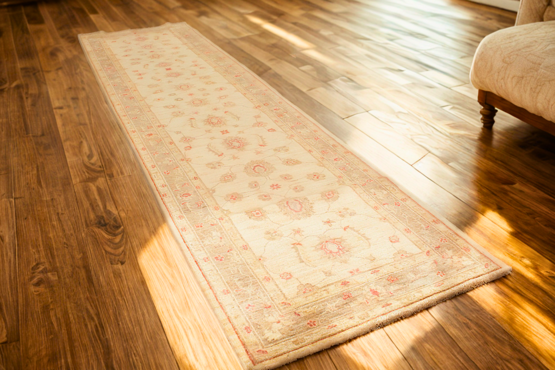 Elegant and refined, this Afghan Oushak runner features a soft parchment field with a stately arrangement of scrolling floral motifs and palmettes in muted terracotta, sage green, and soft cocoa. The wide sage border frames the composition with a classic rhythm, enhancing the formal beauty of the piece while maintaining a relaxed, earthy tone. Its graceful symmetry and inviting palette make it a natural fit for transitional or traditional spaces.