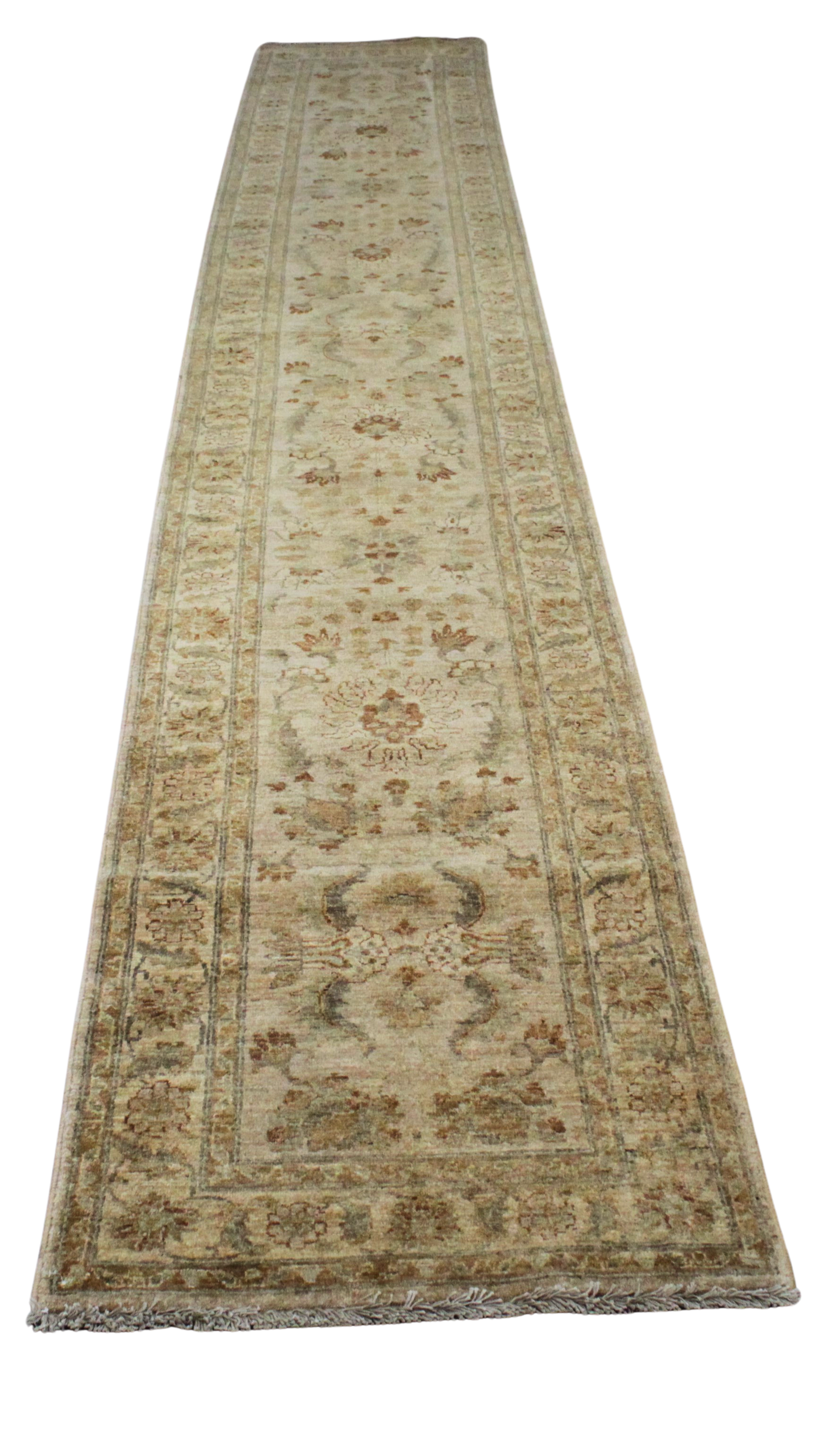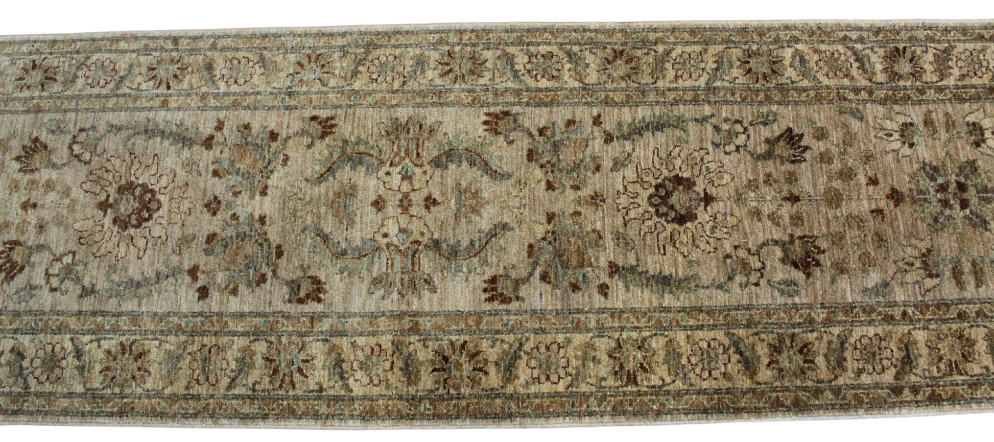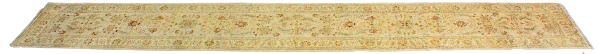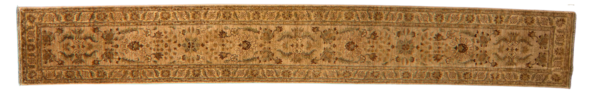 Rich and stately, this Pakistani Oushak runner brings warmth and structure with its deep walnut-toned field, filled with scrolling botanical motifs in soft moss, clay, and golden beige. The expansive length is perfect for anchoring long corridors or gallery-style walkways, while the tightly rendered florals and decorative border lend it an heirloom feel. The palette is earthy and timeless, making it a natural complement to wood floors and traditional interiors.