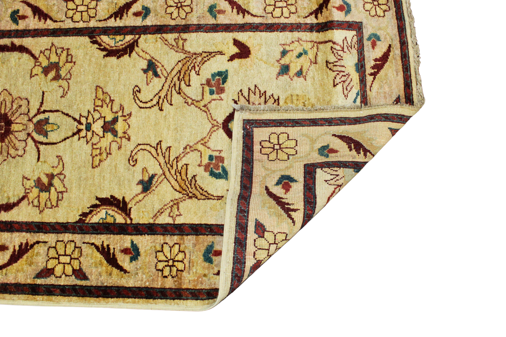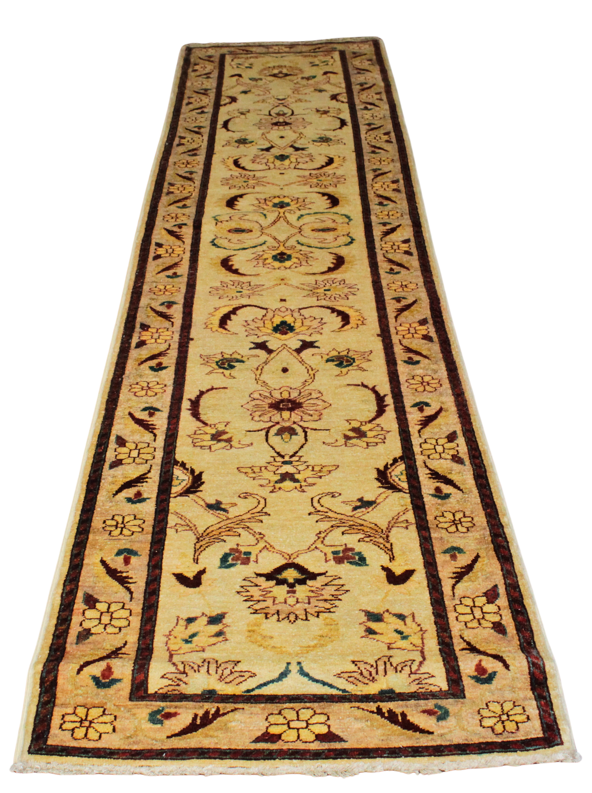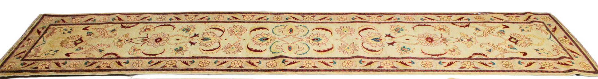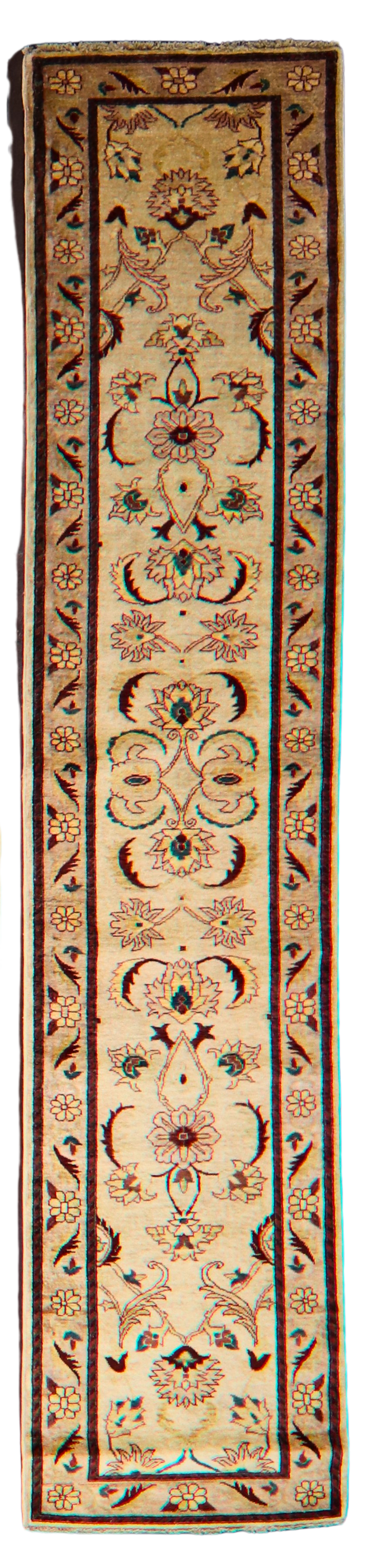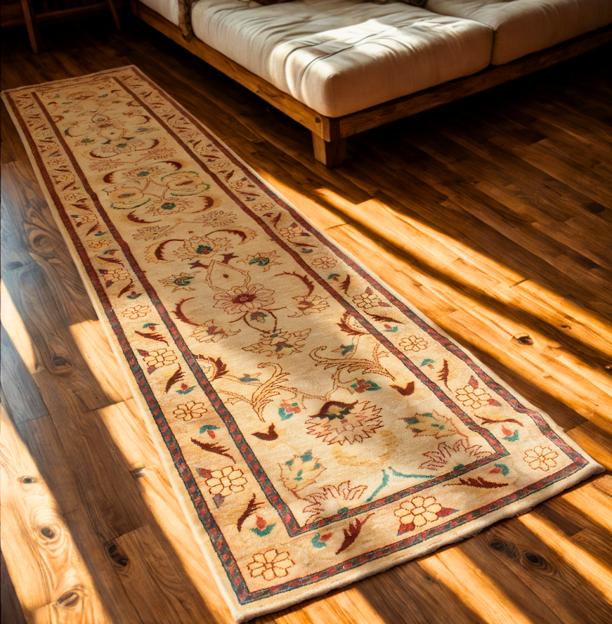 Light and graceful, this Pakistani Oushak runner features a pale ivory field adorned with flowing botanical scrolls and stylized floral medallions. The composition moves in rhythmic symmetry, softened by gentle accents of rosewood, soft teal, and walnut brown. A slender floral border frames the piece with understated charm, making it an ideal choice for interiors seeking brightness and elegance without overpowering color.
