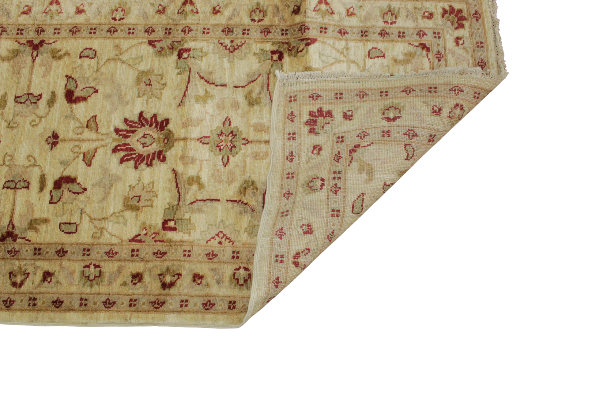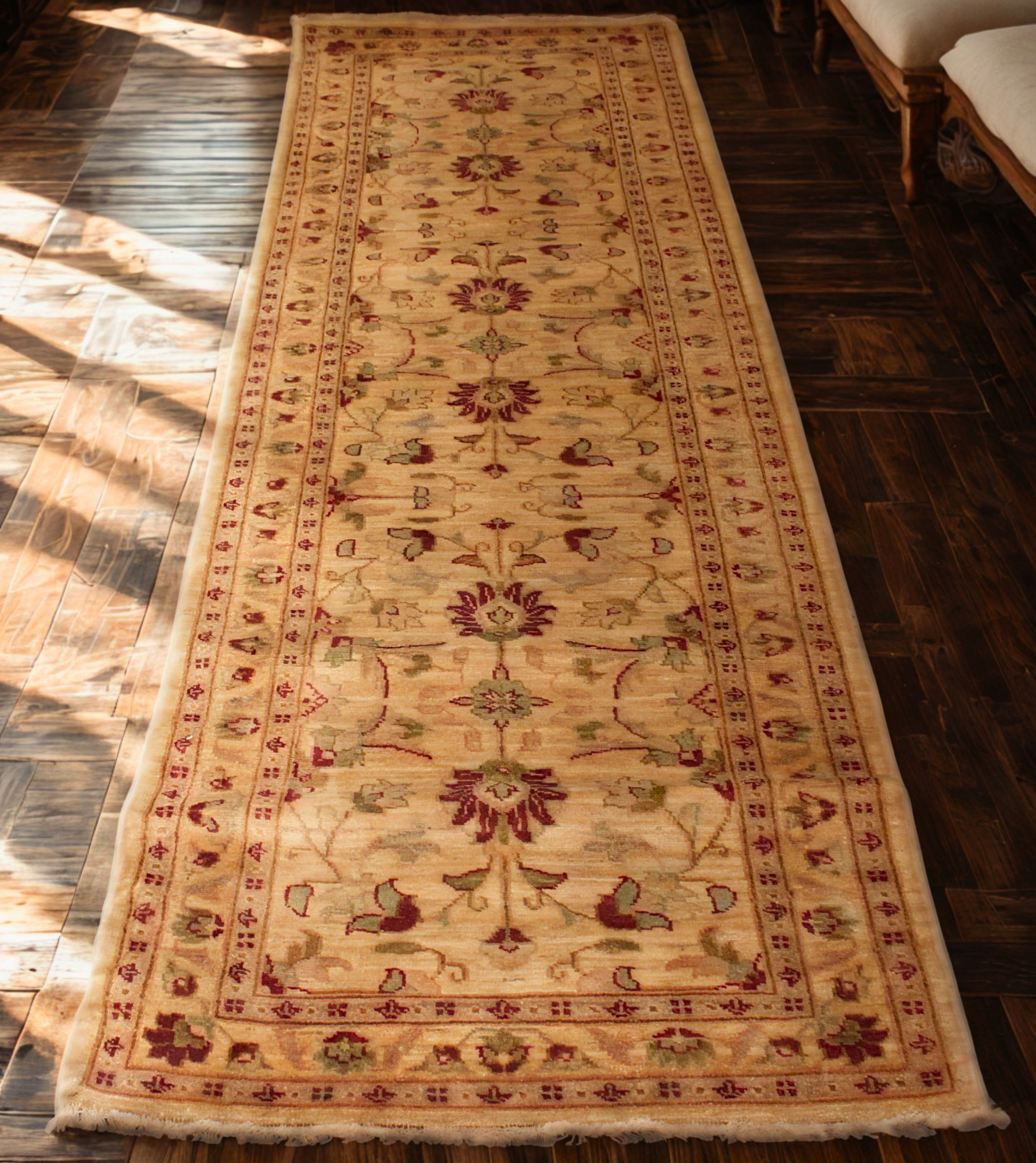 This graceful Pakistani Oushak runner pairs an elegant ivory field with a delicate allover floral design. Rich garnet blossoms and muted sage vines unfurl symmetrically across the surface, anchored by a stylized star-flower center motif. The classic Oushak border enhances its formal appeal, making this a refined addition to transitional or traditional interiors.