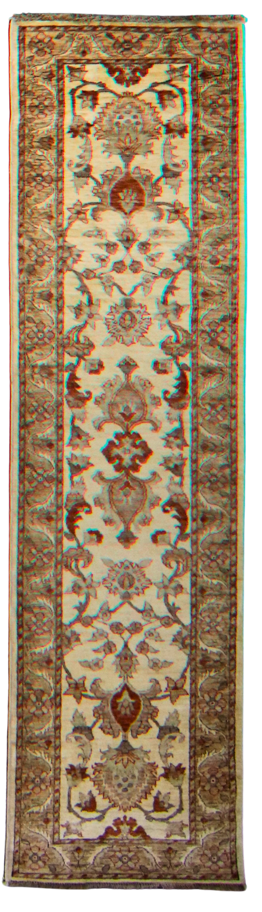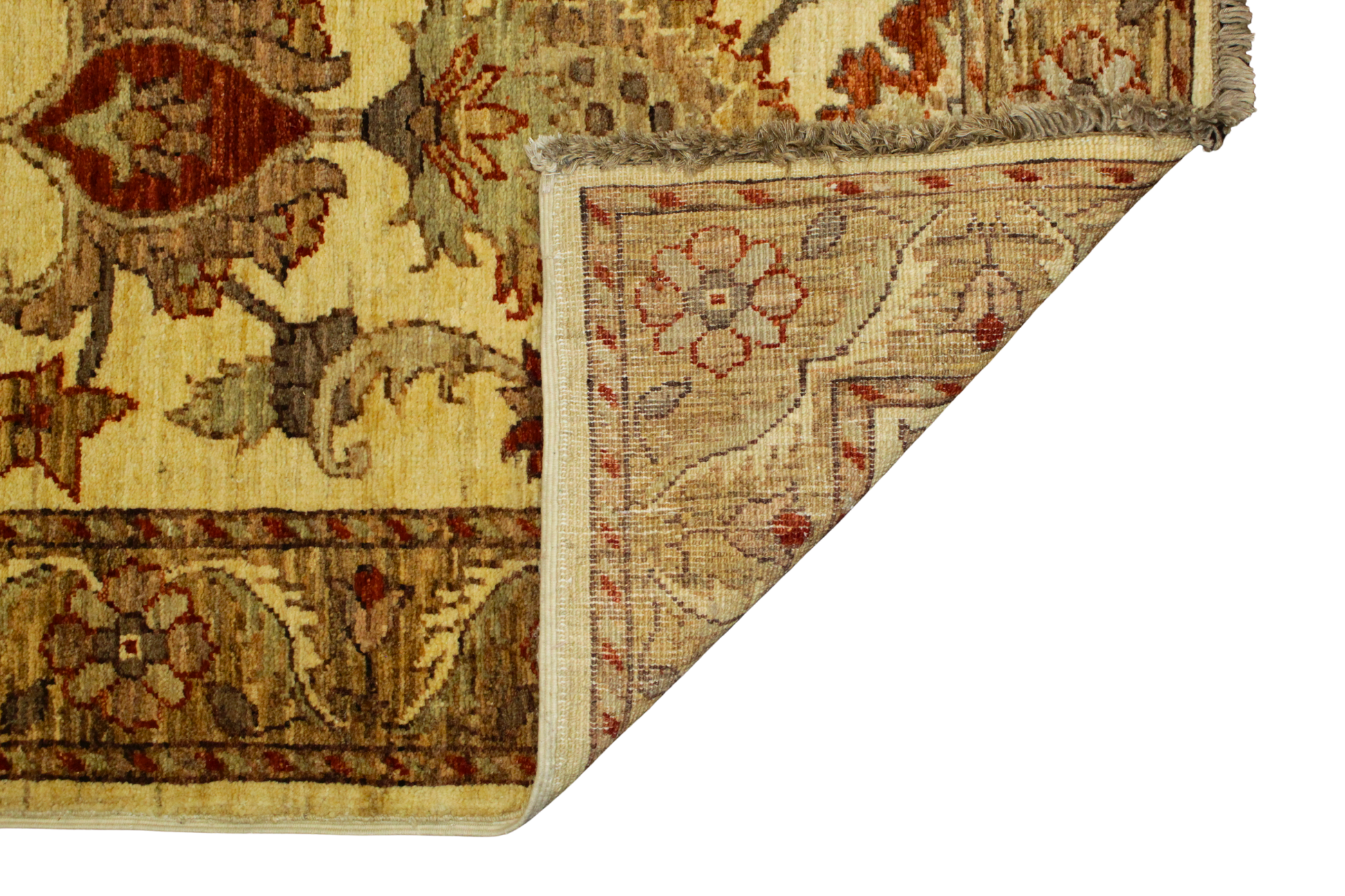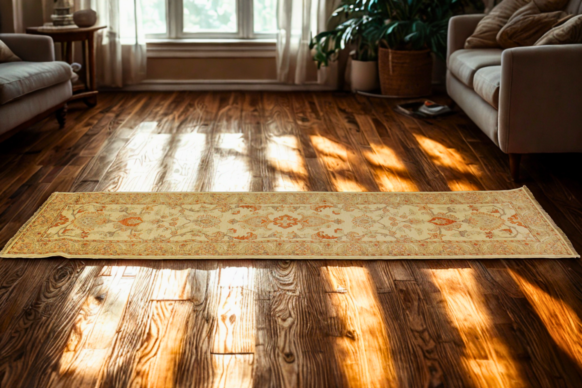 This Pakistani Oushak runner features a majestic scrolling vine and palmette design on a warm ivory ground, anchored by a finely drawn floral border in earthy sage and rust tones. The bold central motifs stand out with a classical grace, reminiscent of Ottoman-era influences, offering both tradition and visual impact.