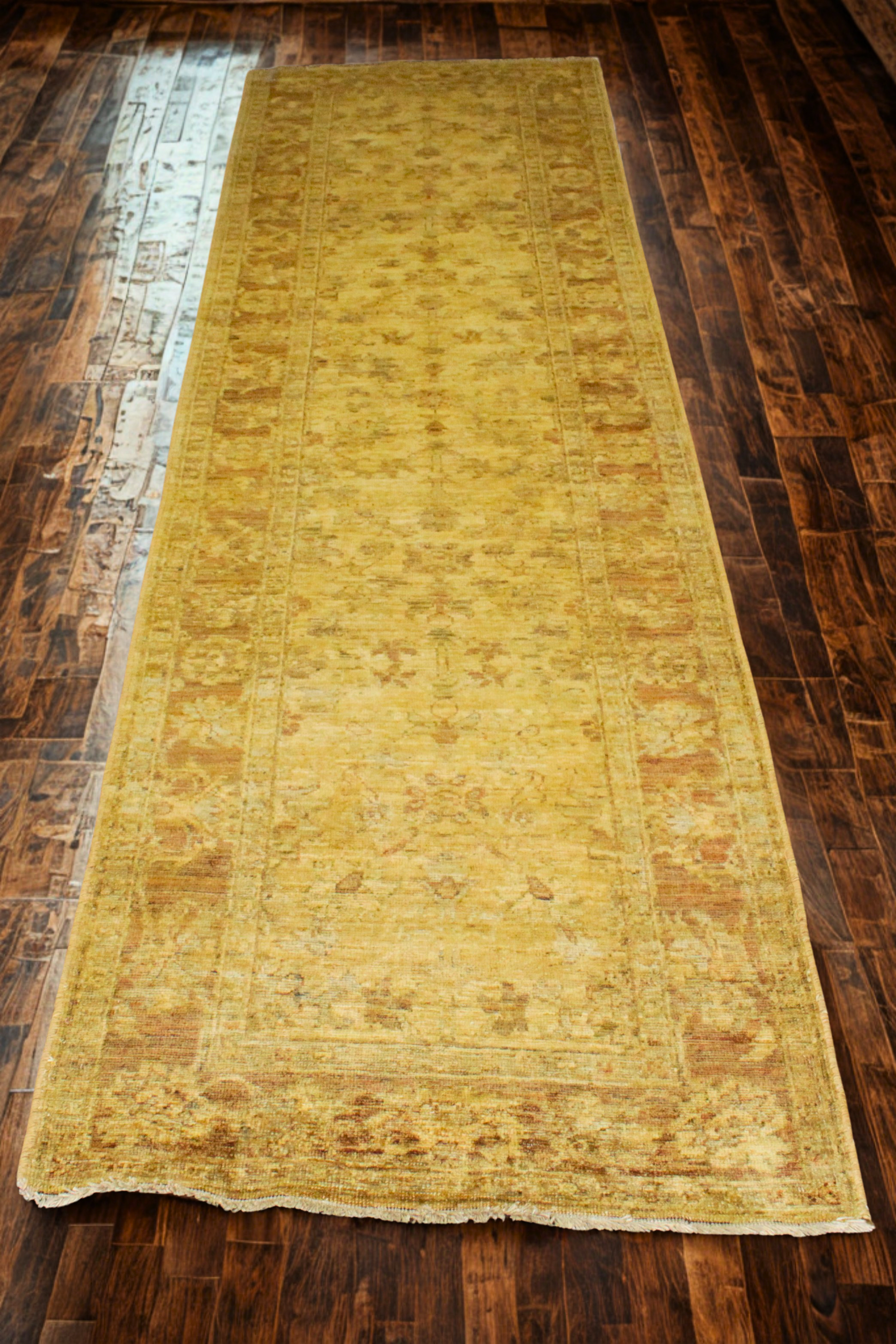 With a subtle, sun-faded elegance, this Pakistani Oushak runner features a monochromatic palette of golden sand and muted copper. The low-contrast floral medallions and border motifs are gently worn, giving it a vintage patina that feels at once grounded and refined. It’s the kind of piece that complements natural wood tones, stone floors, and minimalist interiors with quiet luxury.