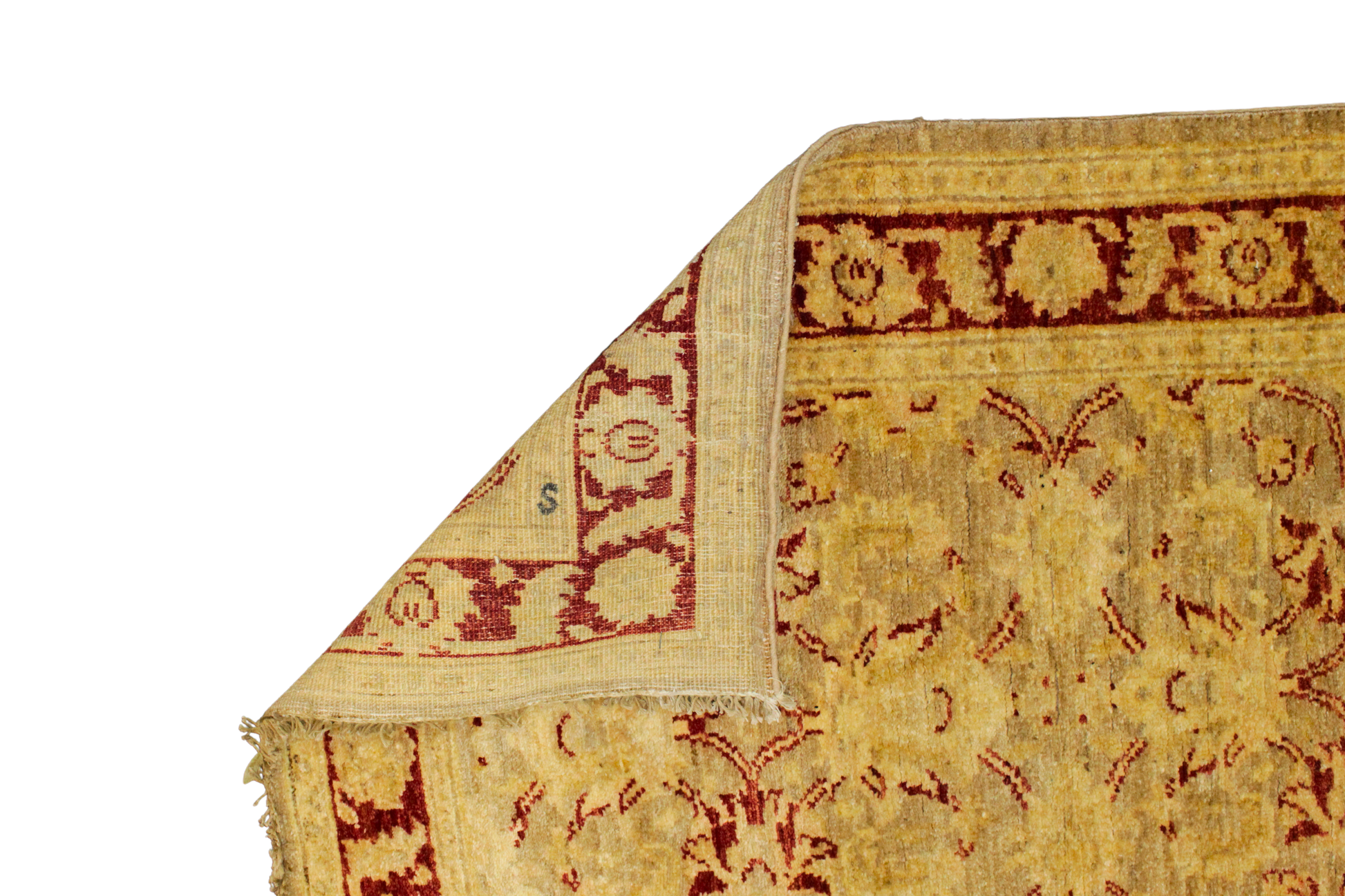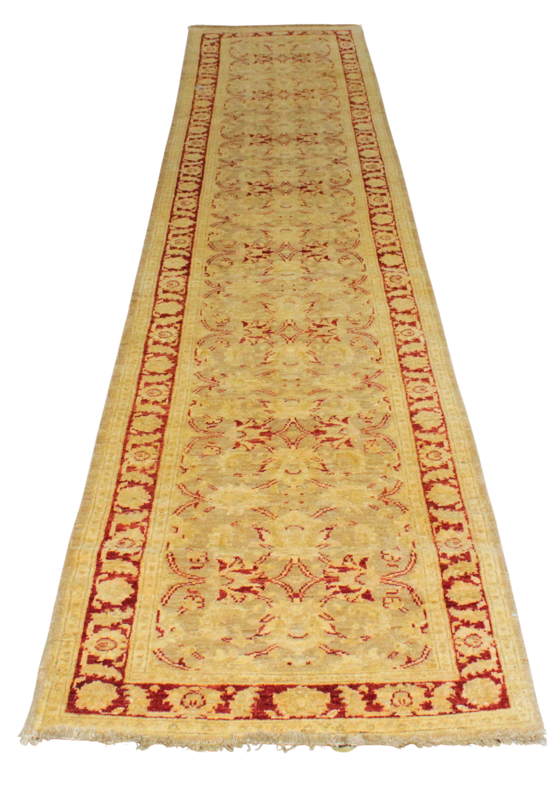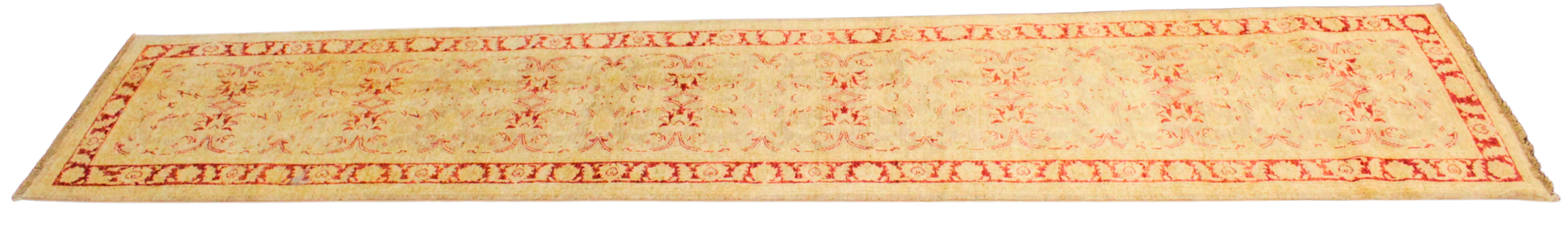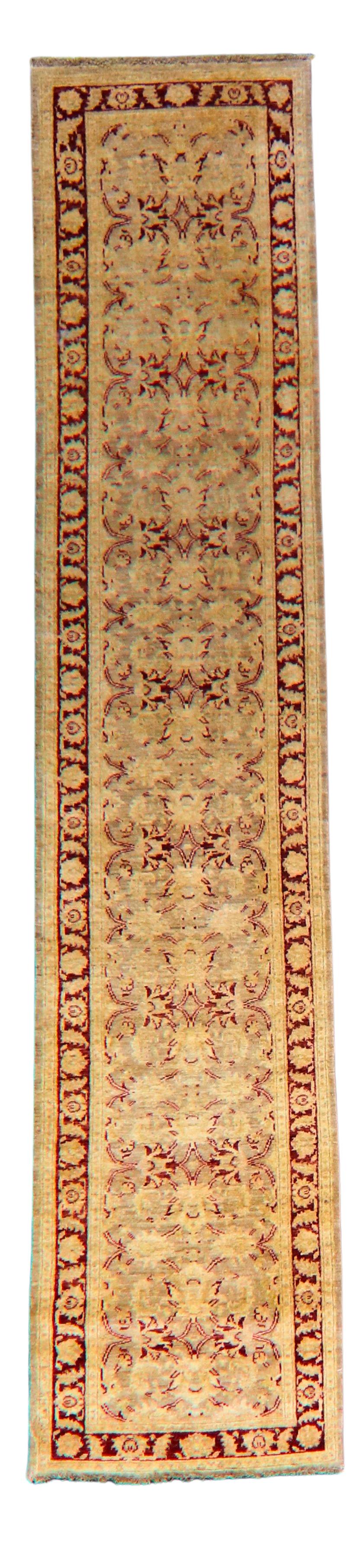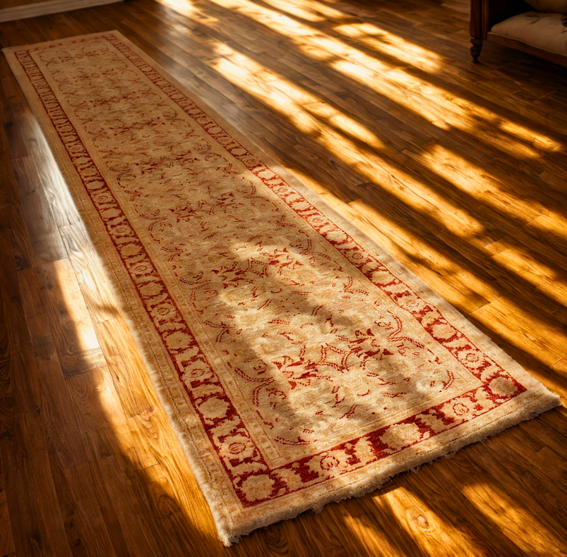 A serene, symmetrical composition defines this long Oushak runner, hand-knotted in Pakistan. The soft beige field is accented with pale taupe and warm rust floral scrollwork, creating a gently worn, antique look. Framed by a traditional border of rosette medallions, this piece exudes quiet elegance, making it a versatile choice for transitional or contemporary interiors.