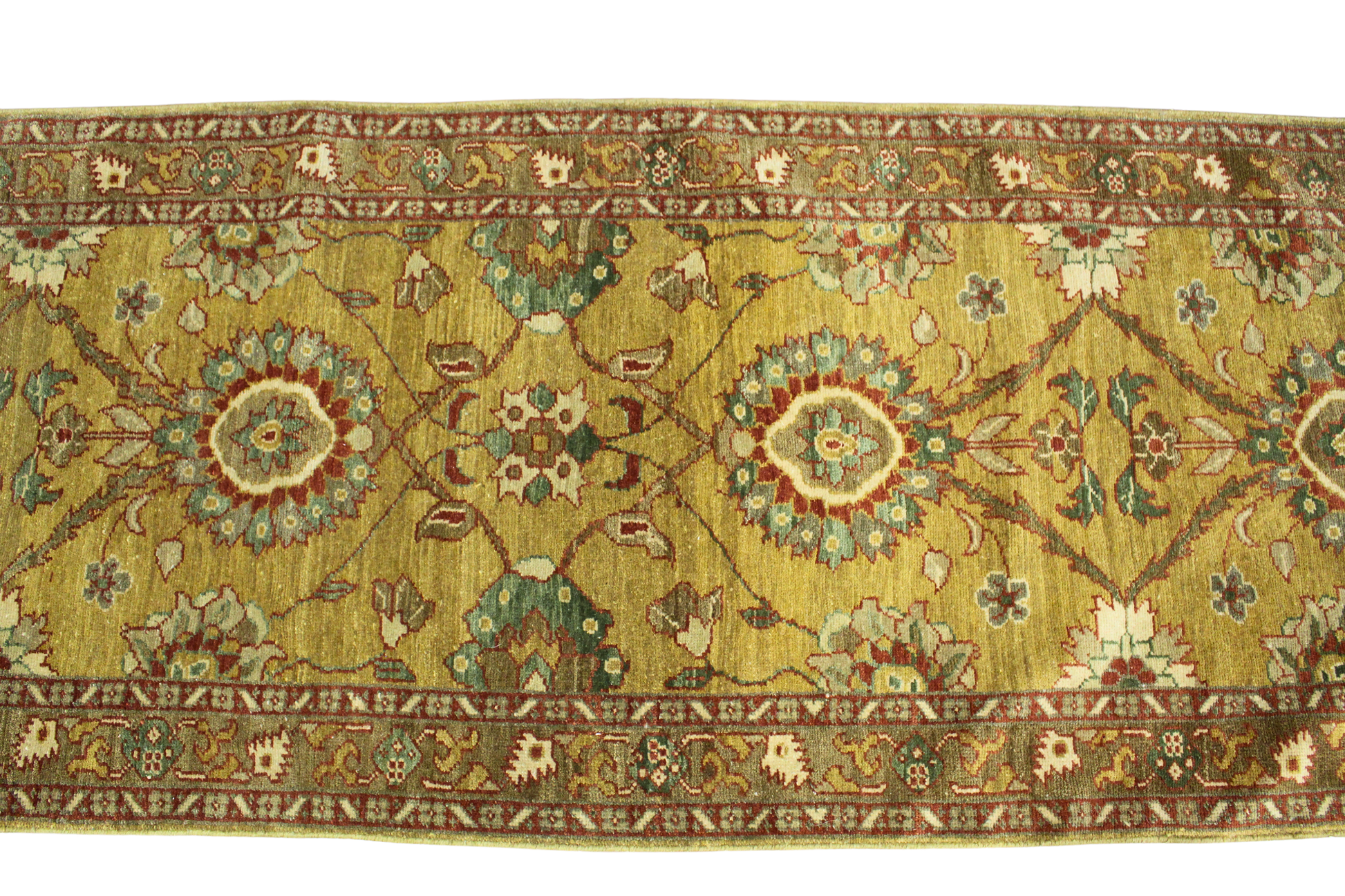 Understated yet luxurious, this Oushak runner from Turkey (2.11 × 14 ft) exudes the quiet elegance and spacious design that Oushak rugs are renowned for. Woven in a golden saffron field, the runner is adorned with a softly drawn pattern of medallions, leafy vines, and stylized floral motifs in subdued tones of sage, ivory, terra cotta, and pale blue.
