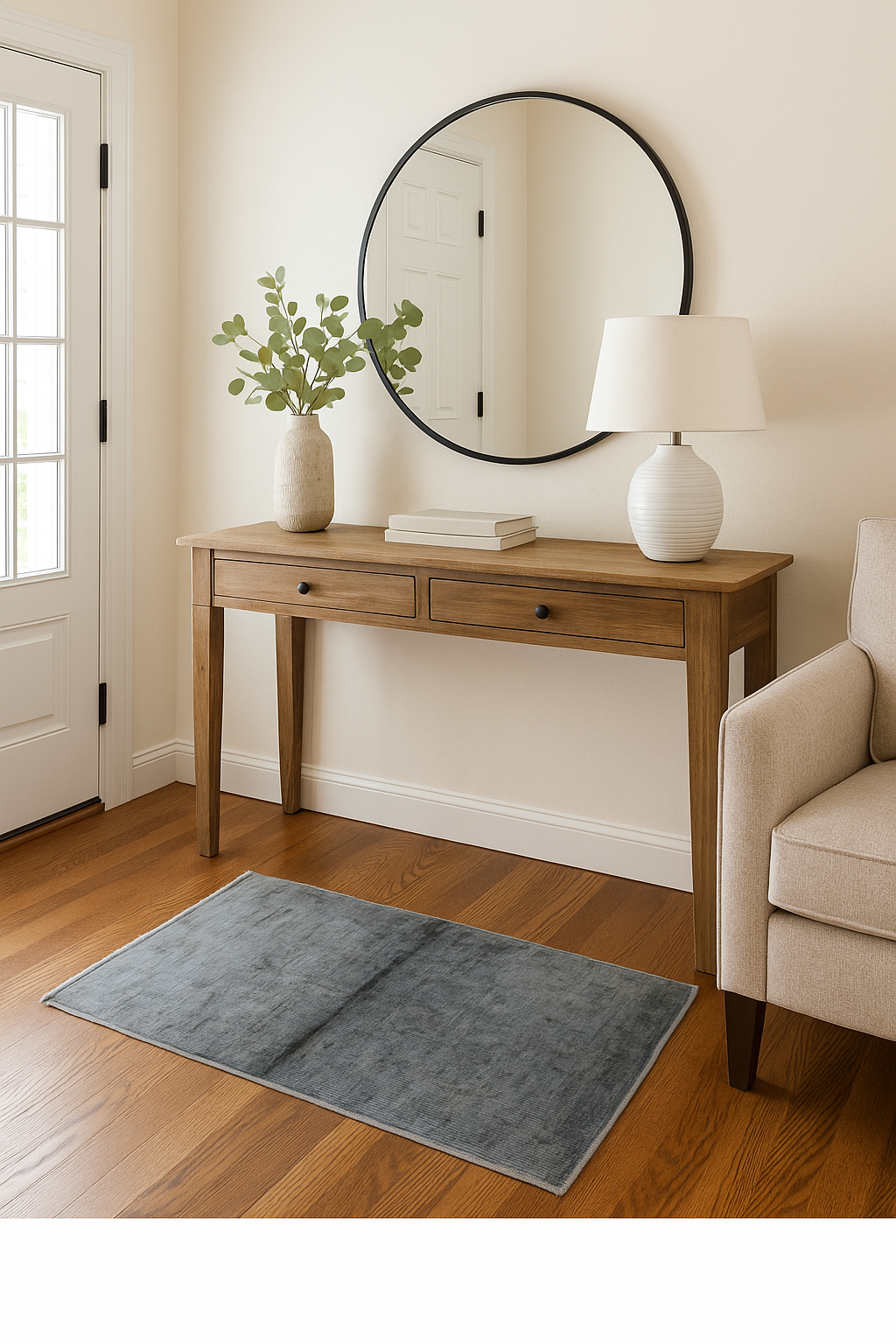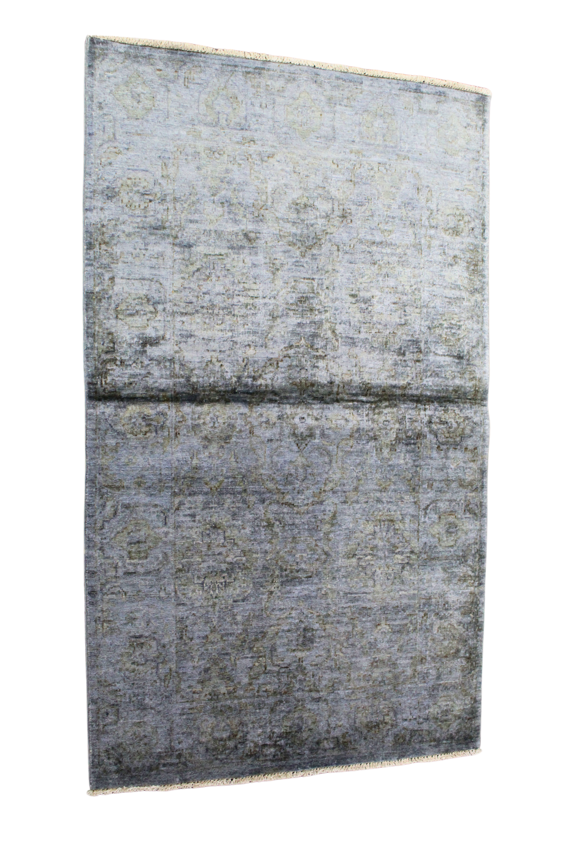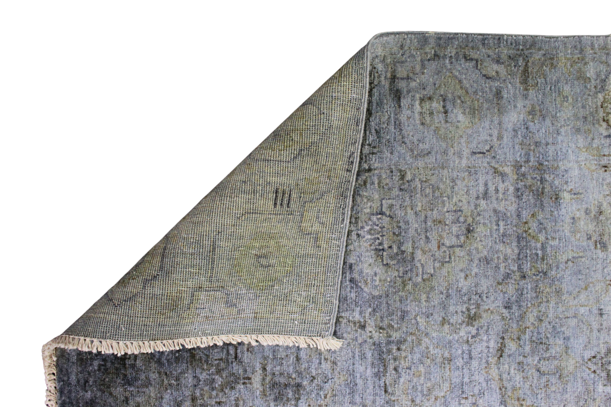Hand-knotted in Afghanistan, this modern wool rug features a smoky steel blue base with subtle tonal patterning, giving it a beautifully aged, lived-in feel without losing its clean-lined charm. Its faded finish brings a sense of calm and organic texture to the room, effortlessly grounding entryways, bathrooms, or the side of a bed.