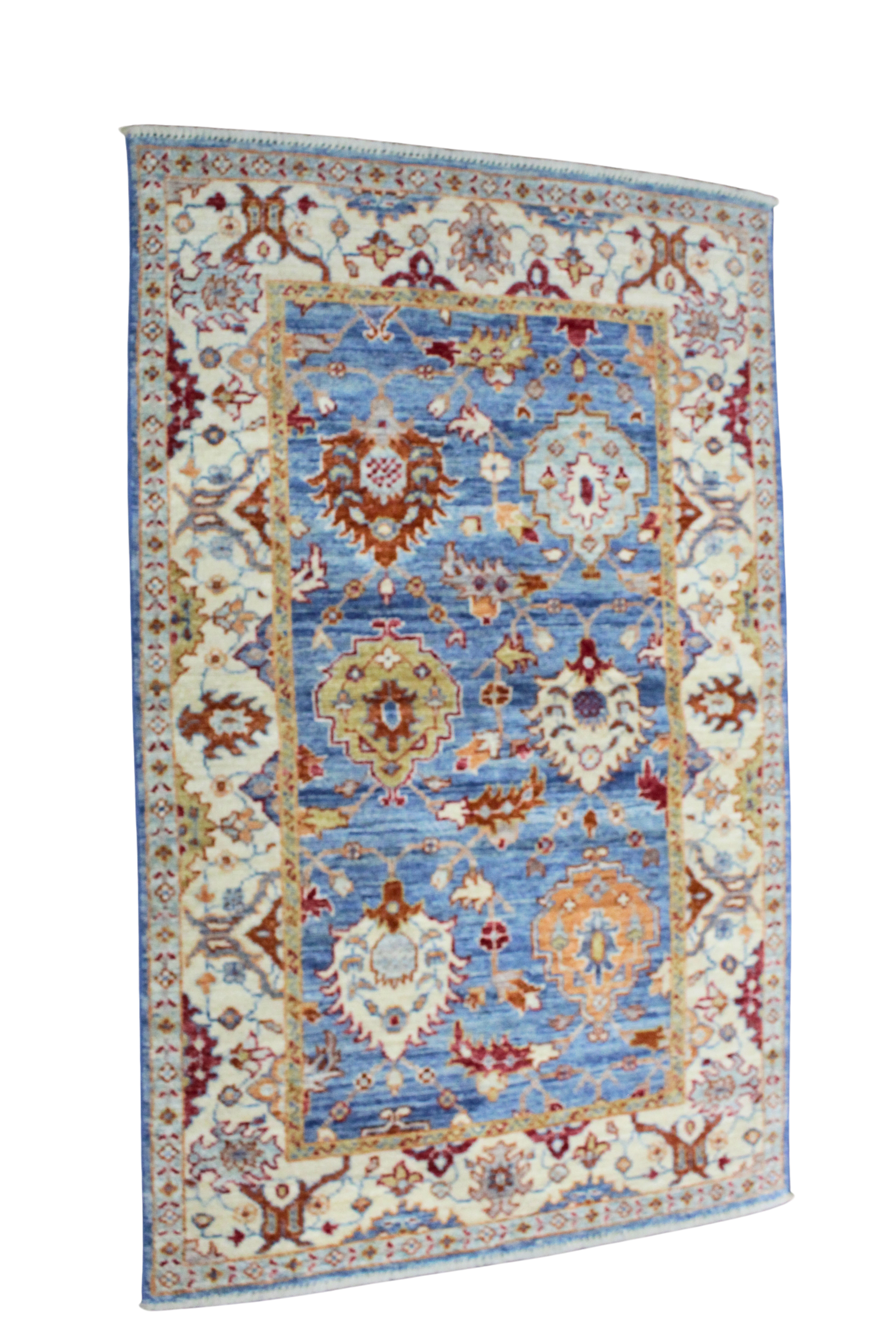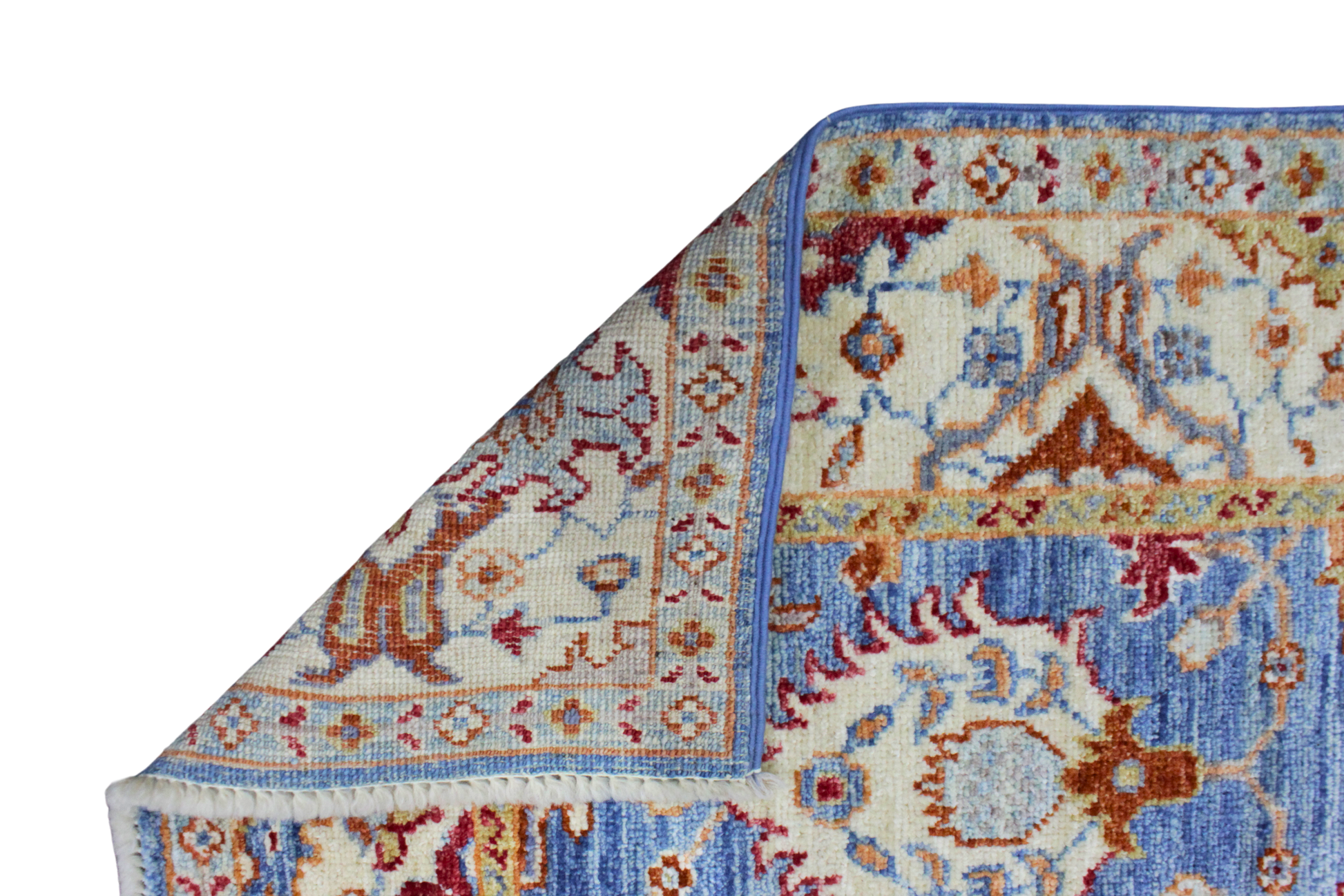 Showcasing a dazzling palette of royal blue, soft ivory, golden saffron, and terracotta, this hand-knotted Mahal design features bold, oversized medallions and stylized floral motifs framed by a traditional border. The contrast between the vibrant field and the intricate border creates a visually captivating centerpiece for small spaces.