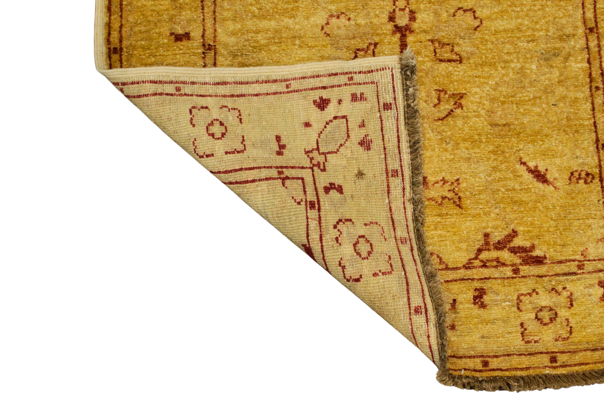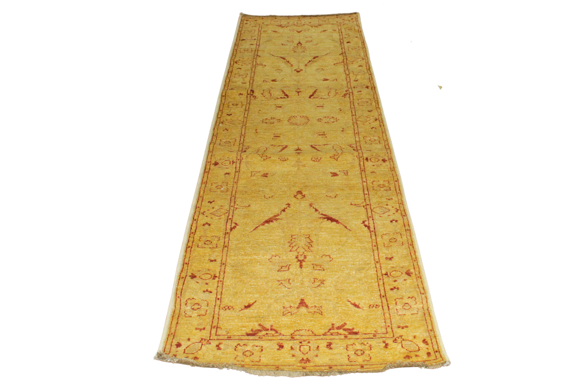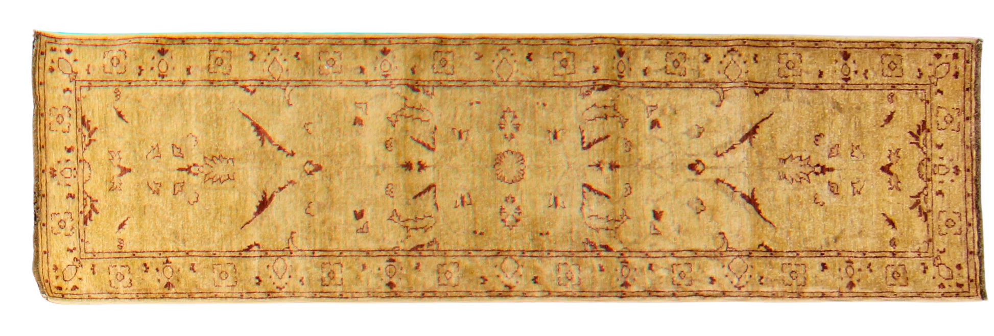 Understated and elegant, this hand-knotted Pakistani Oushak runner glows in warm tones of golden beige and soft brown. The minimalist floral motifs float delicately across the field, giving the piece a light and breathable aesthetic. Subtle abrash adds gentle character, while the narrow rosette border completes the look with symmetry and grace.