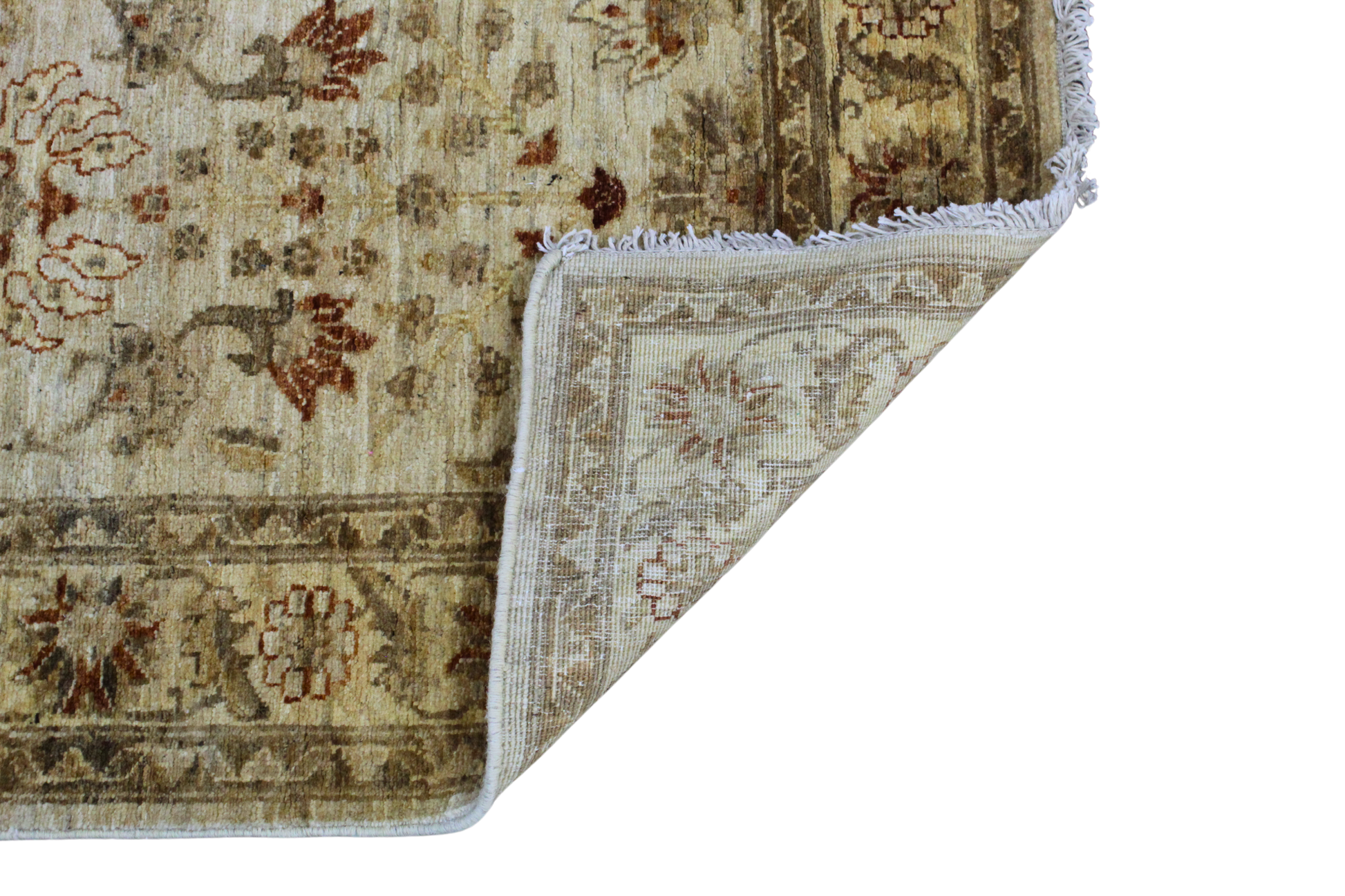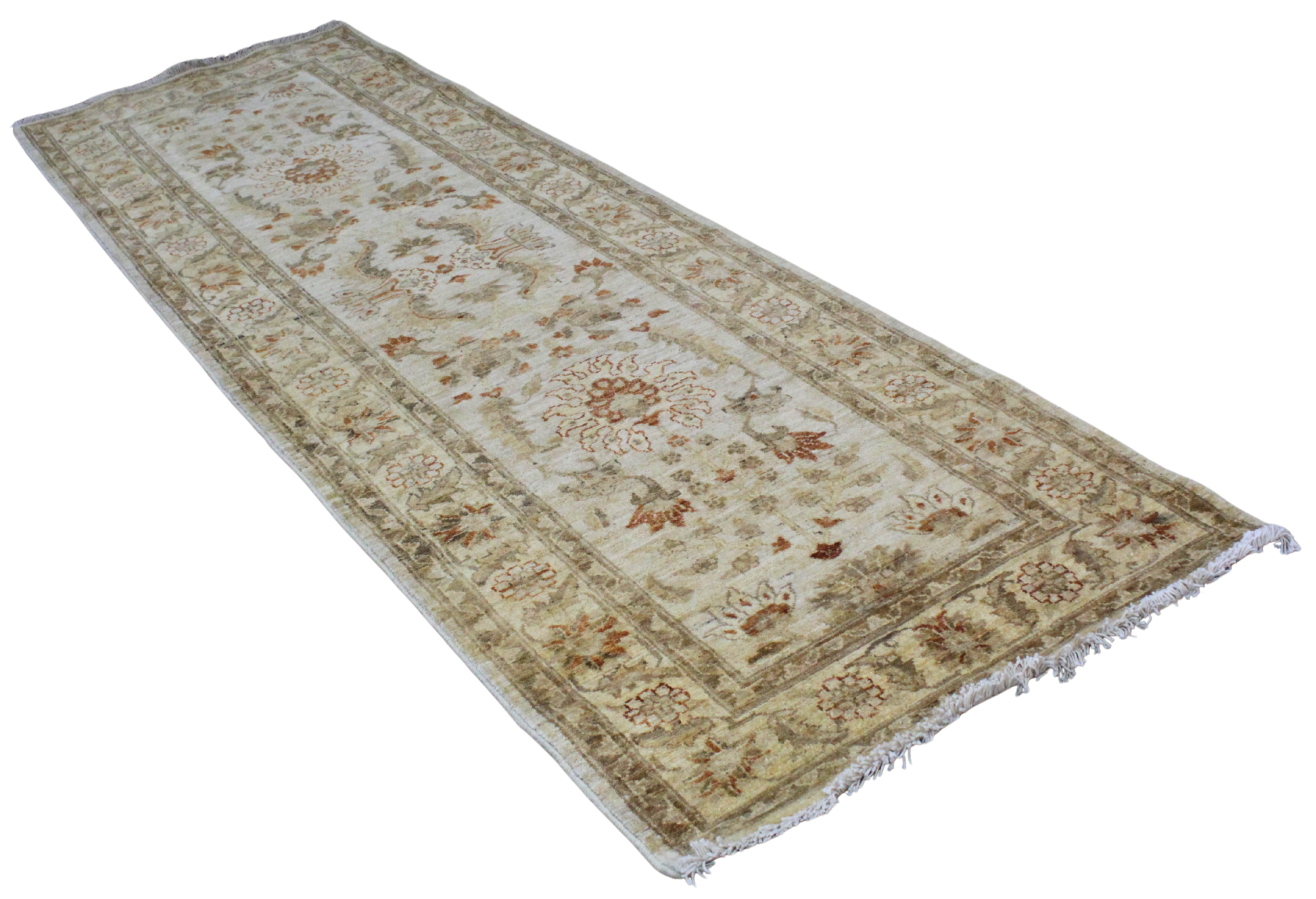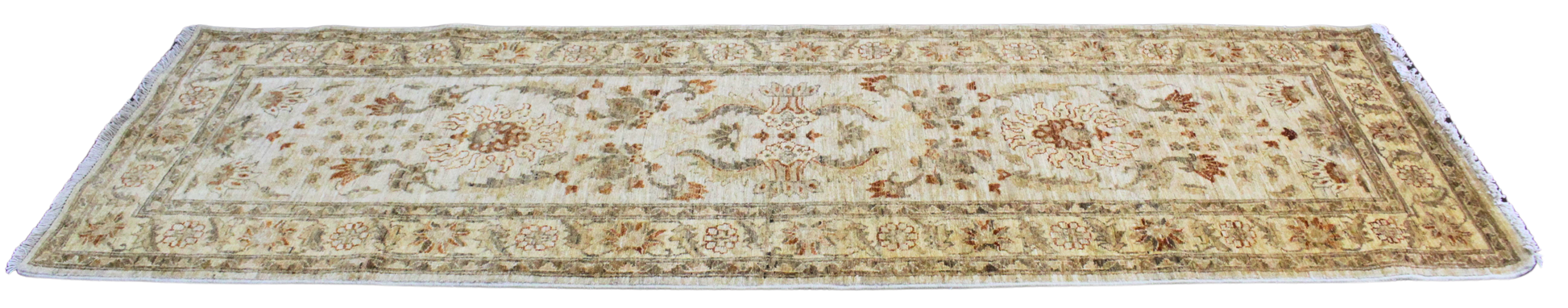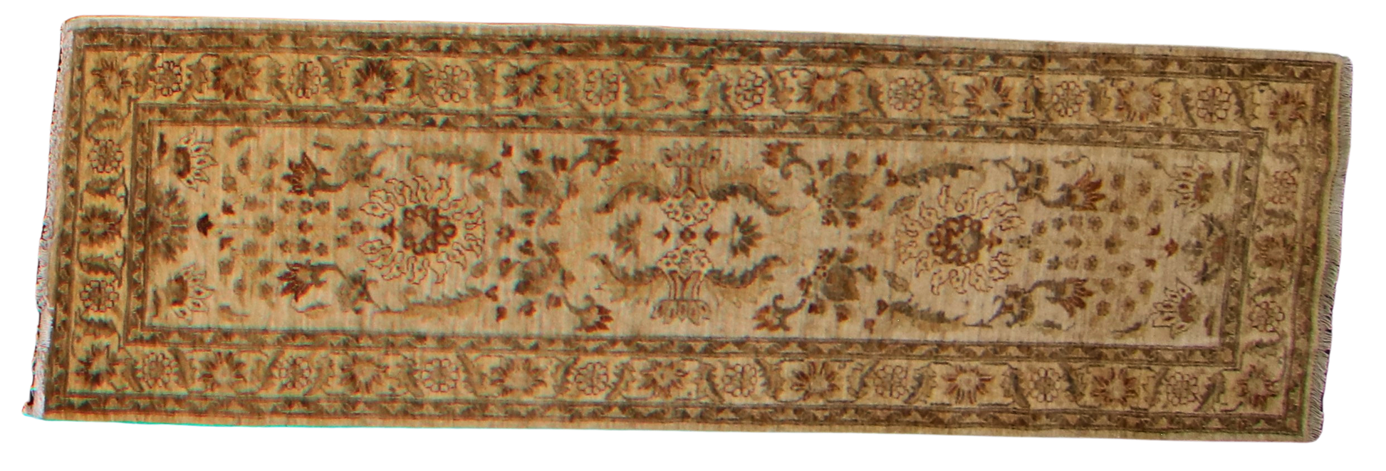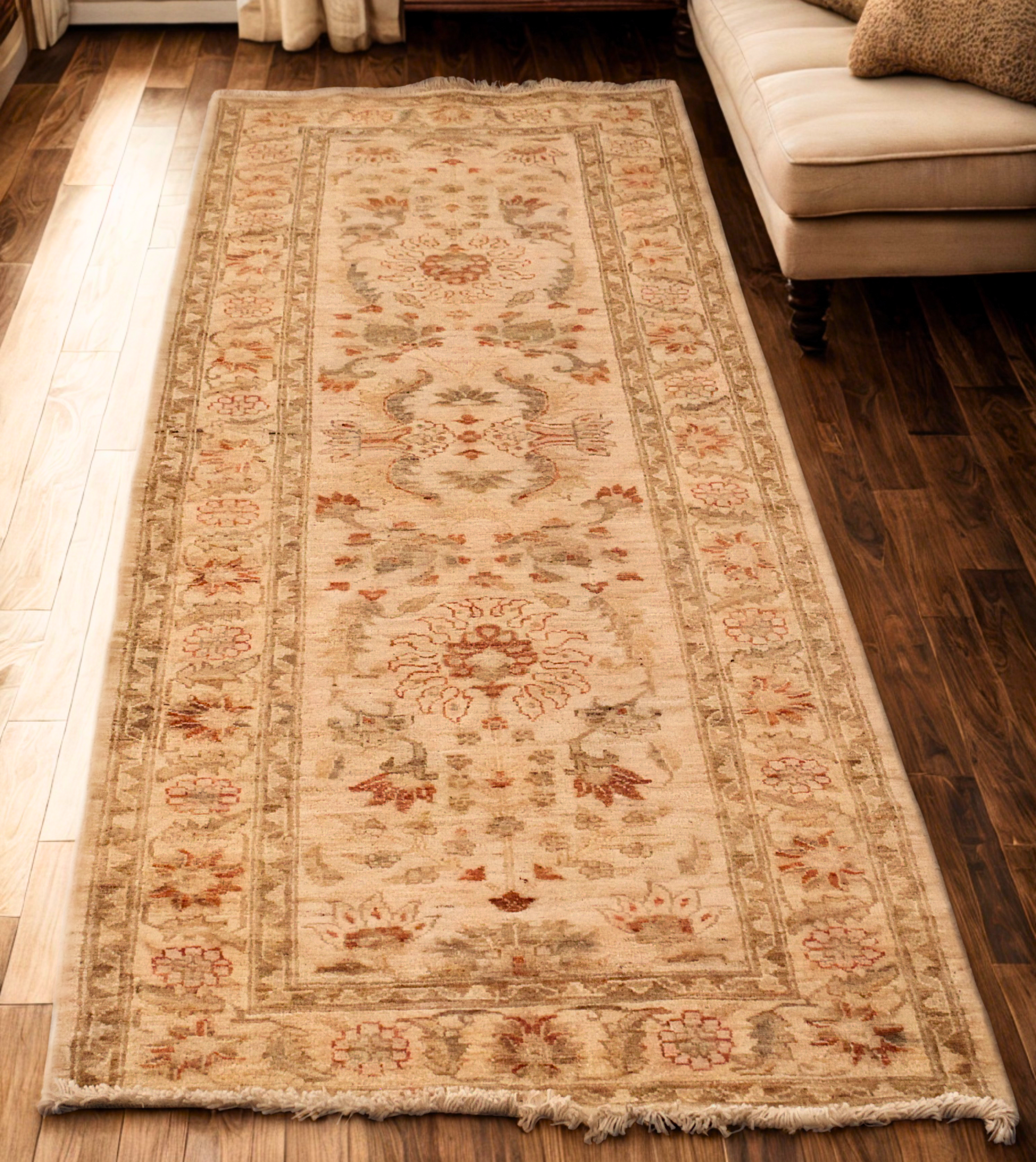 Warm and welcoming, this Pakistani Oushak runner weaves together classic floral motifs with a time-softened golden tan palette. The central medallion blooms gently into a field of scrolling vinework, anchored by a wide border that balances elegance and tradition. The muted olive, beige, and rust accents bring depth without overwhelming, making it an easy match for interiors in natural tones.